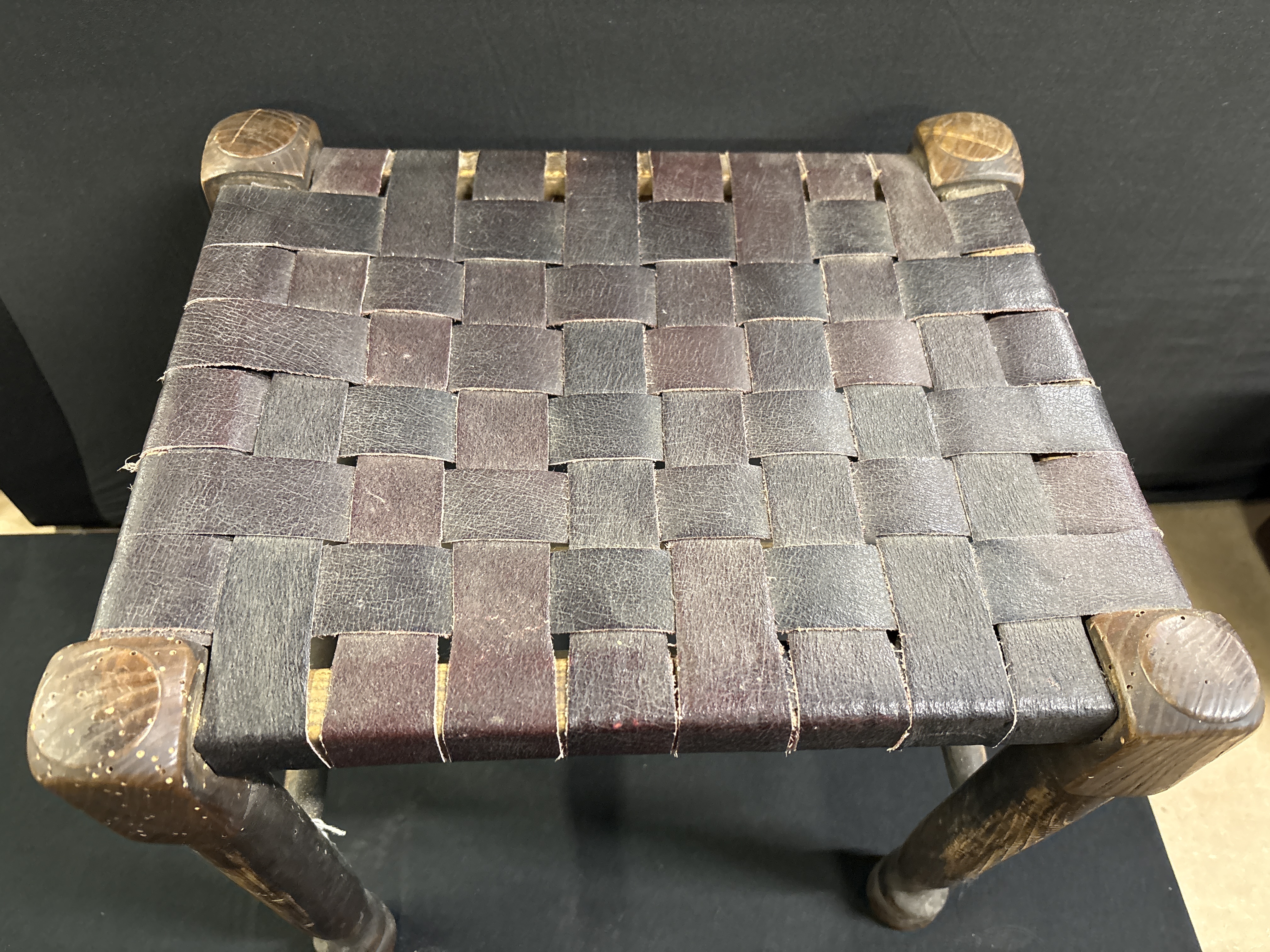 An early 20th century solid oak footstool, designed in the characteristic vernacular style associated with Robert Mouseman Thompson of Kilburn. This antique lattice leather topped stool features a rectangular seat composed of interlaced dark brown leather straps. The frame is constructed from solid oak with four robust ring-turned legs terminating in bulbous feet, all secured by a sturdy double-tiered stretcher base for added stability. The upper leg blocks are square-sectioned and surmounted by distinctive hand-carved rounded finials. The piece exhibits the honest construction and hand-finished quality typical of the English Arts and Crafts movement. 36cm x 40cm x 30cm.