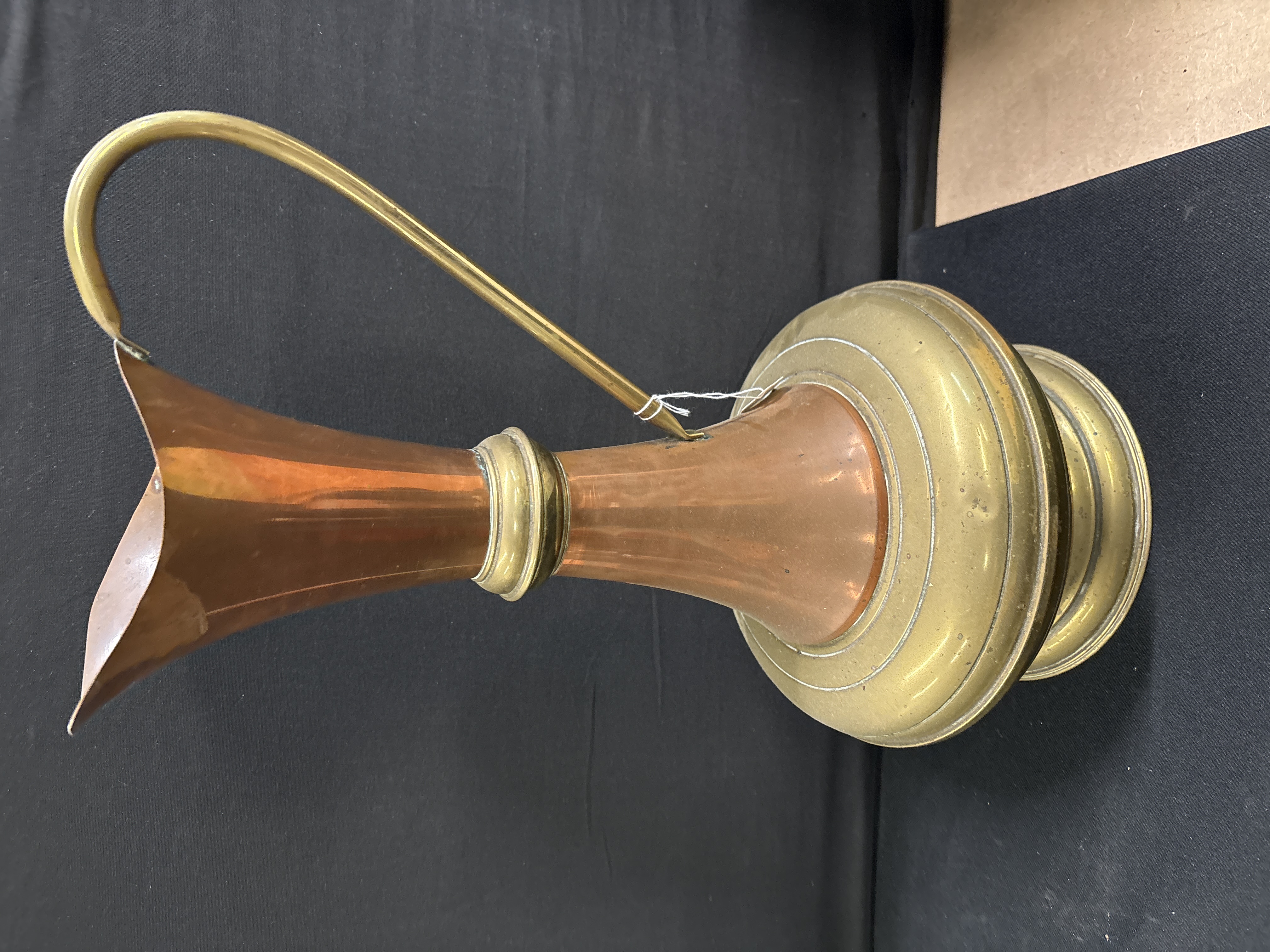 This large brass and copper ewer is a sophisticated example of late 19th-century decorative metalware, reflecting the aesthetic principles of the Arts & Crafts movement. The piece is of bi-metal construction, featuring a tapered copper body fashioned from sheet metal with a visible vertical seam. It is enhanced by contrasting brass elements, including a flared spout, a central decorative collar, and a substantial stepped circular base. A long, slender wrought brass handle completes the elegant silhouette. Although unmarked, the design and assembly are characteristic of English domestic metalware from the late Victorian period. Dimensions: Height 53 cm.