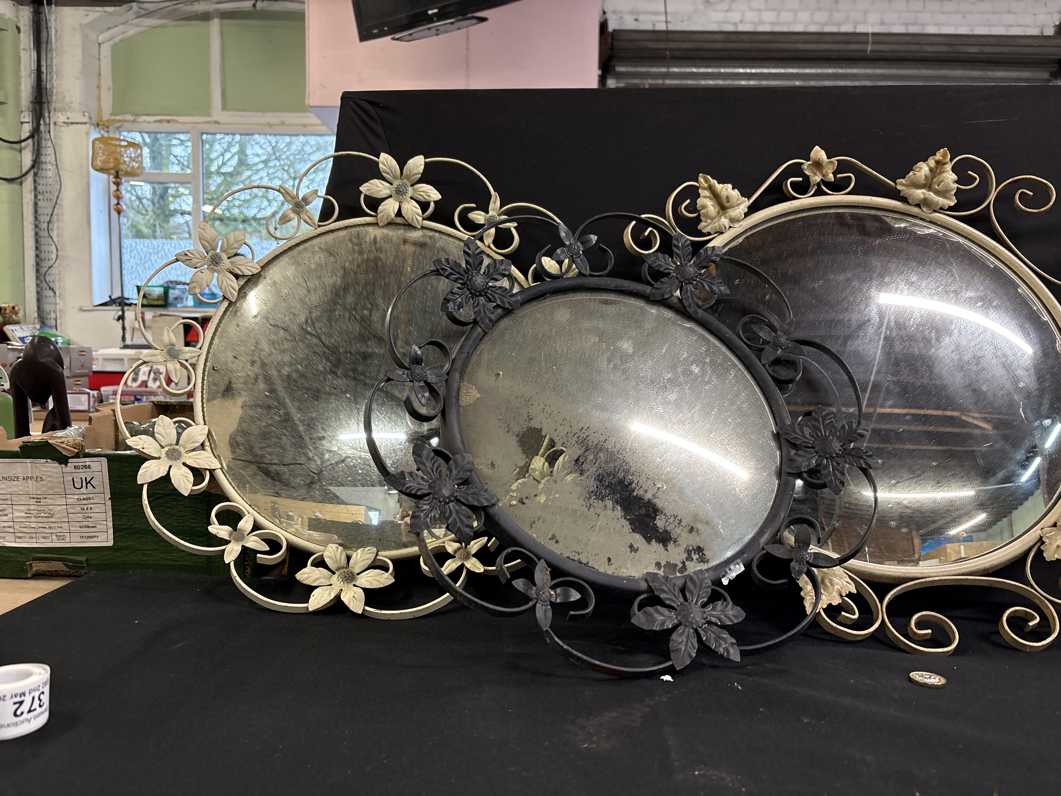 A collection of three decorative wall-hanging mirrors, comprising two oval and one circular example. Each piece is set within a wrought metal framed structure featuring an ornate, scrolling aesthetic. The two larger oval mirrors are finished in a cream-painted tone, embellished with intricate wirework and applied floral and leaf motifs. The smaller circular mirror is finished in black paint with matching scrollwork and raised flower-head decorations. These antique mirrors reflect a mid-to-late 20th-century decorative style often associated with French provincial or vintage shabby chic interiors. Dimensions: Various sizes.