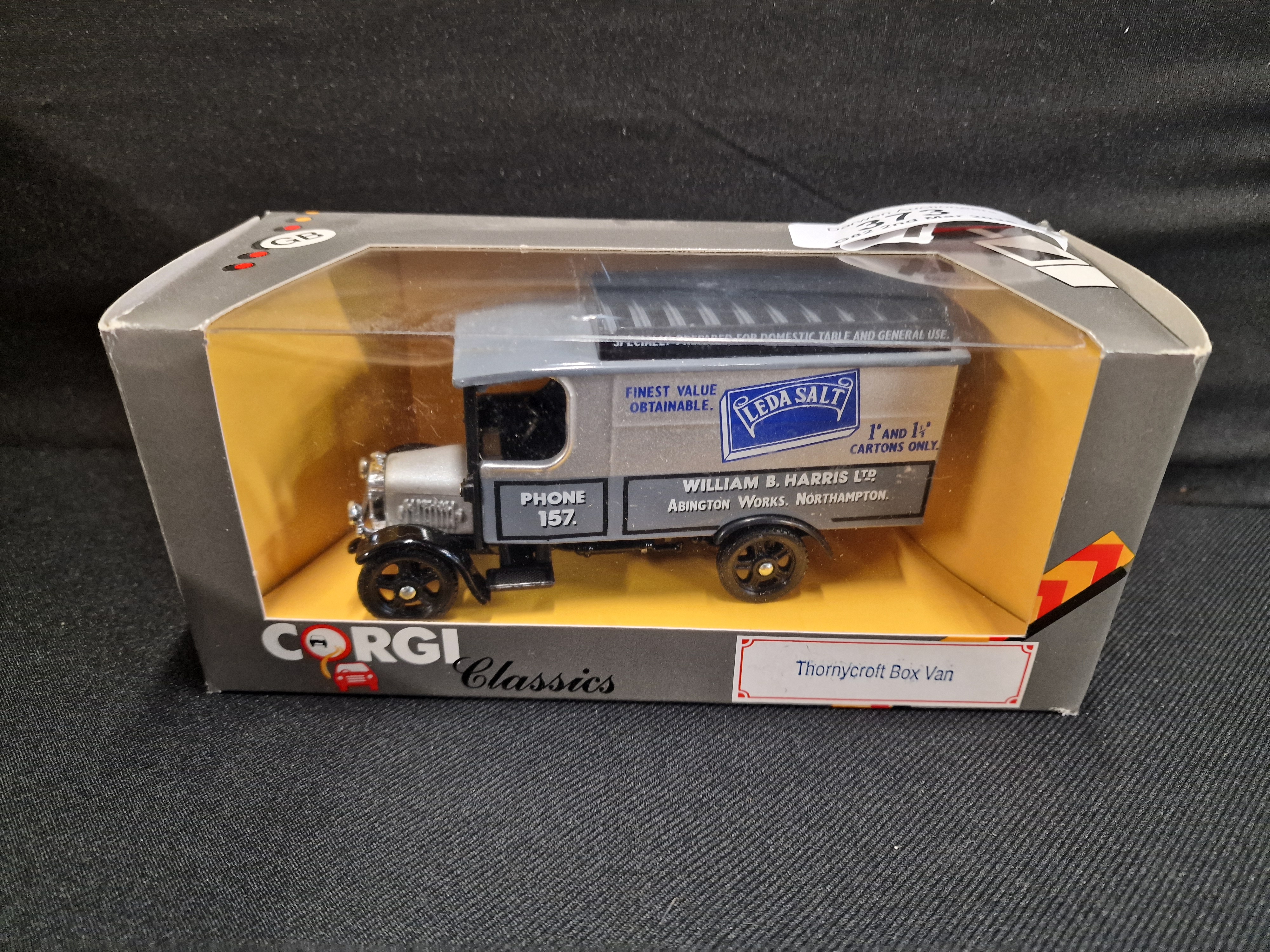 A contemporary die-cast model vehicle by Corgi Classics, representing a 1929 Thornycroft Box Van. The model is finished in a grey and black colour scheme, featuring detailed period-style advertisements for Leda Salt and William B. Harris Ltd. Abington Works, Northampton. Constructed from a combination of die-cast metal and plastic components, the piece is housed in its original Corgi Classics window display box. This model, identified as reference C859, was produced in the mid-1980s as part of a series celebrating vintage commercial transport. Length: approximately 15 cm.
