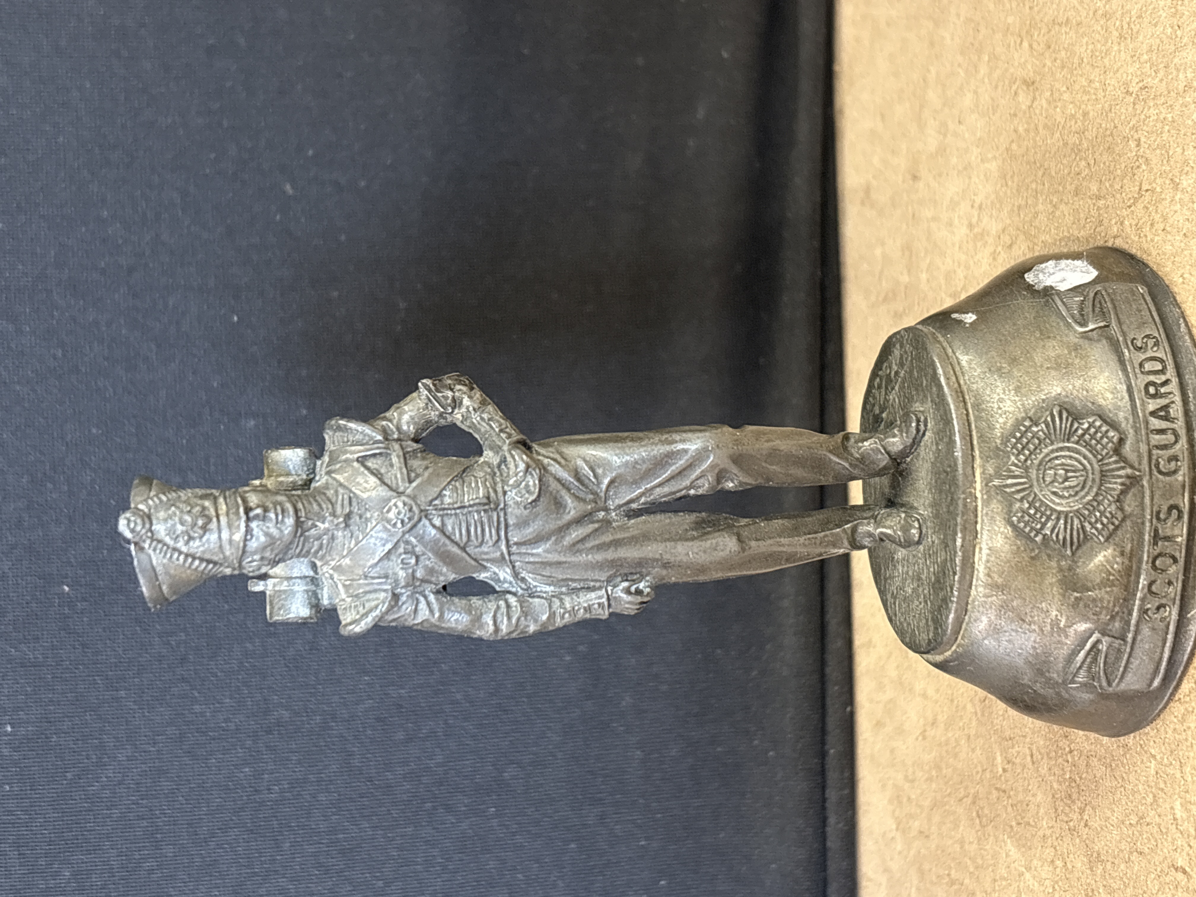 A metal figurine depicting a Scots Guards soldier in historical uniform standing on a circular base featuring the regimental crest and title.