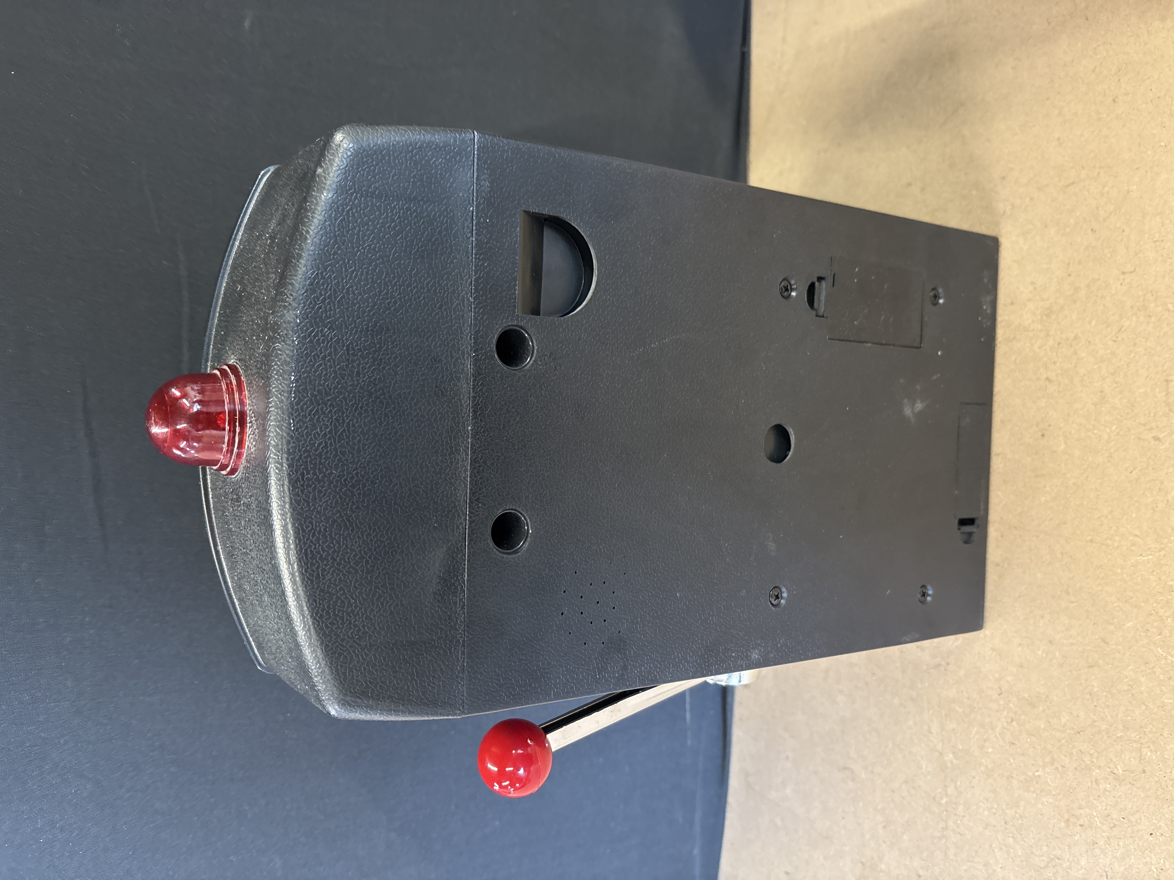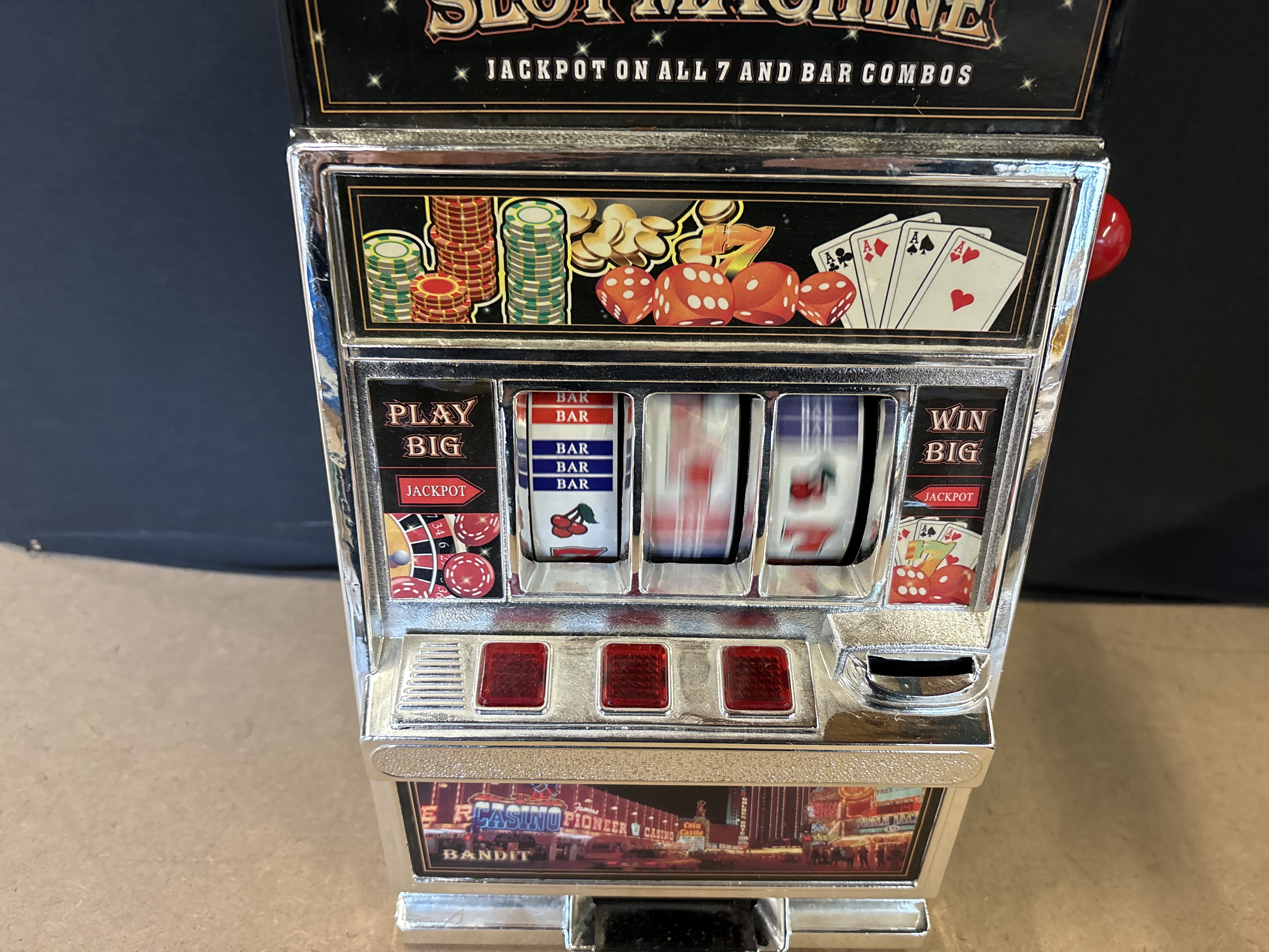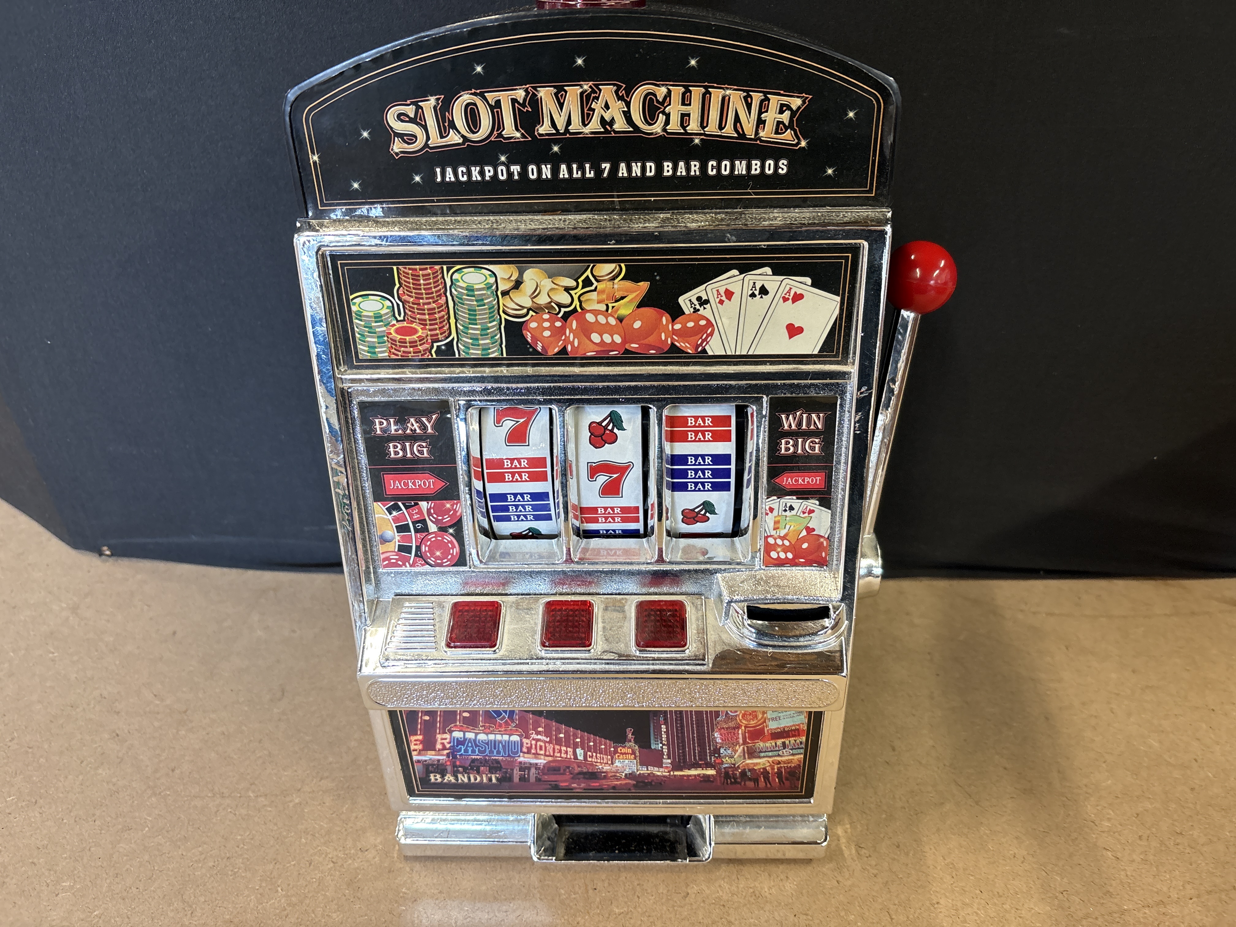 A plastic toy slot machine bank featuring a silver-coloured finish, red accents, and a pull-handle mechanism designed as a casino replica.