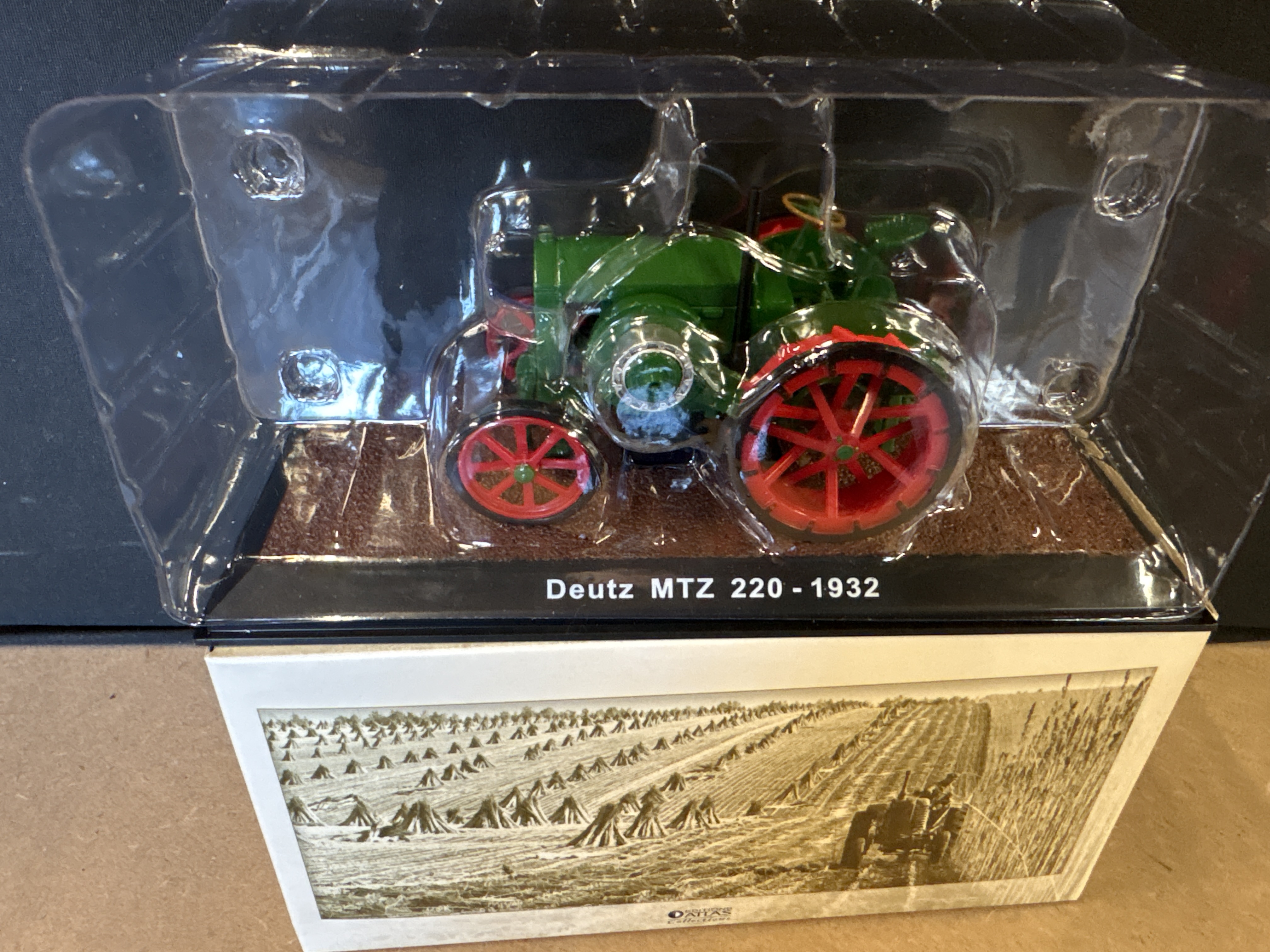 A green and red Atlas Collections Deutz MTZ 220 1932 model tractor housed in its original display packaging.