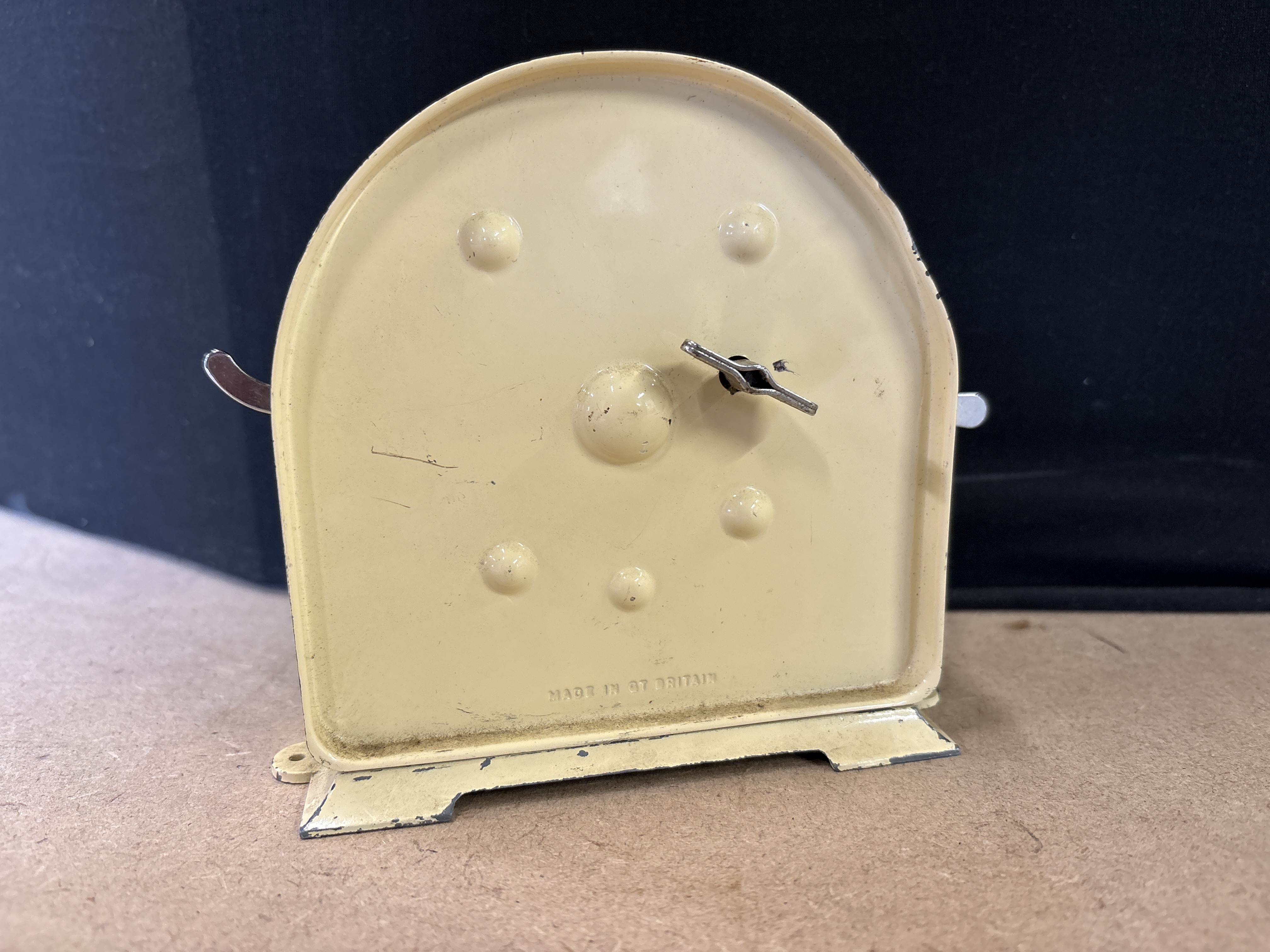 A vintage Smiths English Clock Systems metal seconds timer in cream featuring a 60-second dial and manual winding key to the reverse.