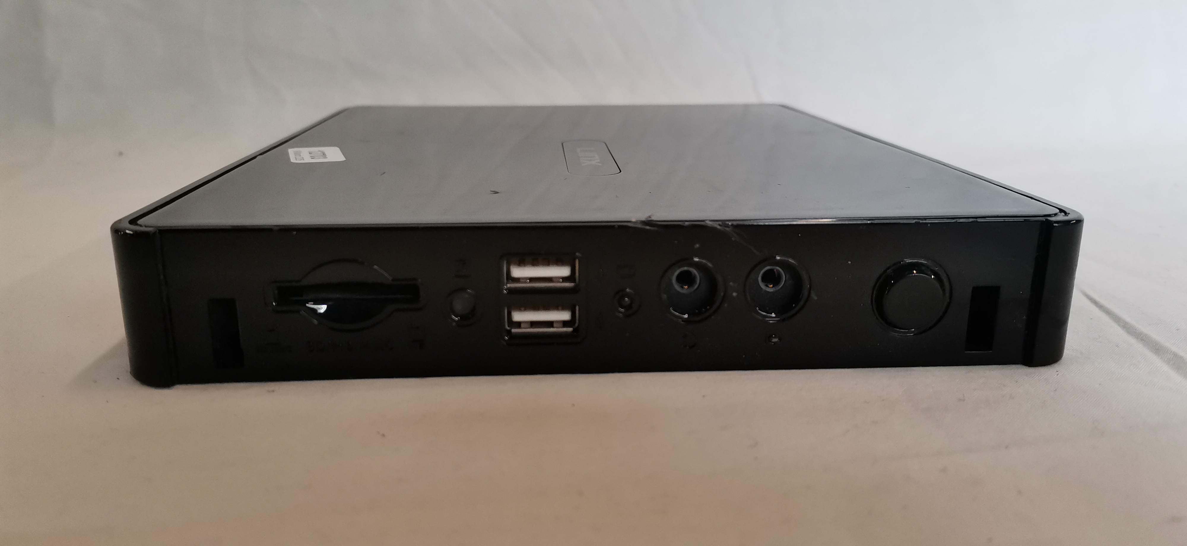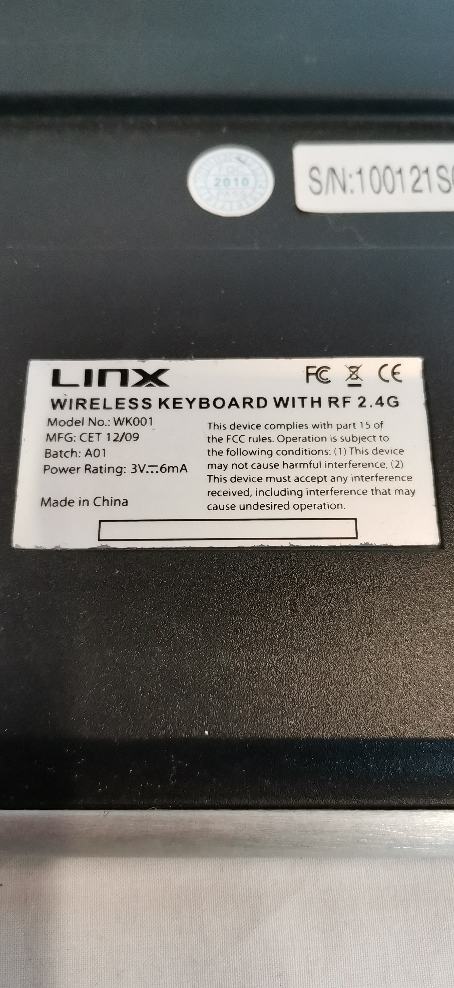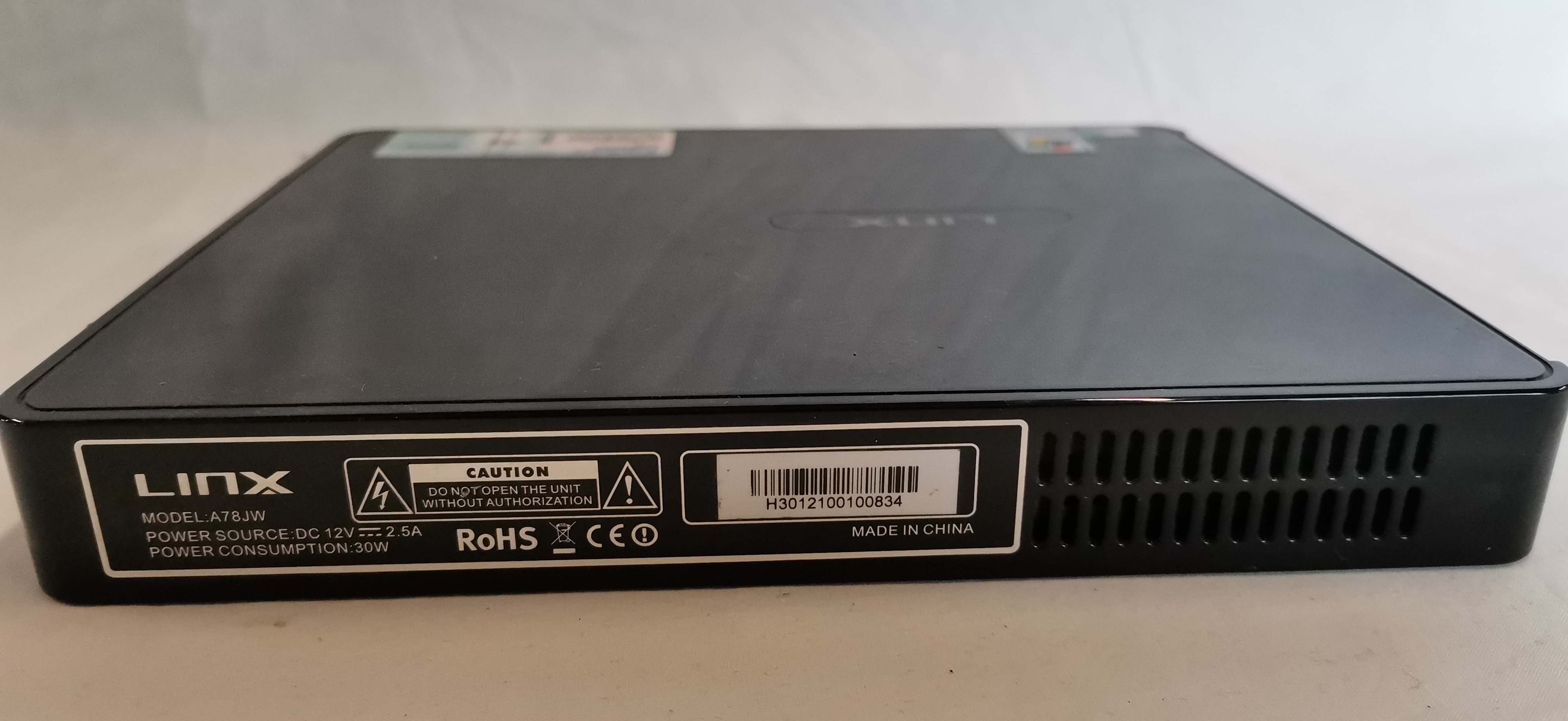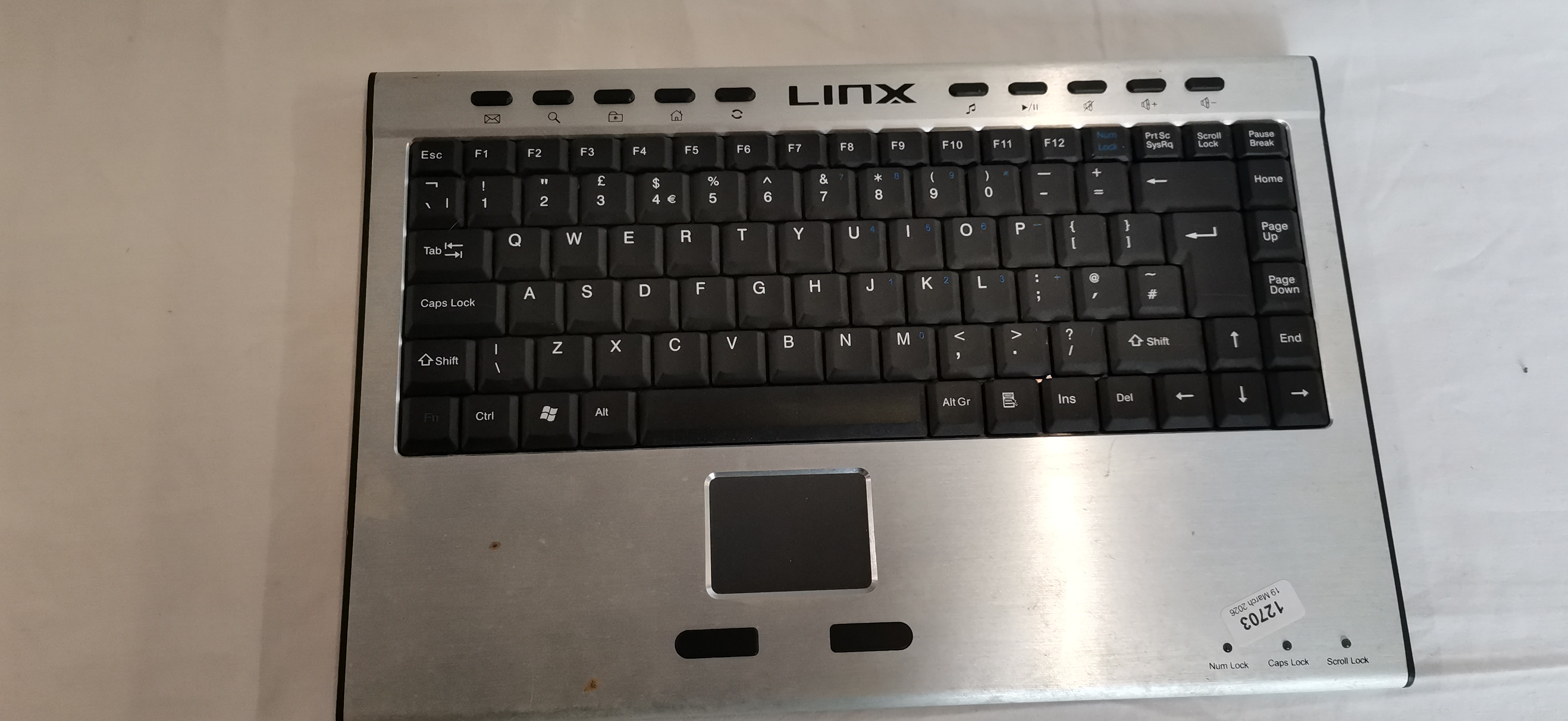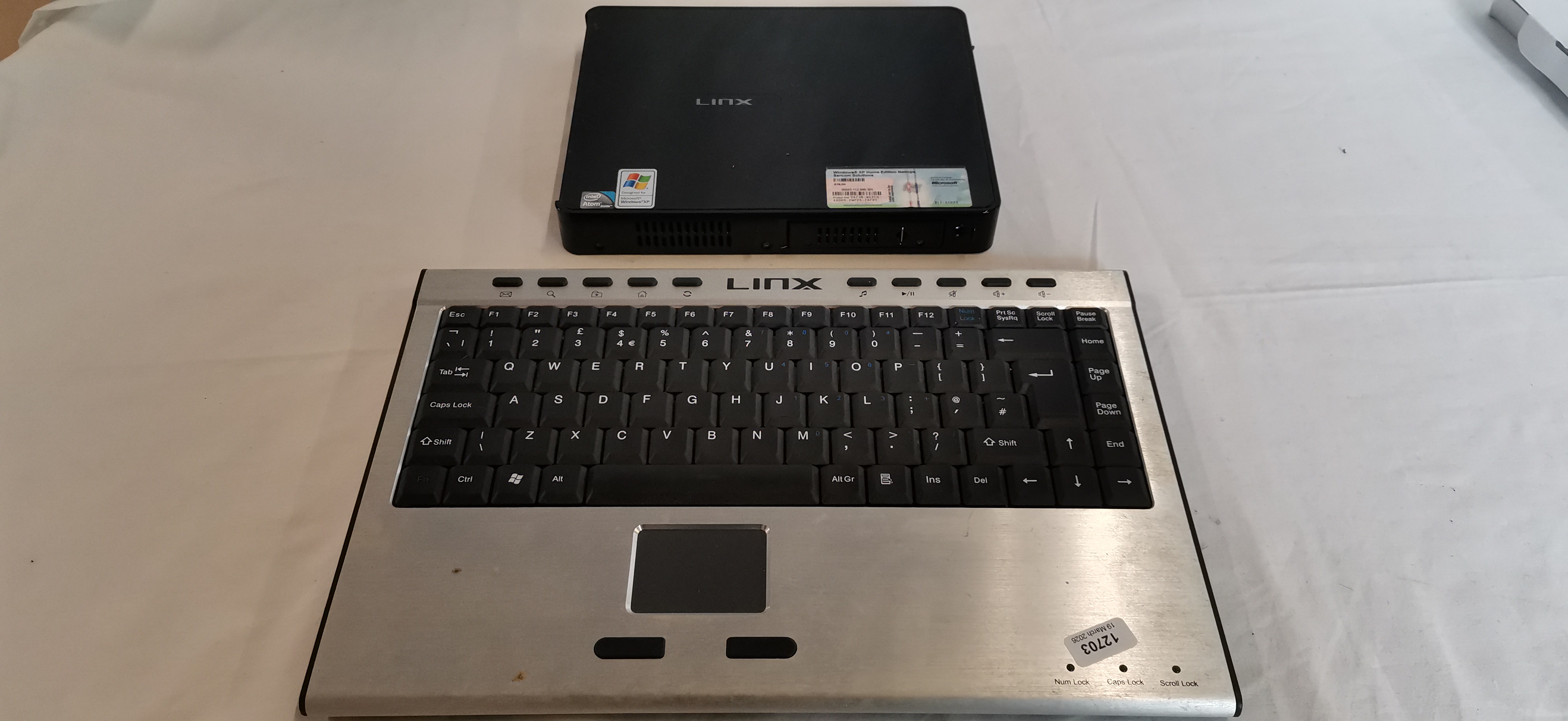 A Linx mini personal computer, model A78JW, and a Linx WK001 wireless keyboard. The mini PC is powered by an Intel Atom processor and features a Microsoft Windows XP Home Edition Certificate of Authenticity sticker with a visible product key. The front of the device is equipped with an SD/MMC/MS card reader, two USB ports, and headphone and microphone jacks. The rear interface includes a VGA port, two USB ports, an HDMI port, an Ethernet RJ45 port, and a DC power input. The serial number for the PC is H3012100100834. The accompanying Linx WK001 keyboard is a 2.4G RF wireless model featuring an integrated touchpad, dedicated media keys, and a brushed metal faceplate. The keyboard serial number is 100121S… (partially obscured). This lot does not include a power adapter, VGA/HDMI cables, or the USB wireless dongle required for the keyboard. The data wiping status is unknown as the units are untested.