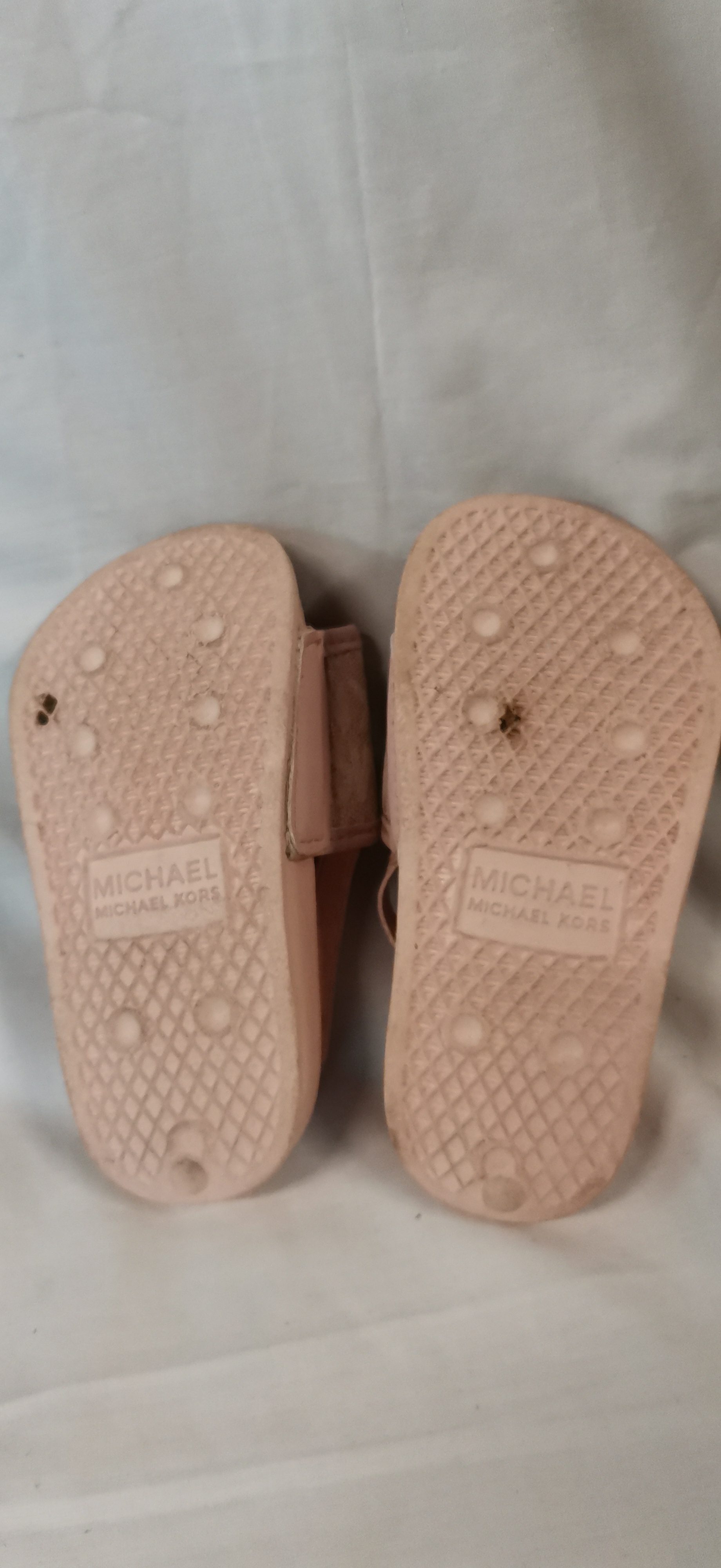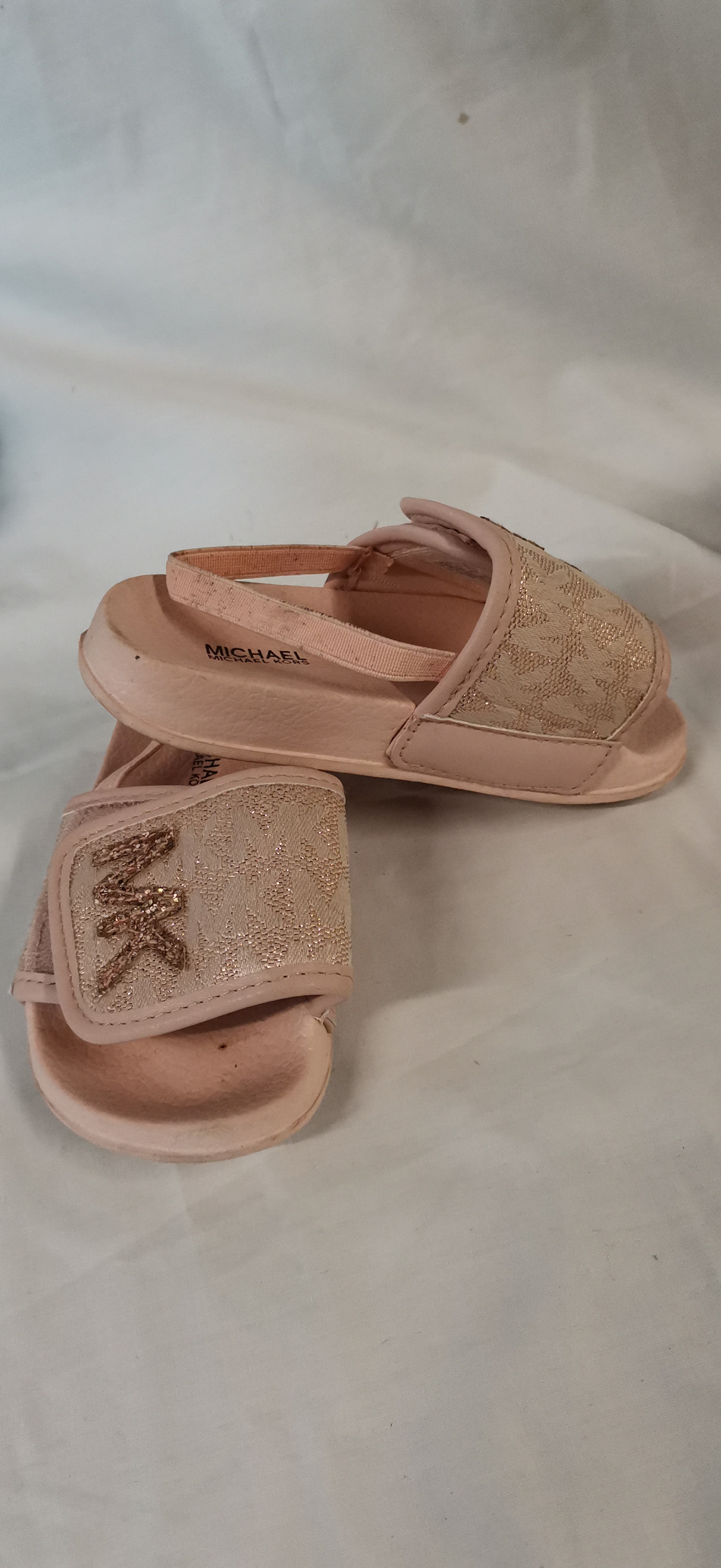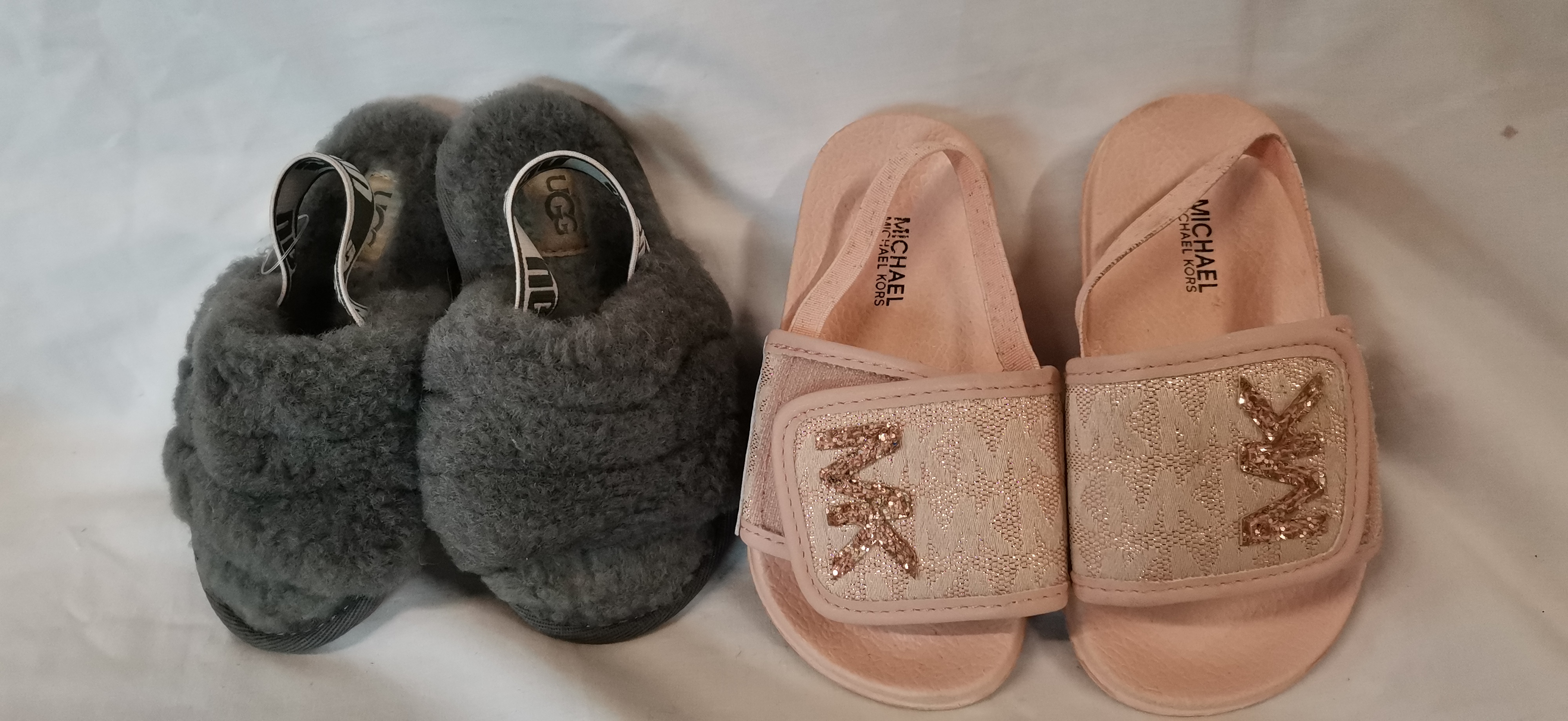 A group of two pairs of children’s footwear. The first pair comprises Michael Kors Cannes 4 T slide sandals in blush pink, featuring a monogrammed strap with a glittery MK logo and elasticated heel straps. The soles are marked Michael Michael Kors and the interior tag states the items are made of all man-made materials in China. The second pair consists of grey UGG sandals featuring a shorn wool-style upper and an elasticated heel strap with the UGG logo. The textured soles show a repeating logo pattern and the interior tag indicates the items were made in Vietnam.