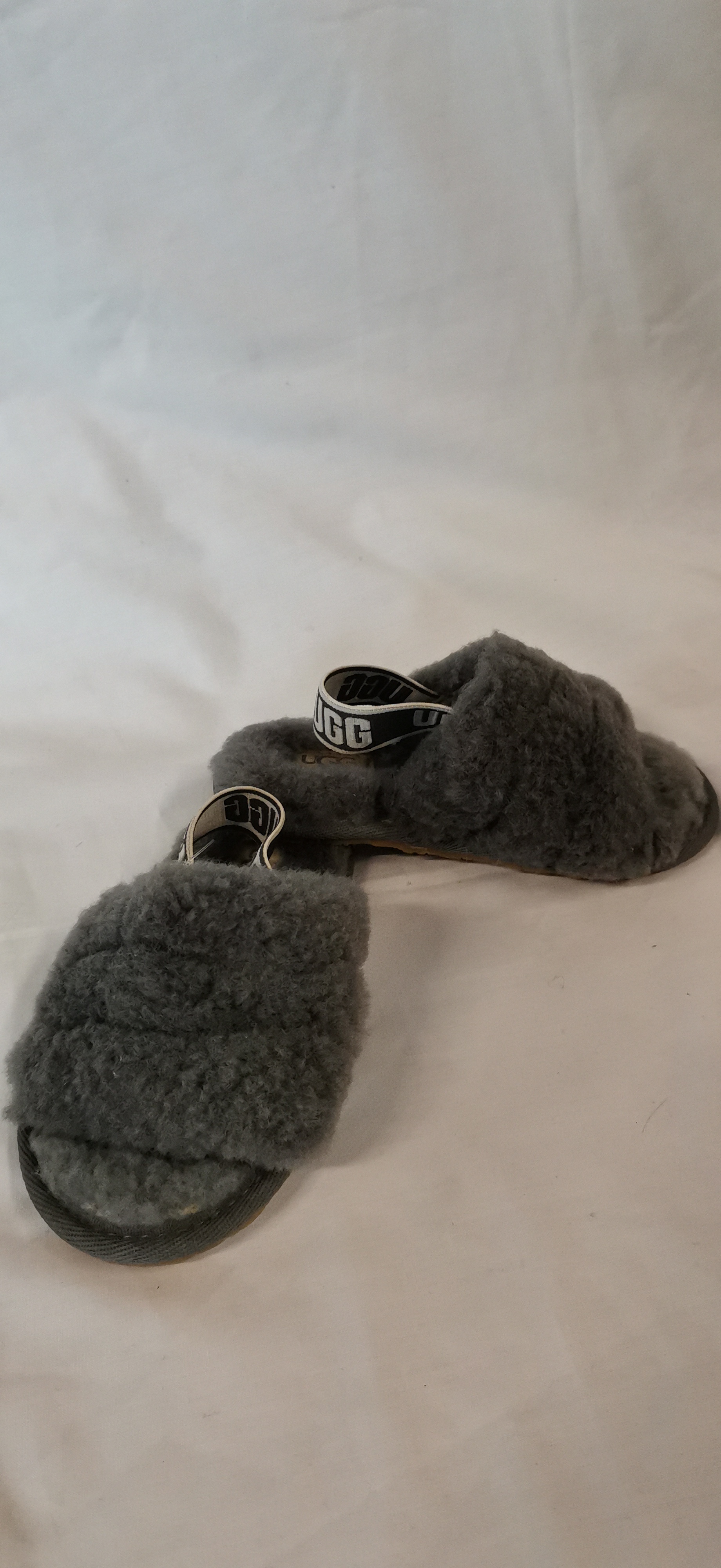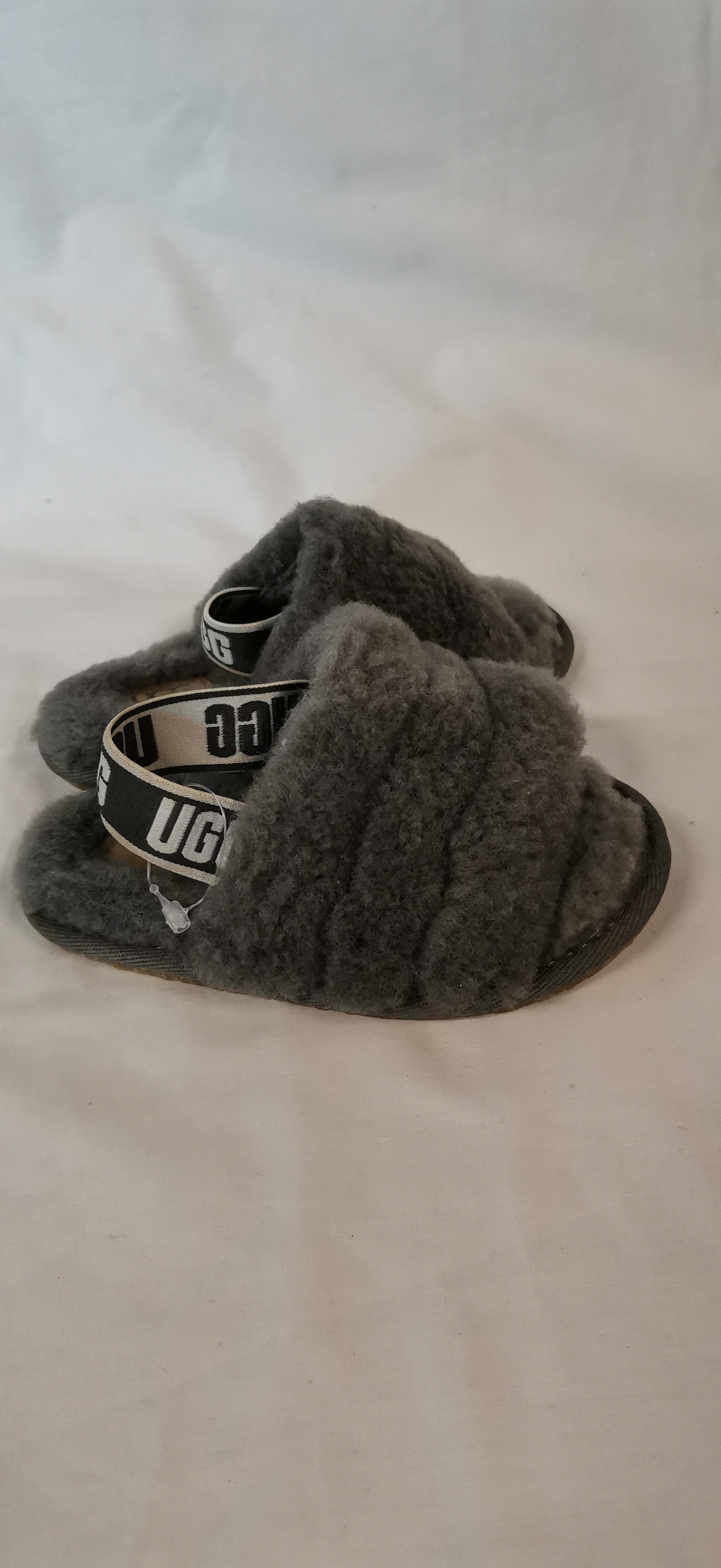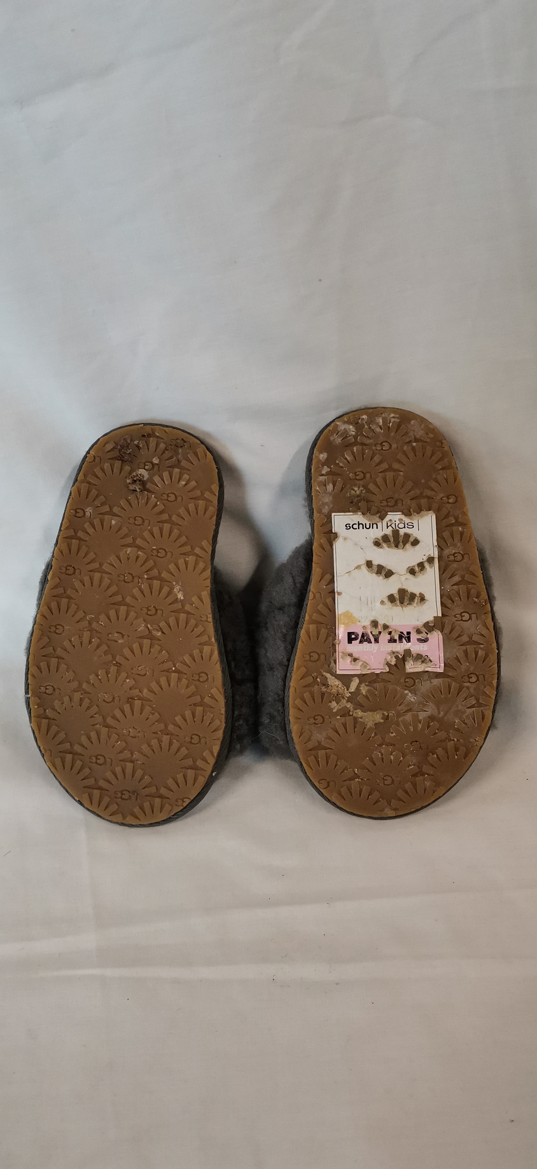 A group of two pairs of children’s footwear. The first pair comprises Michael Kors Cannes 4 T slide sandals in blush pink, featuring a monogrammed strap with a glittery MK logo and elasticated heel straps. The soles are marked Michael Michael Kors and the interior tag states the items are made of all man-made materials in China. The second pair consists of grey UGG sandals featuring a shorn wool-style upper and an elasticated heel strap with the UGG logo. The textured soles show a repeating logo pattern and the interior tag indicates the items were made in Vietnam.