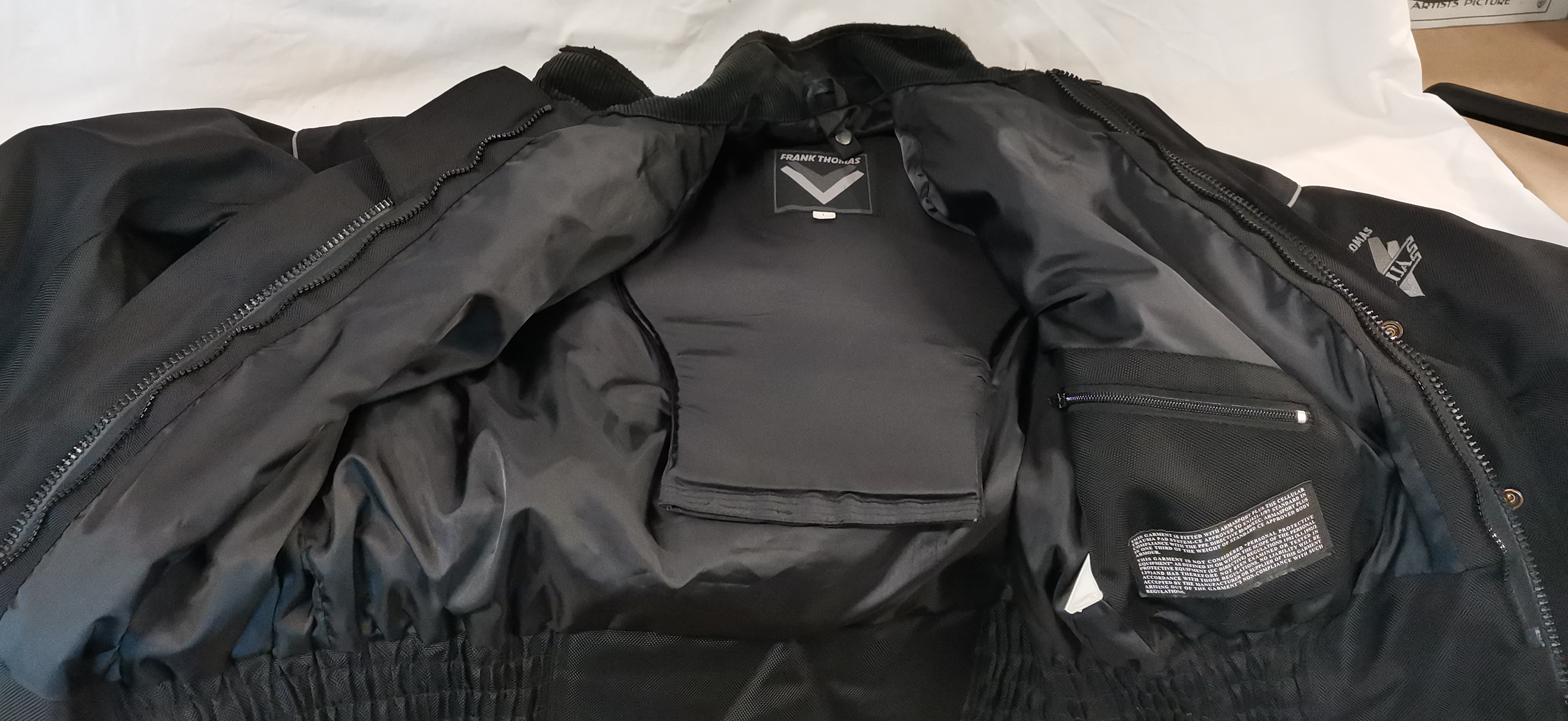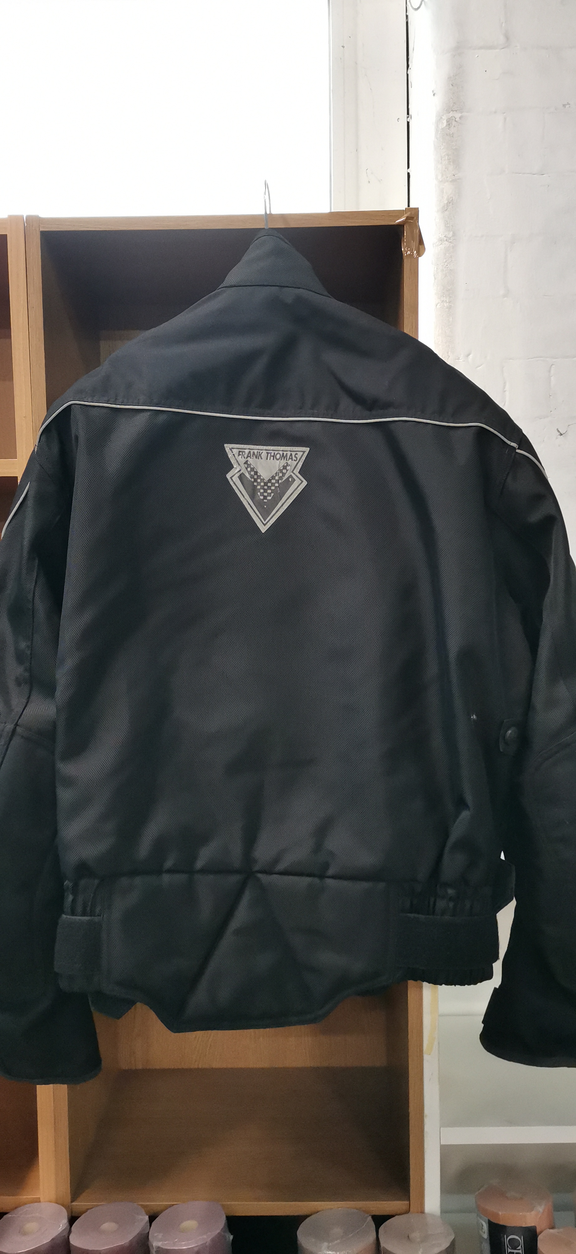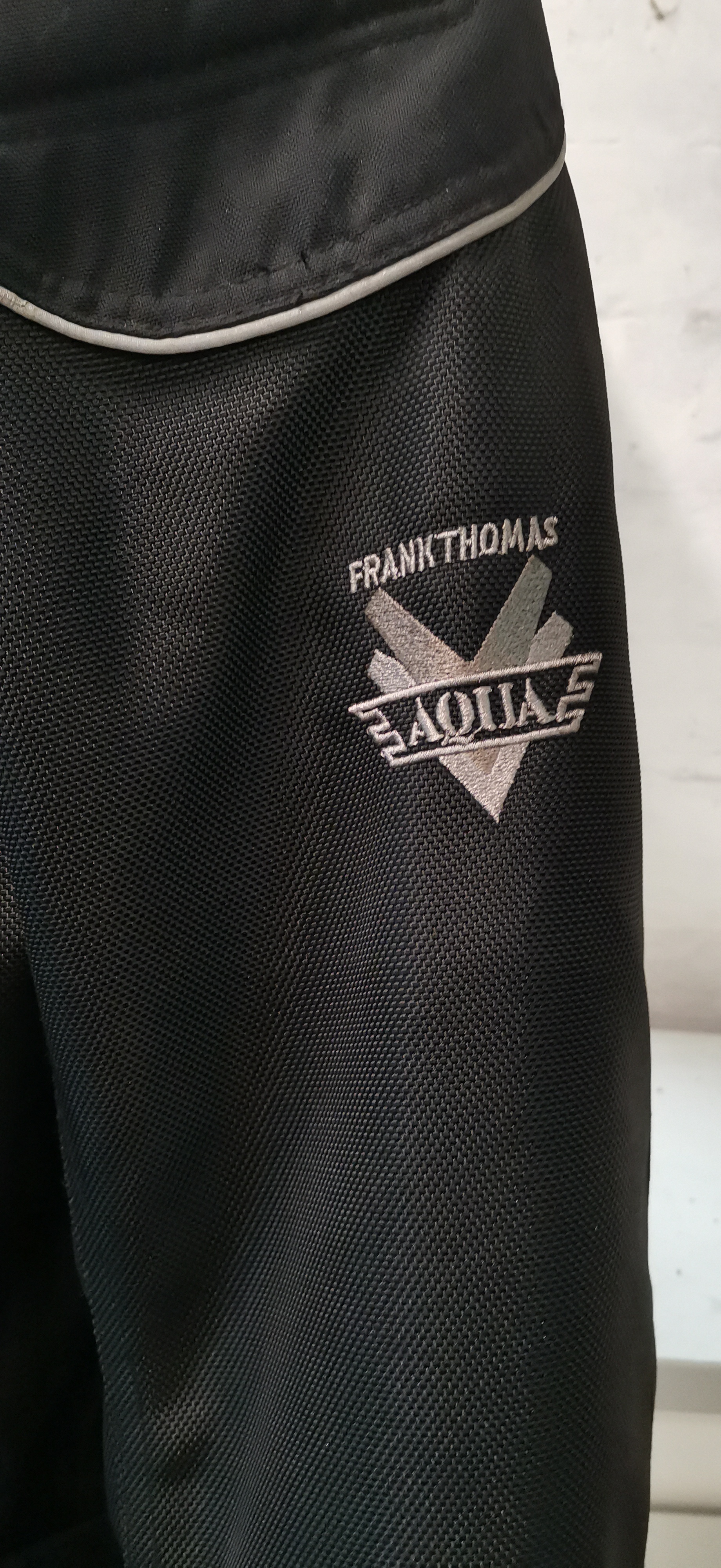 A Frank Thomas Aqua motorcycle jacket in black textile, size L. The garment is constructed from heavy-duty synthetic material and features integrated padding at the shoulders. The front closure consists of a central zip with a snap-button storm flap. The exterior includes two zippered pockets, with an additional zippered pocket located internally. Branding is present throughout, including Frank Thomas and Aqua embroidery on the left sleeve, a large logo on the back, and the brand name woven into the adjustable hook-and-loop waist straps. An internal label specifies the inclusion of the Armasport Plus cellular trauma pad system, noted as CE approved to EN1621-1/97 standards.