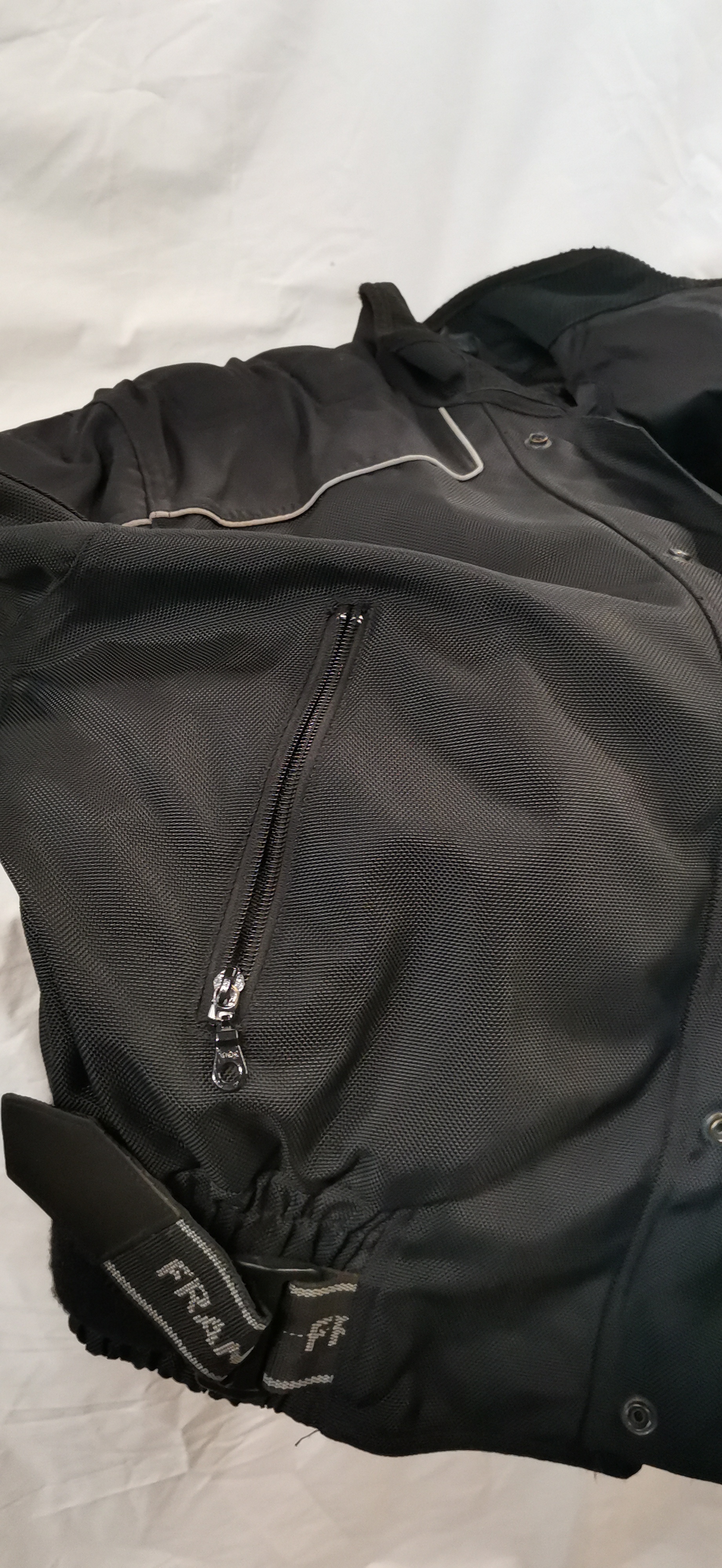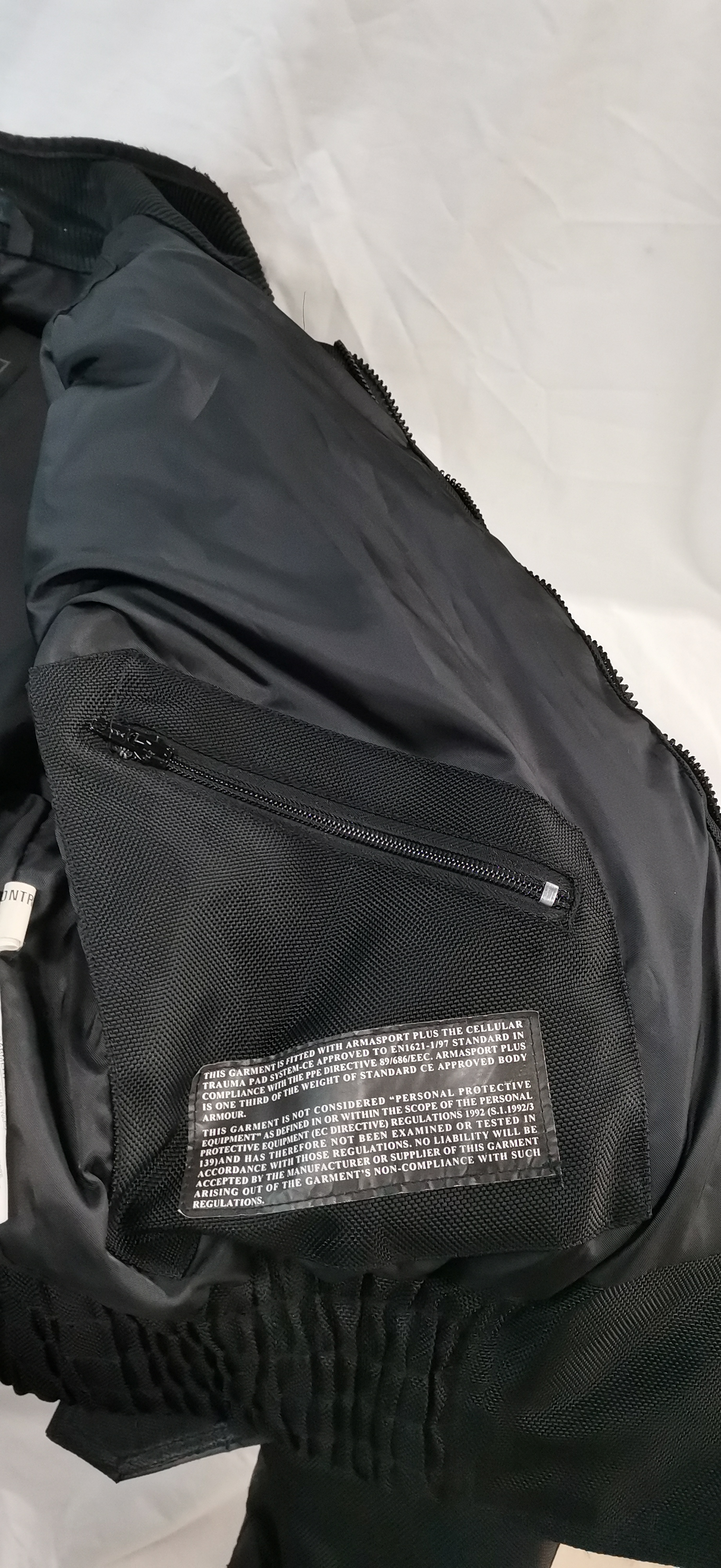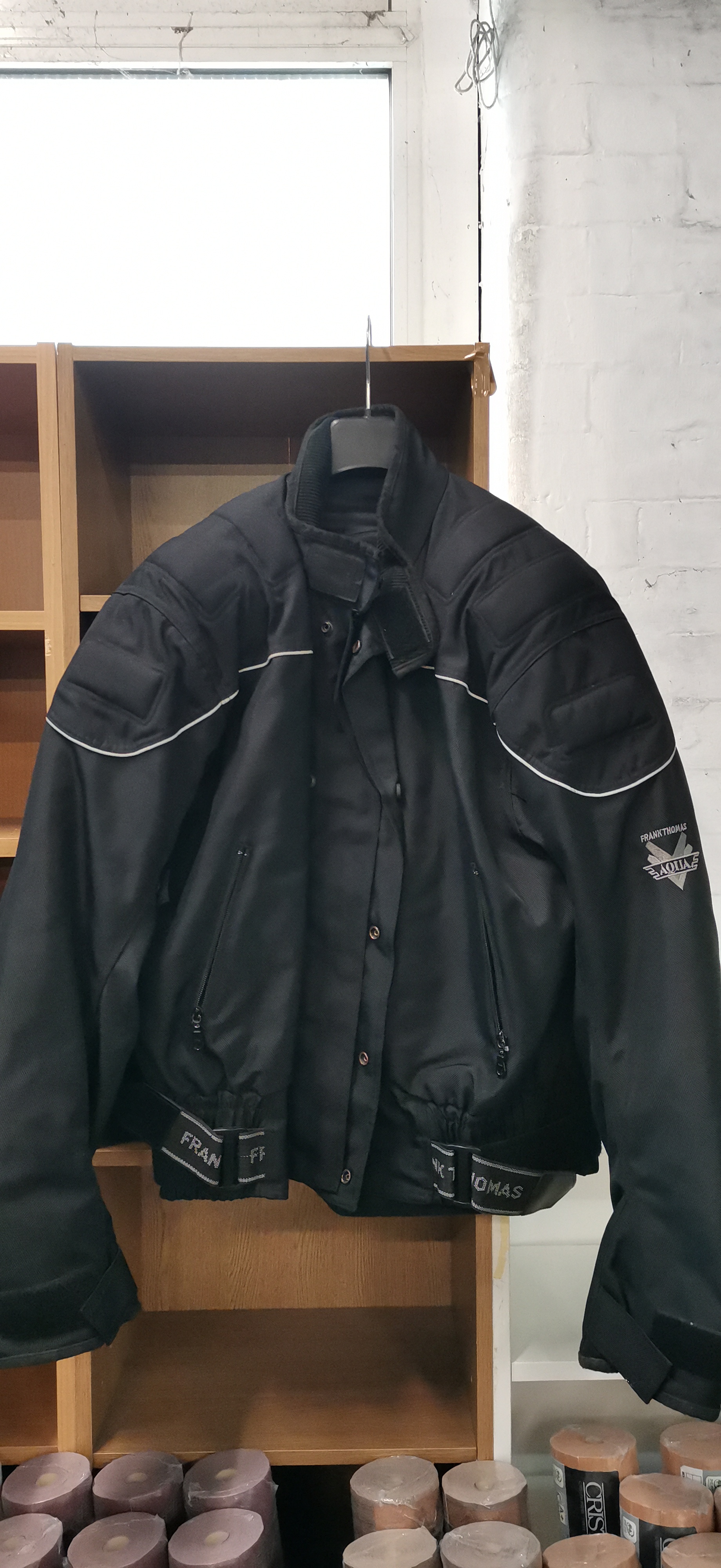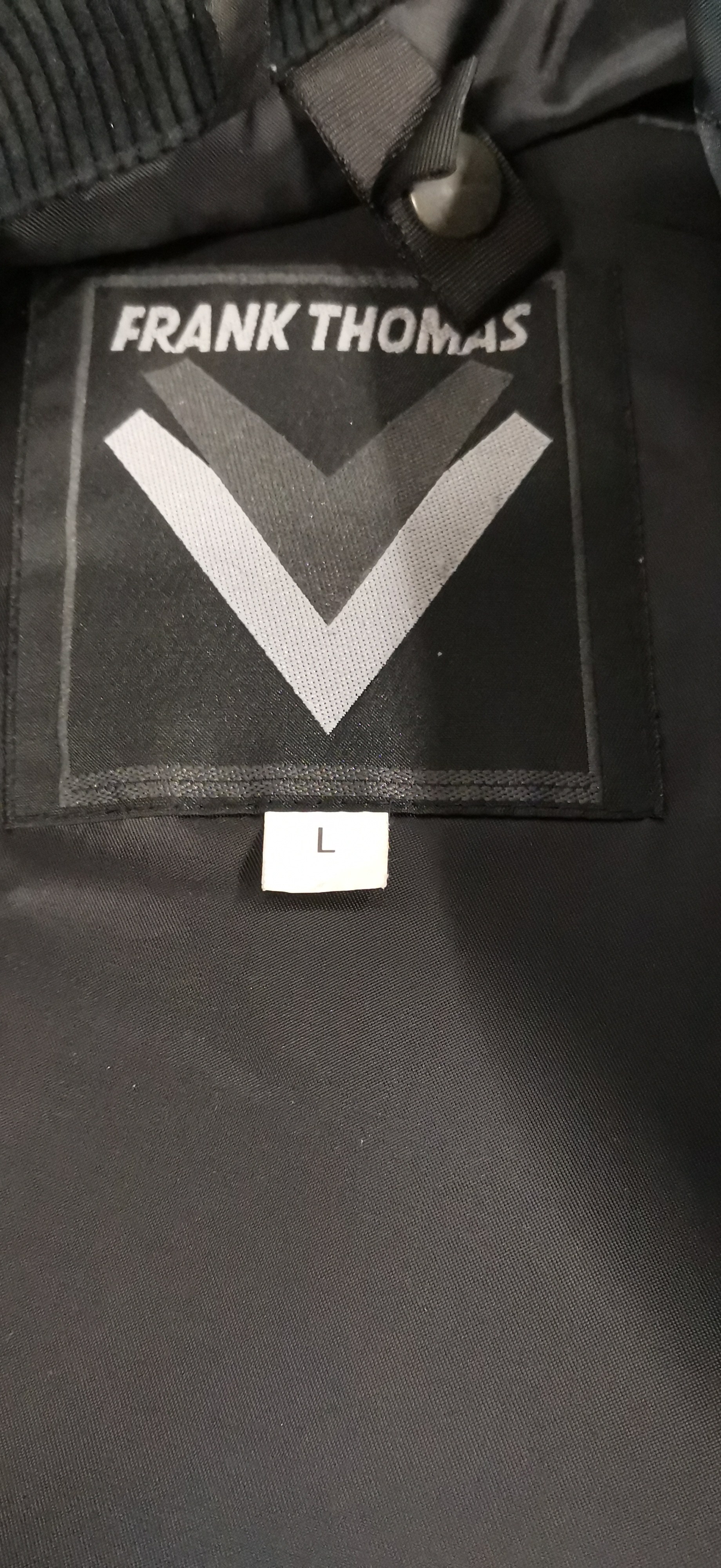 A Frank Thomas Aqua motorcycle jacket in black textile, size L. The garment is constructed from heavy-duty synthetic material and features integrated padding at the shoulders. The front closure consists of a central zip with a snap-button storm flap. The exterior includes two zippered pockets, with an additional zippered pocket located internally. Branding is present throughout, including Frank Thomas and Aqua embroidery on the left sleeve, a large logo on the back, and the brand name woven into the adjustable hook-and-loop waist straps. An internal label specifies the inclusion of the Armasport Plus cellular trauma pad system, noted as CE approved to EN1621-1/97 standards.