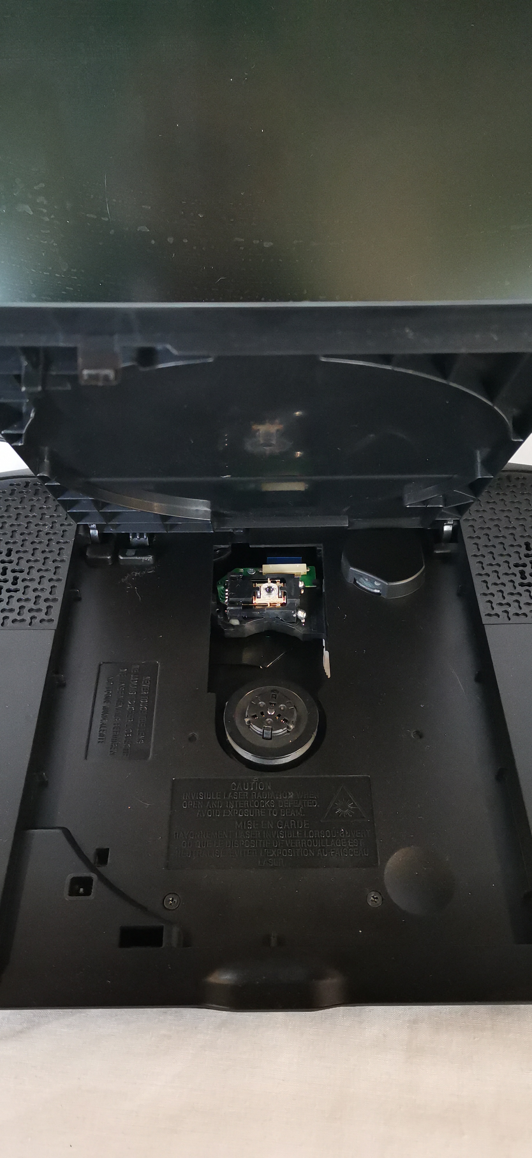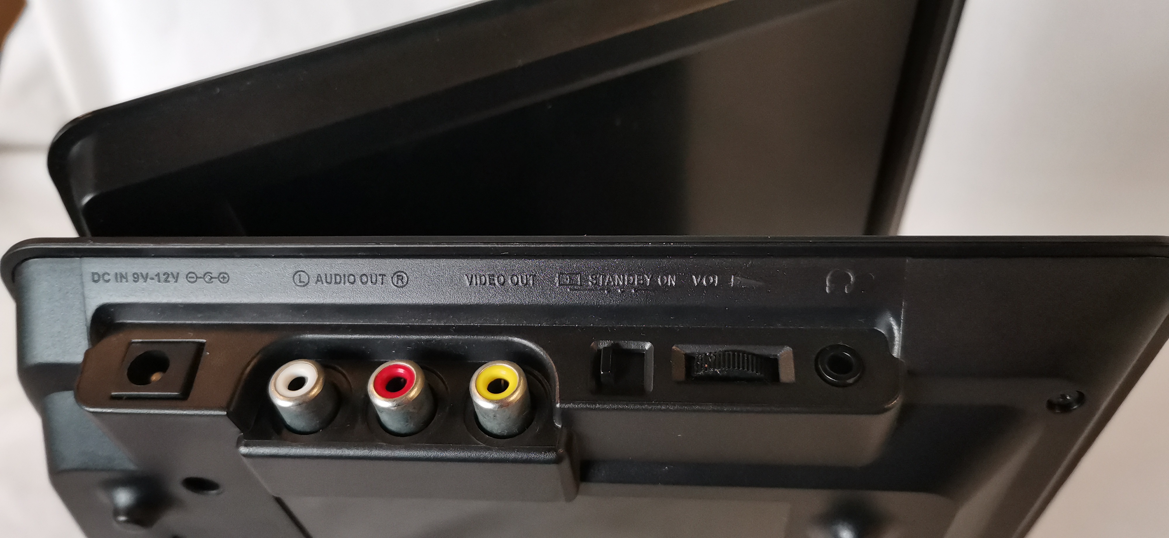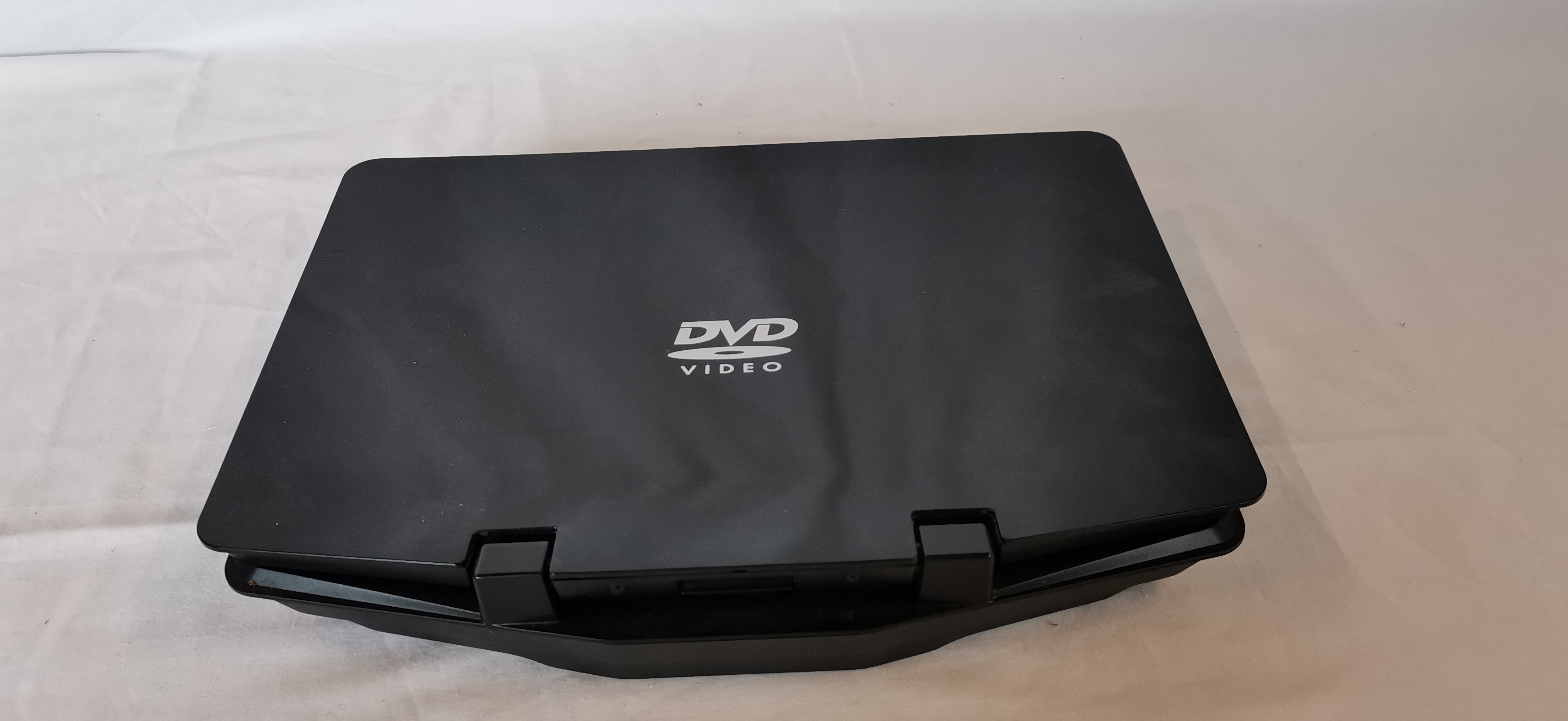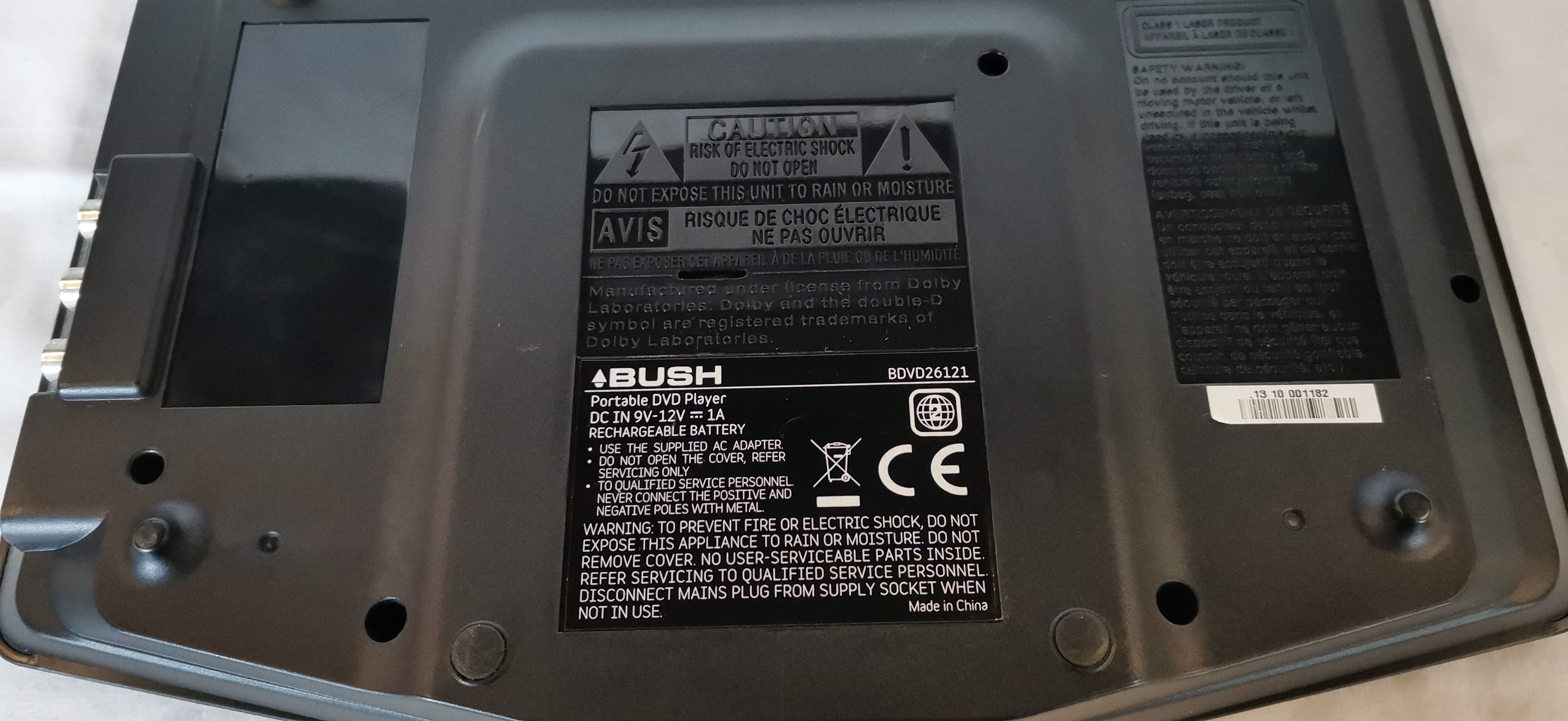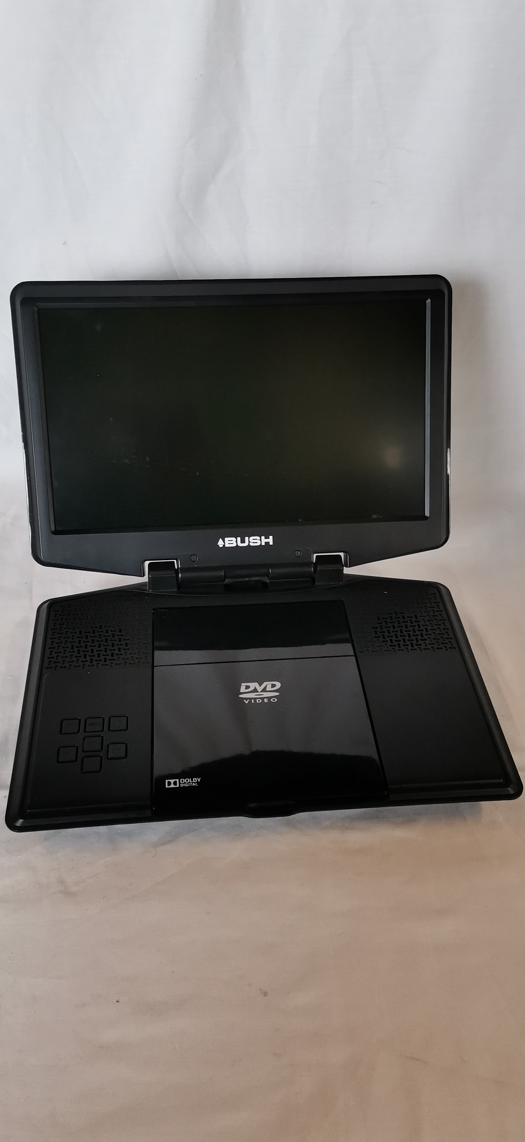 A Bush model BDVD26121 portable DVD player featuring a black plastic casing with a flip-up screen and an integrated top-loading disc tray. The brand name BUSH is present on the lower screen bezel and the base unit. Identification marks on the base include the model number BDVD26121 and serial number 13 10 001182. Side-mounted connectivity and controls include a DC IN (9V-12V) port, RCA audio and video outputs, a standby/on switch, a thumbwheel volume control, and a 3.5mm headphone jack. The base is equipped with standard playback controls including stop, menu, play/pause, and track navigation buttons. The unit is marked for Dolby Digital and DVD Video compatibility. No power adapter, remote control, or additional accessories are included with this lot.