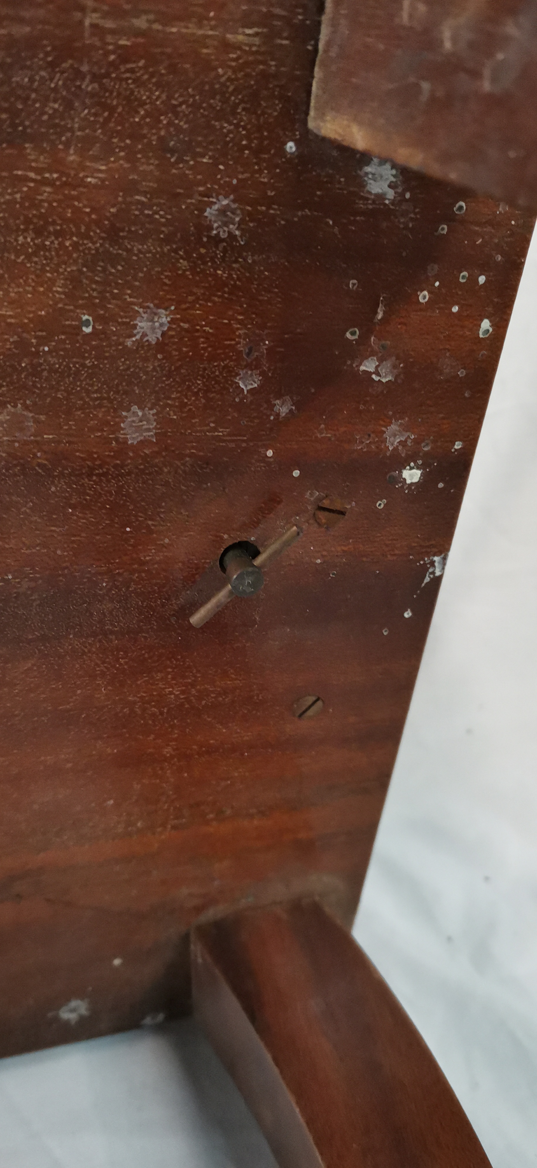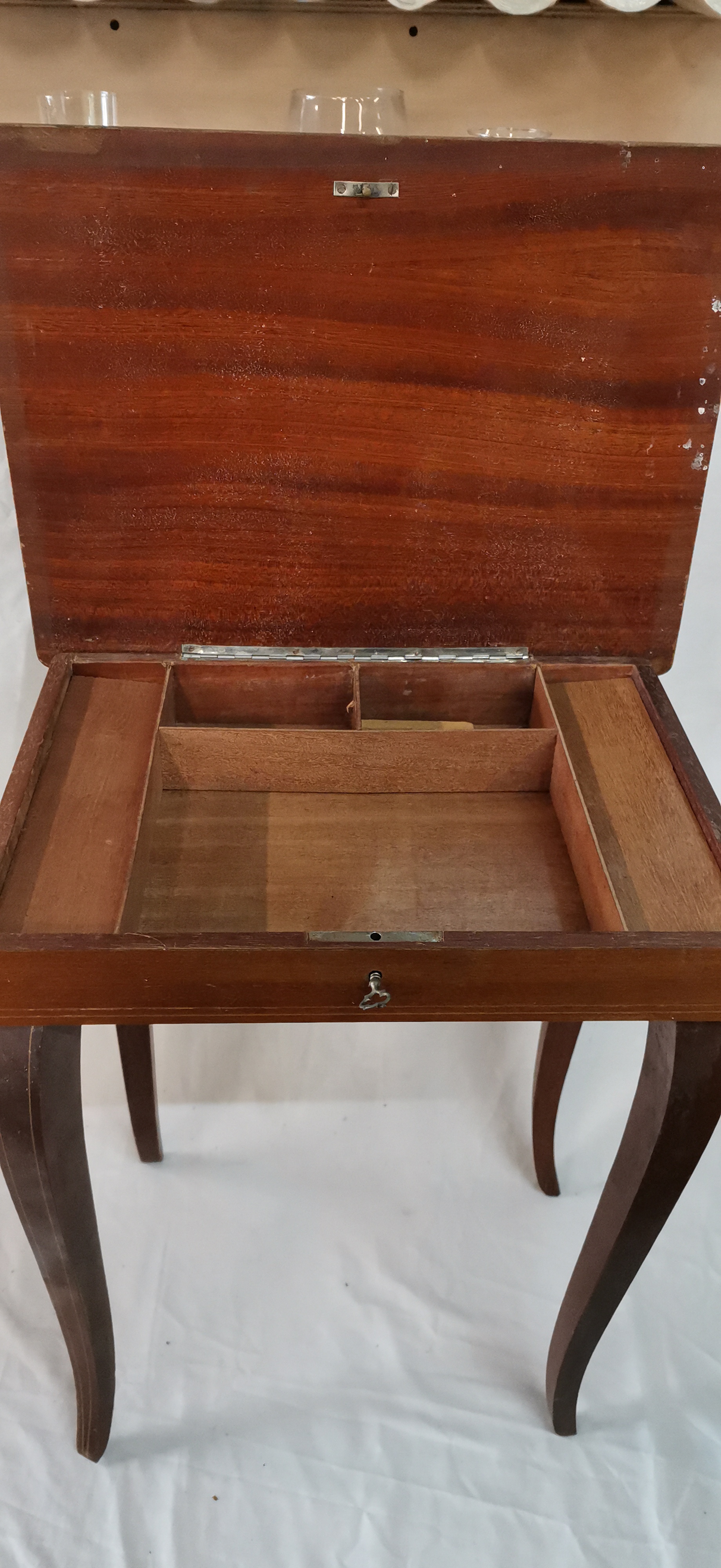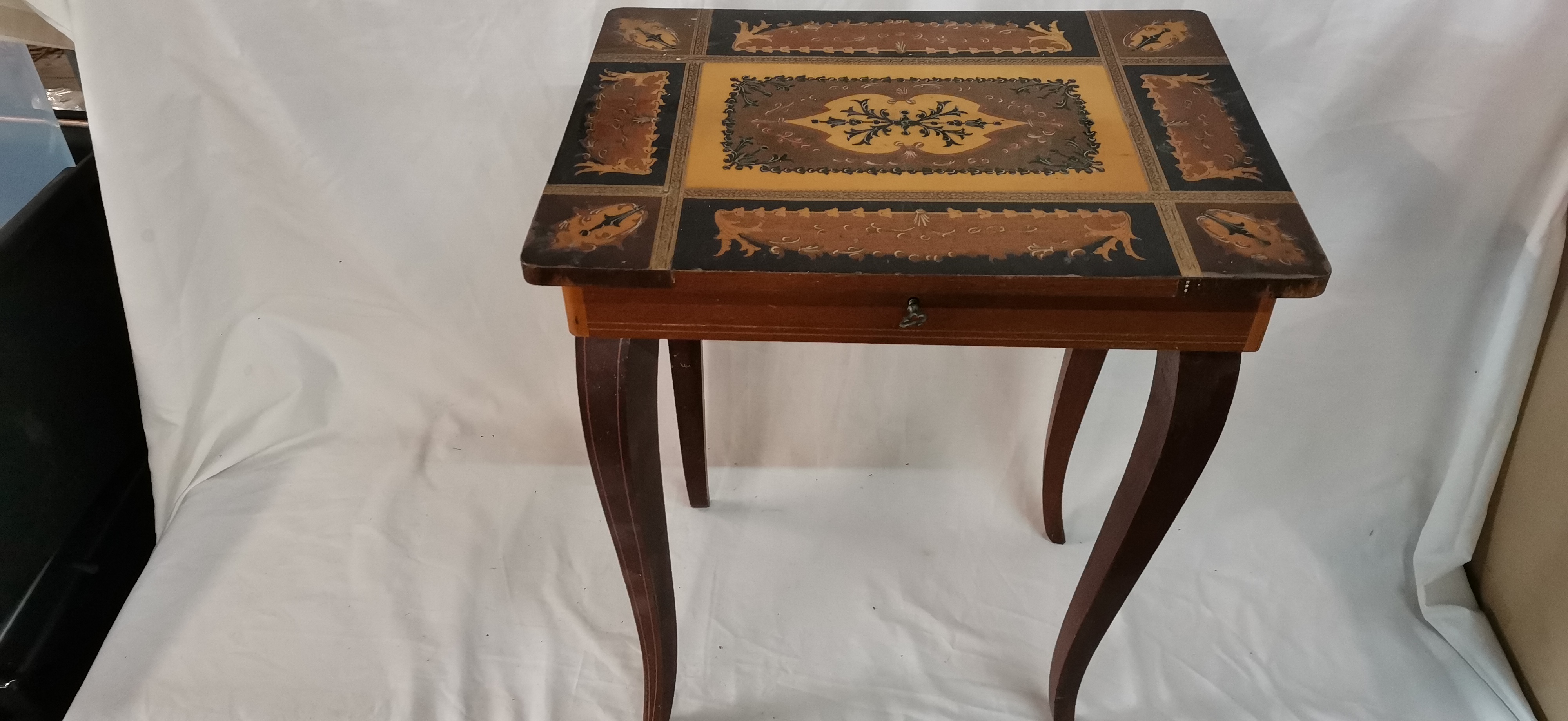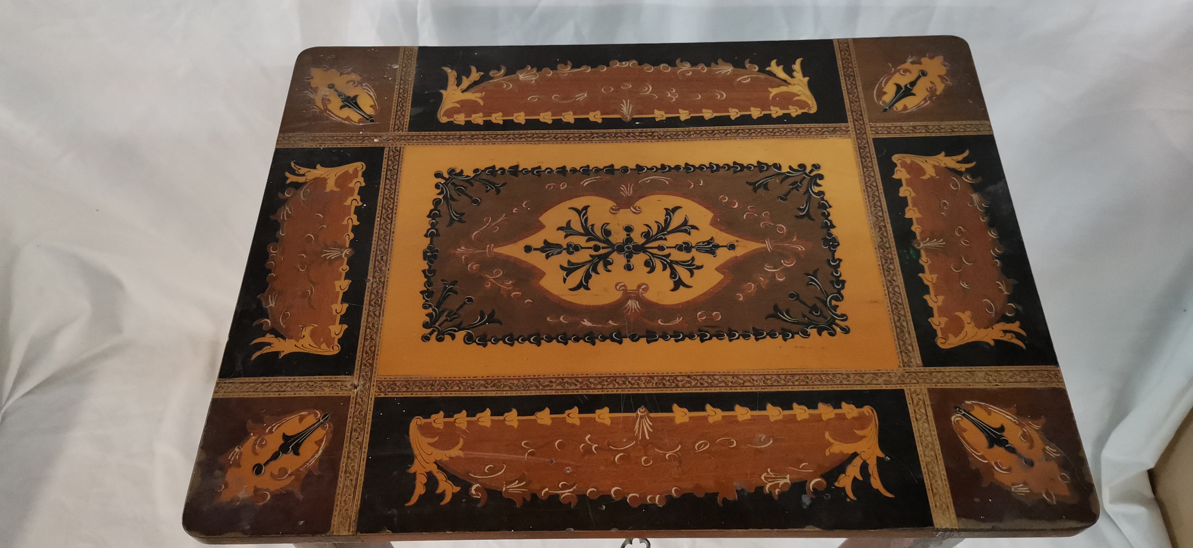A Continental musical work table of mixed wood construction, likely mahogany or walnut, featuring multi-wood marquetry inlay. The rectangular hinged top is decorated with elaborate marquetry depicting scrolling foliate and arabesque motifs in various light and dark woods. The lid opens on a piano hinge to reveal a partitioned interior containing four open compartments. The table is supported on four slender cabriole legs. It is fitted with a musical movement, operated by a fixed T-bar winding key located on the underside. A key is present in the lock.