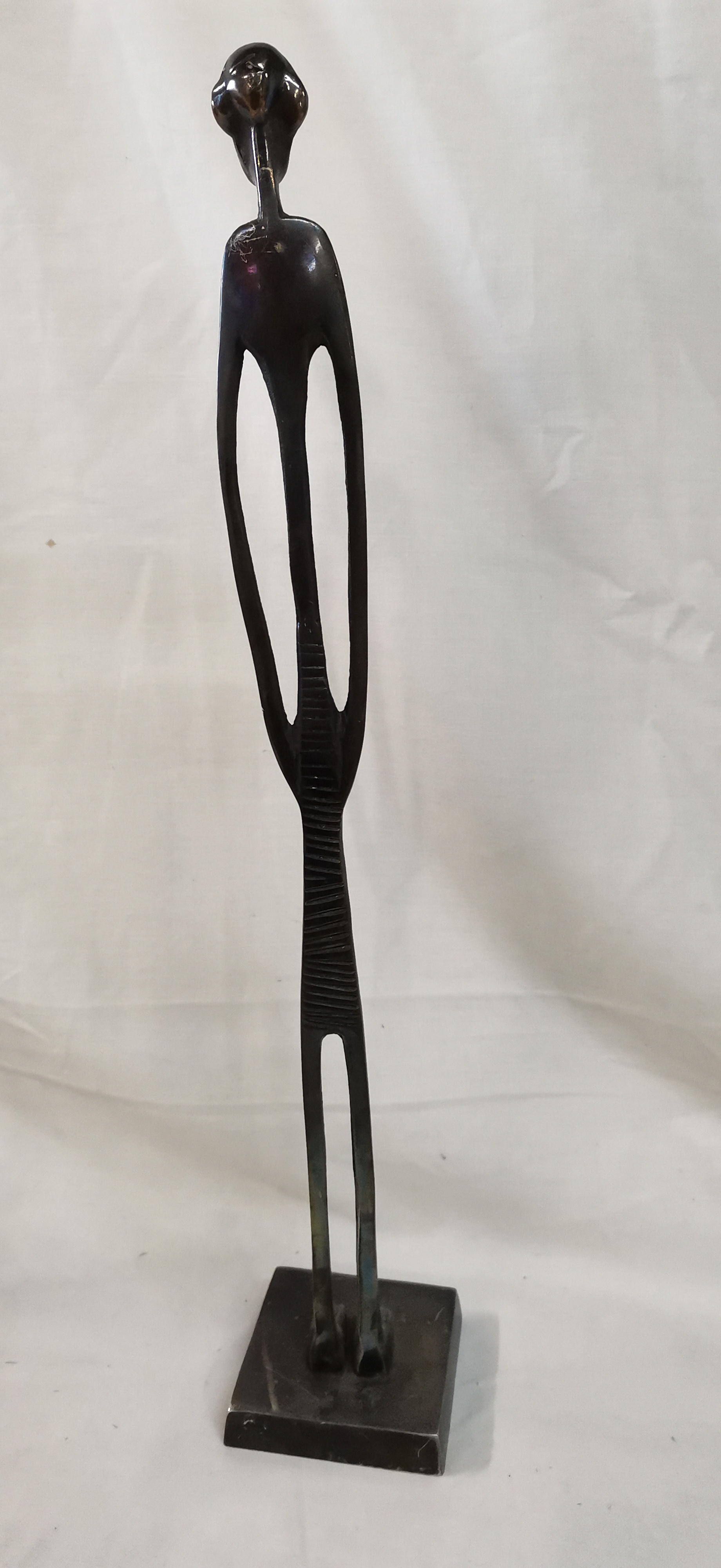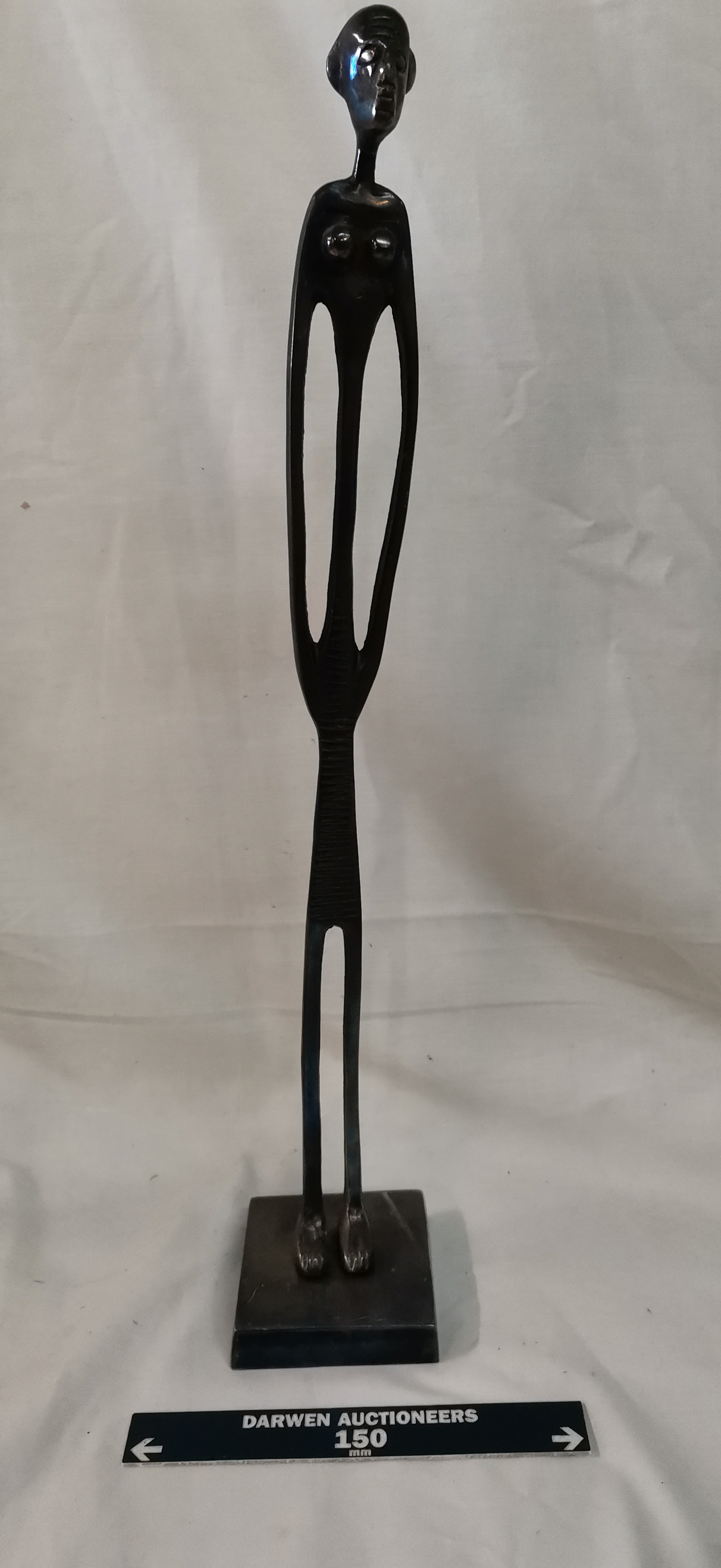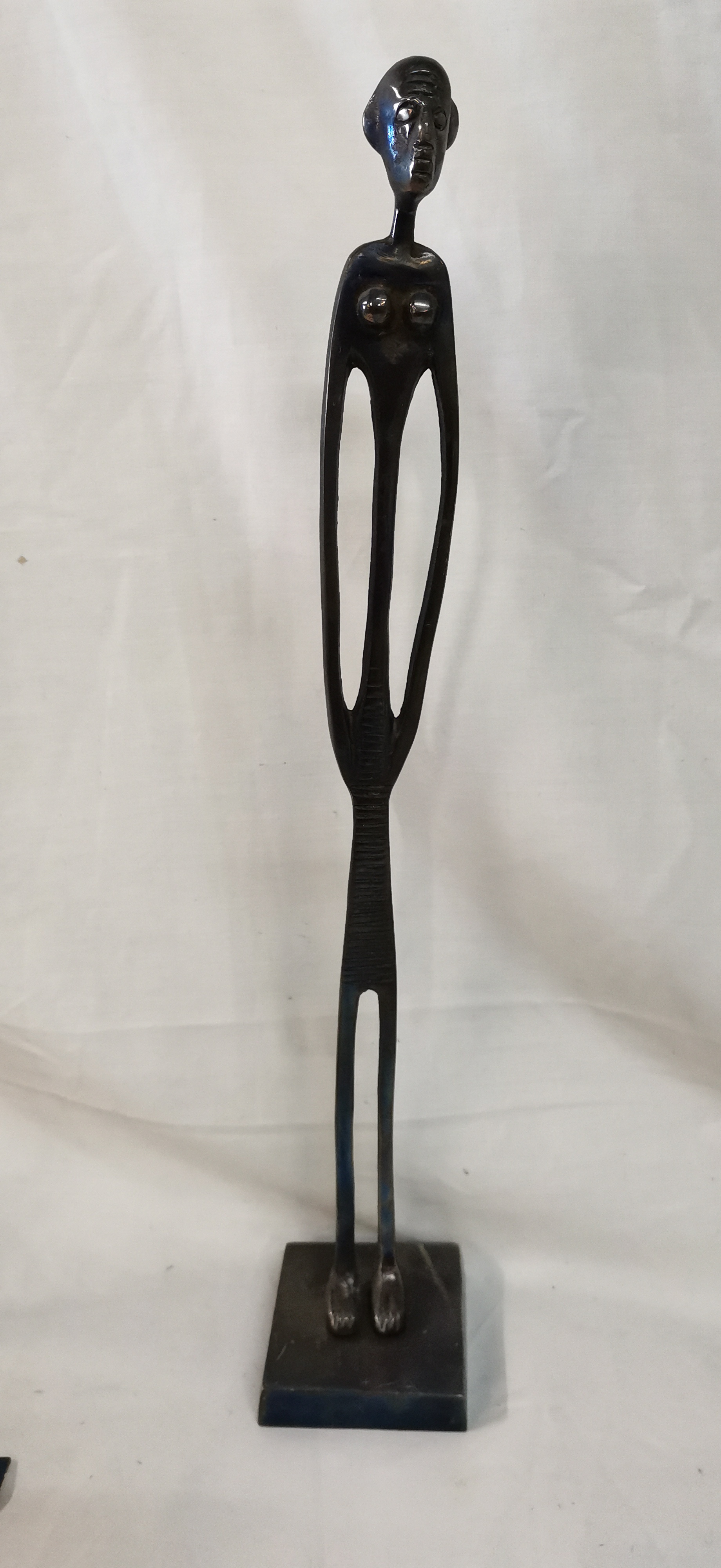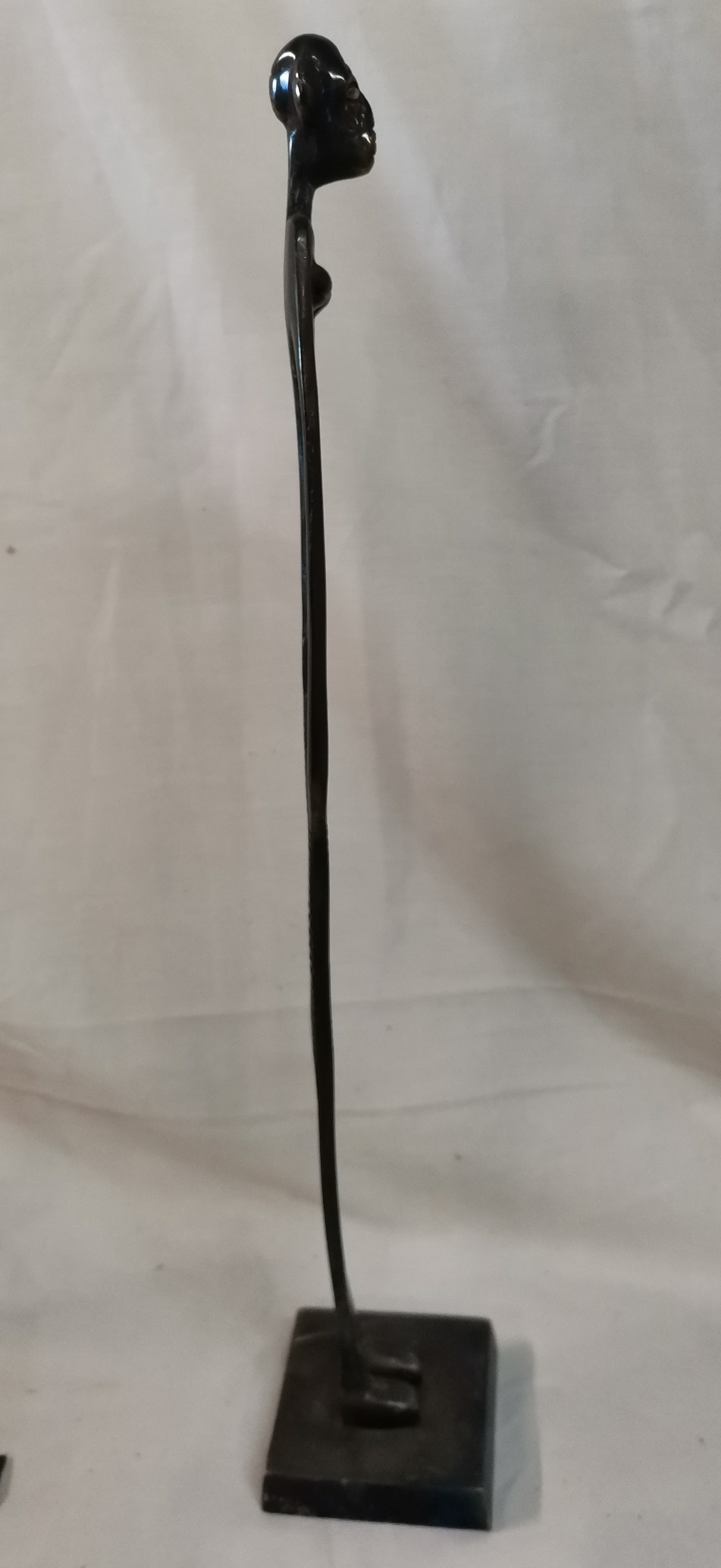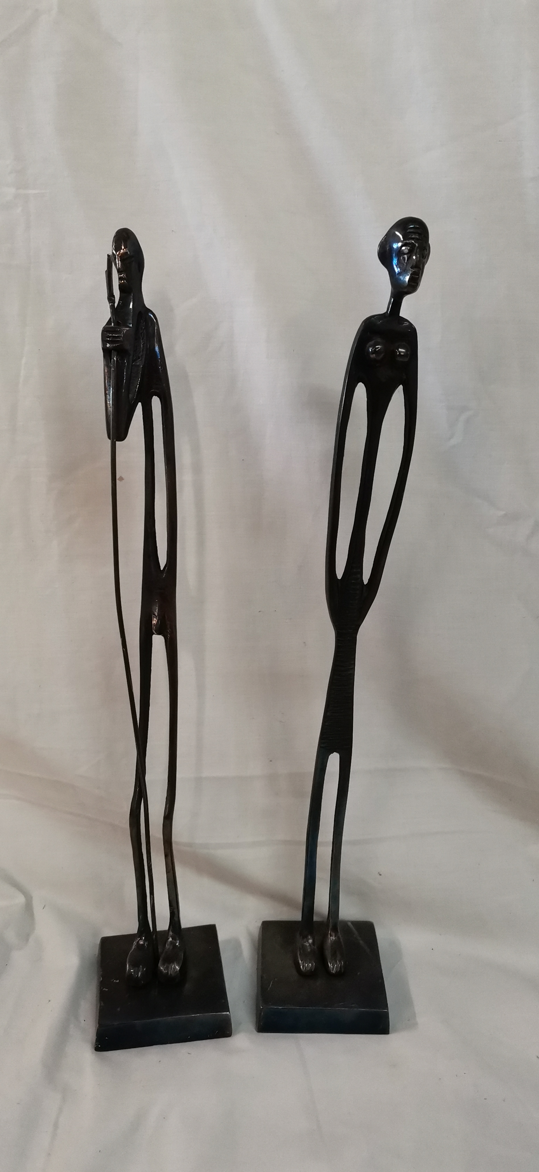 A pair of cast metal sculptures attributed to Pottery Barn from the Shadow of Tall Family collection. These modernist pieces depict two highly elongated, stylised human figures, consisting of a male figure holding a slender staff and a female figure. The works exhibit extremely attenuated limbs and torsos, reflecting a mid-20th-century modernist aesthetic influenced by West African sculptural traditions. Each figure is finished with a dark, near-black patina and is mounted onto a square, hollow-cast metal base. The figures are secured to their respective bases from below with two flat-head screws. No signatures, foundry marks, or edition numbers are present.