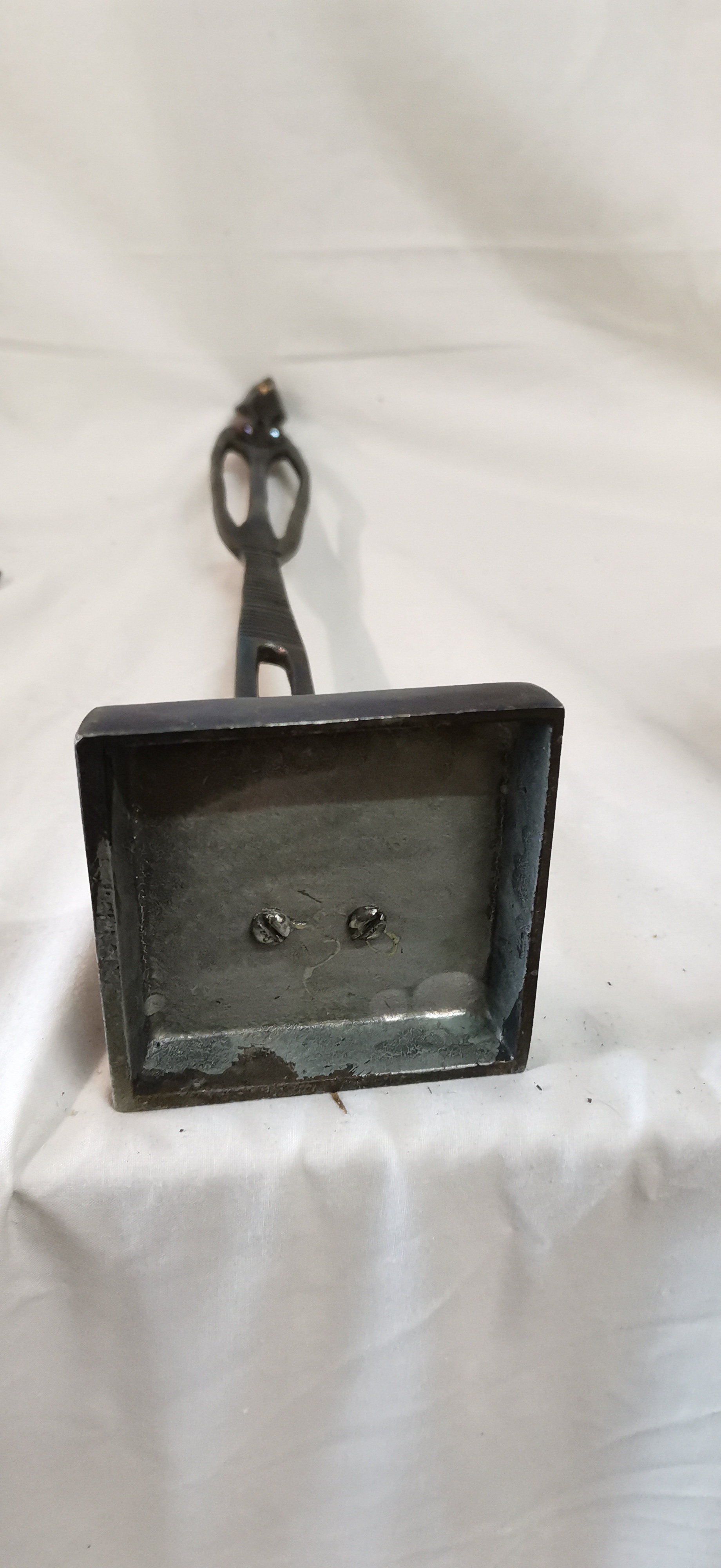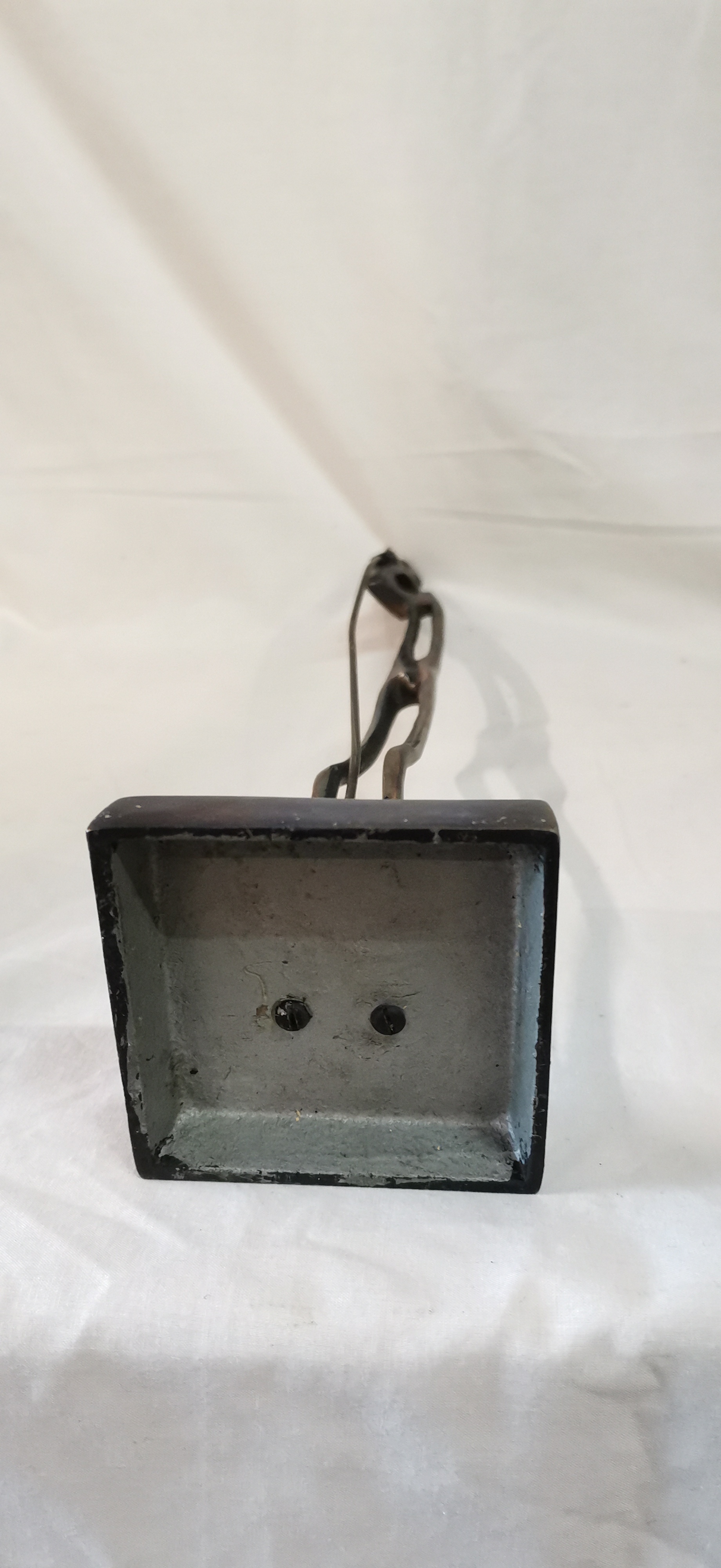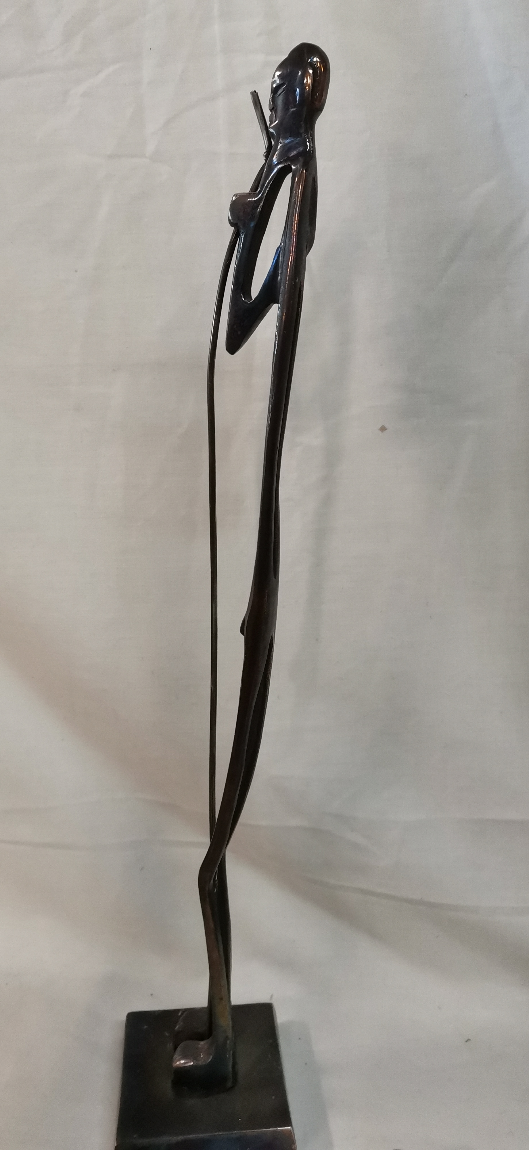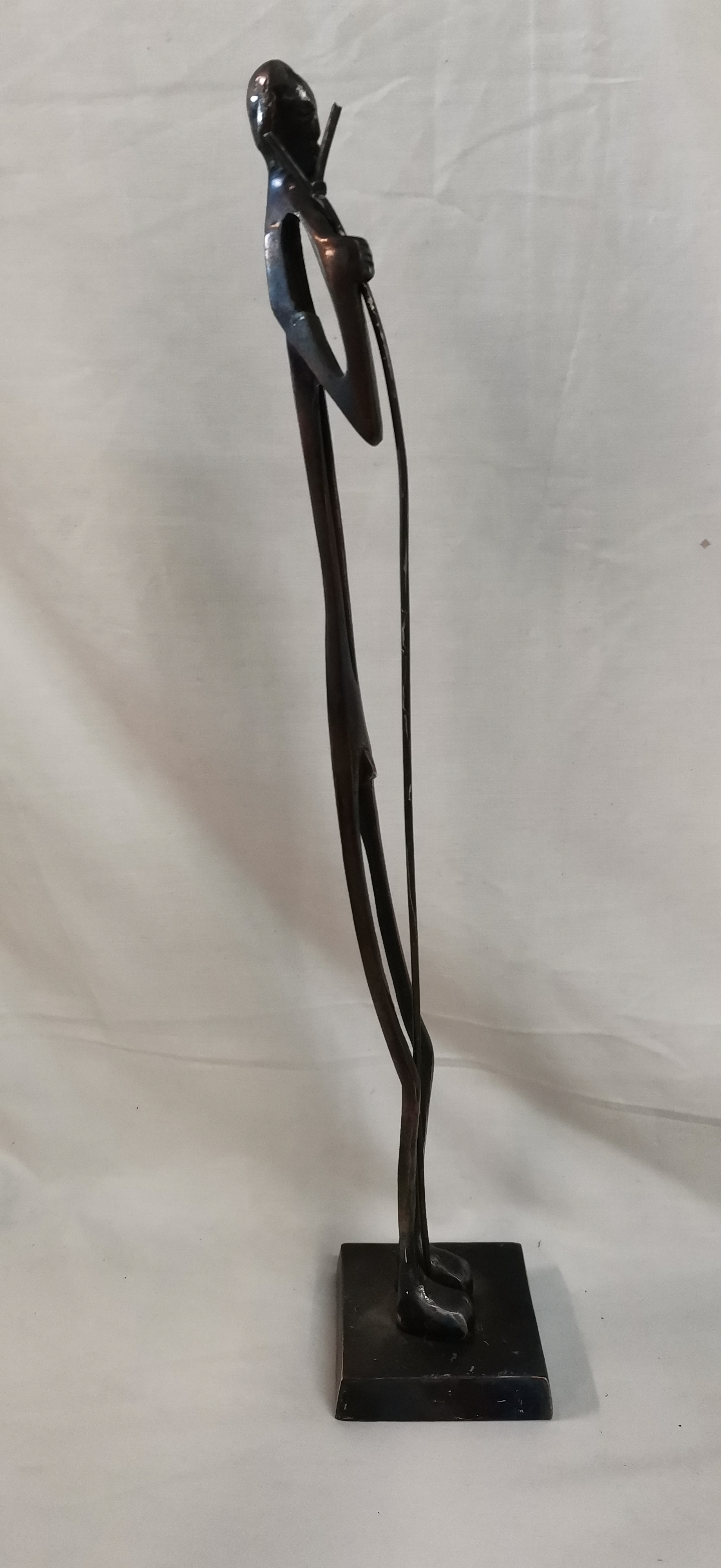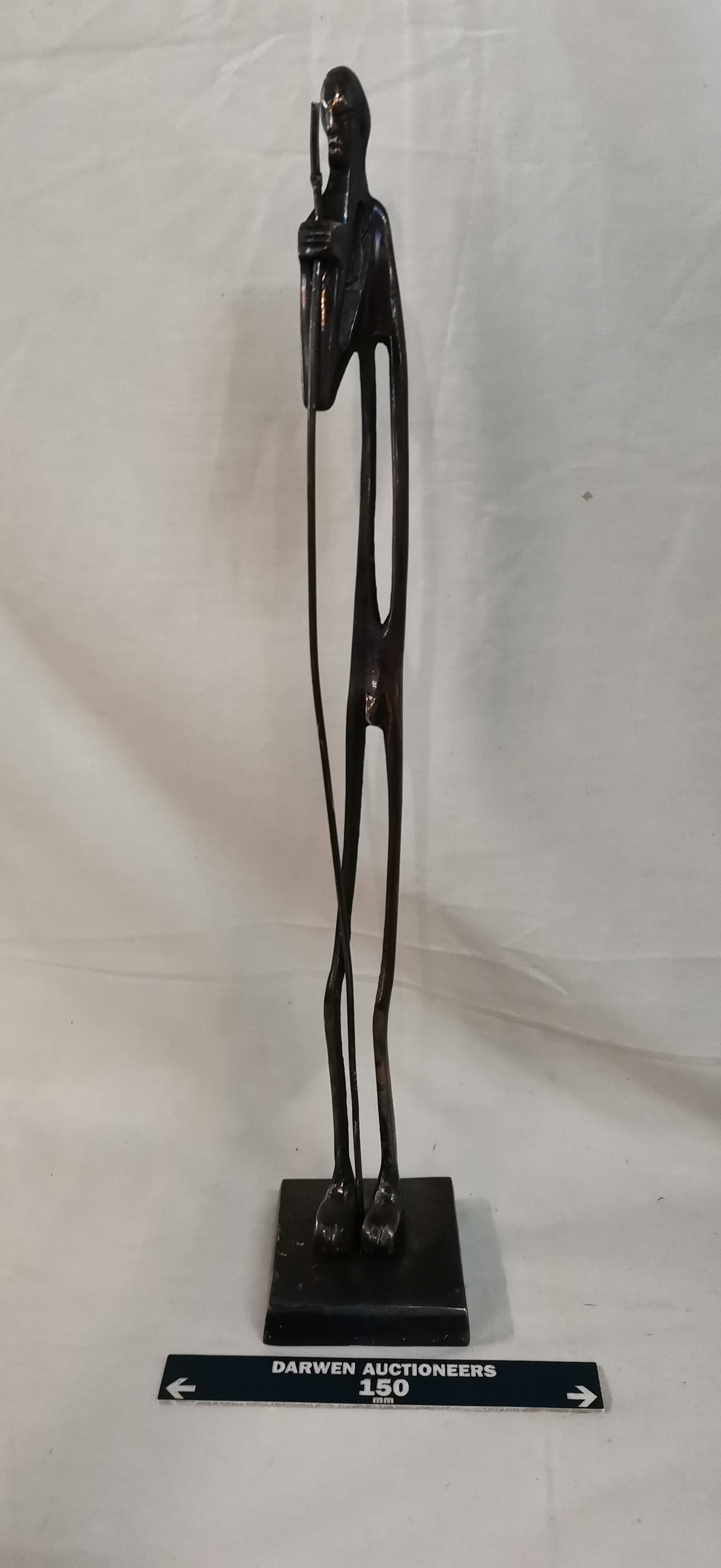 A pair of cast metal sculptures attributed to Pottery Barn from the Shadow of Tall Family collection. These modernist pieces depict two highly elongated, stylised human figures, consisting of a male figure holding a slender staff and a female figure. The works exhibit extremely attenuated limbs and torsos, reflecting a mid-20th-century modernist aesthetic influenced by West African sculptural traditions. Each figure is finished with a dark, near-black patina and is mounted onto a square, hollow-cast metal base. The figures are secured to their respective bases from below with two flat-head screws. No signatures, foundry marks, or edition numbers are present.