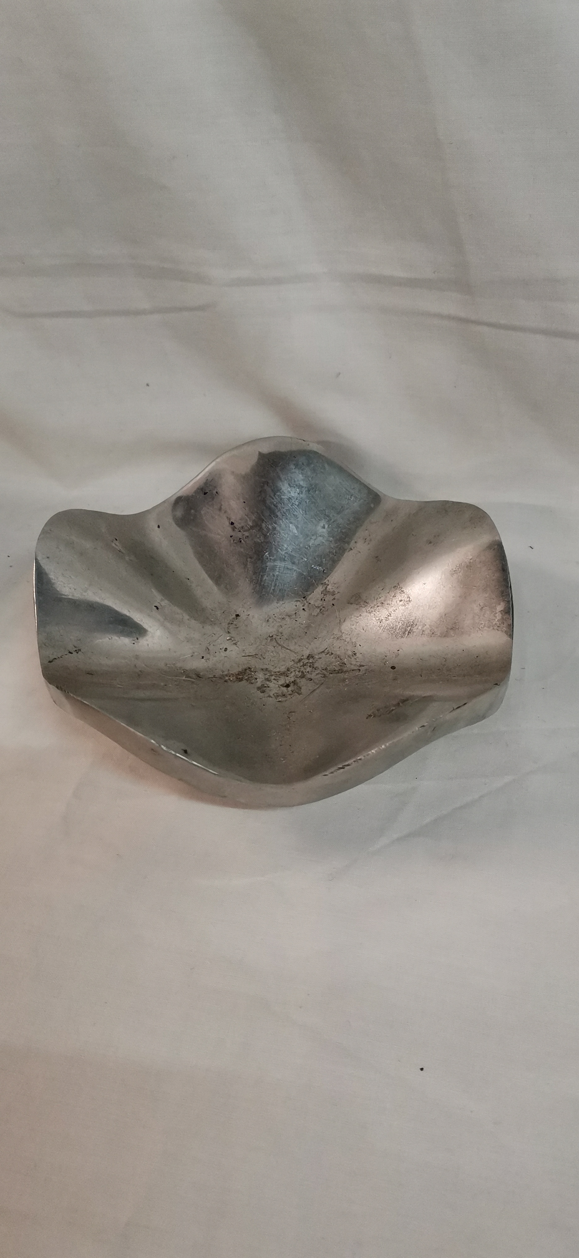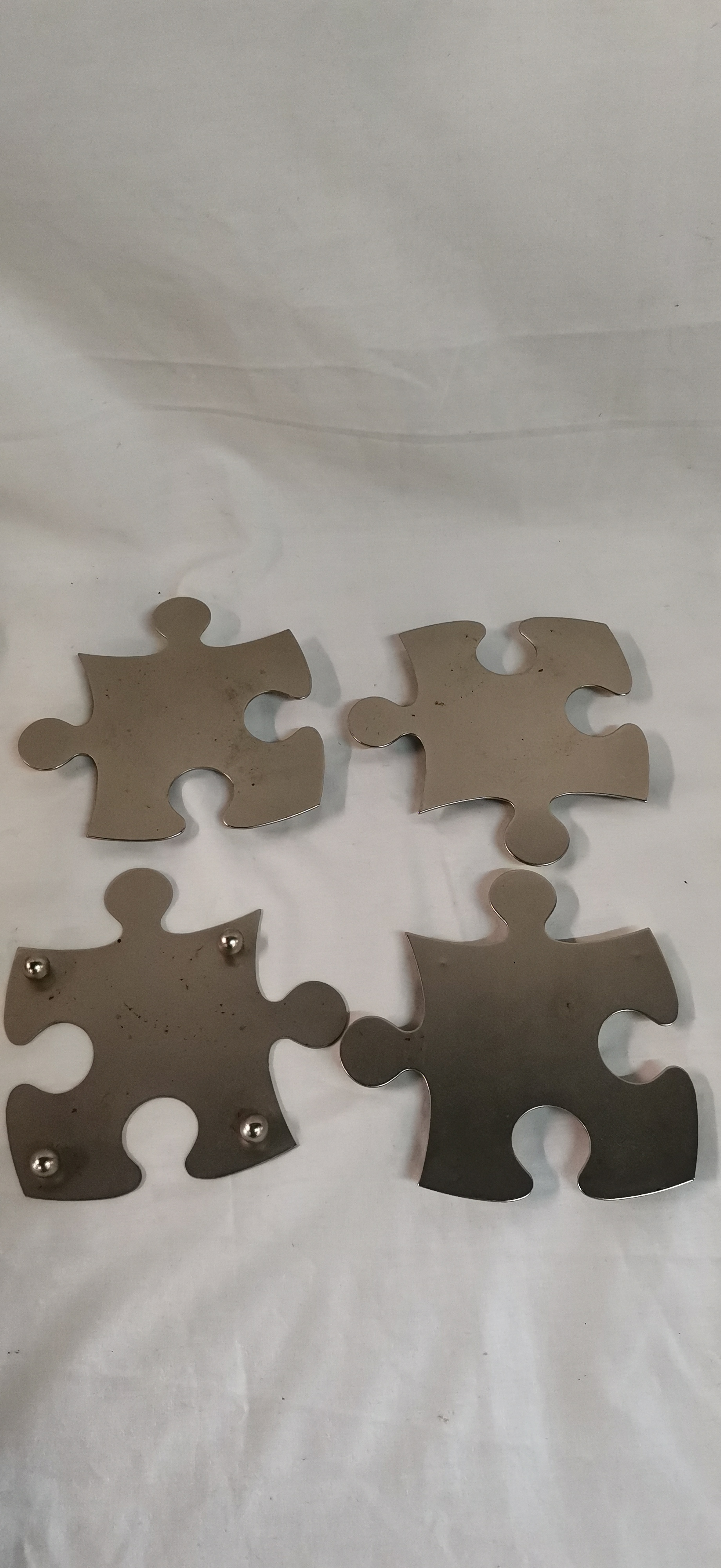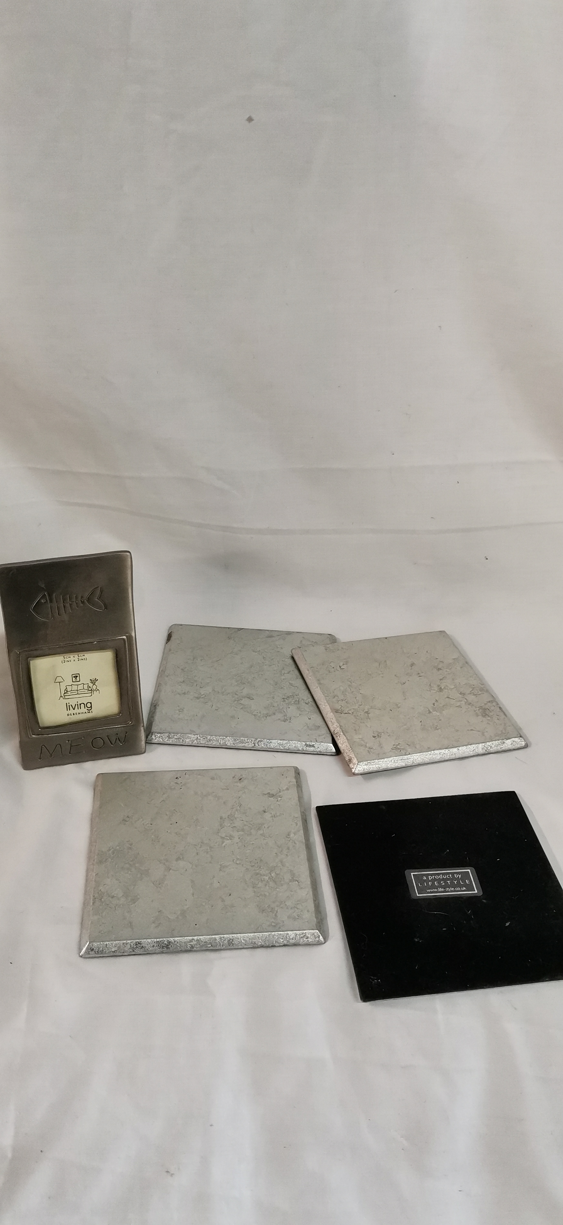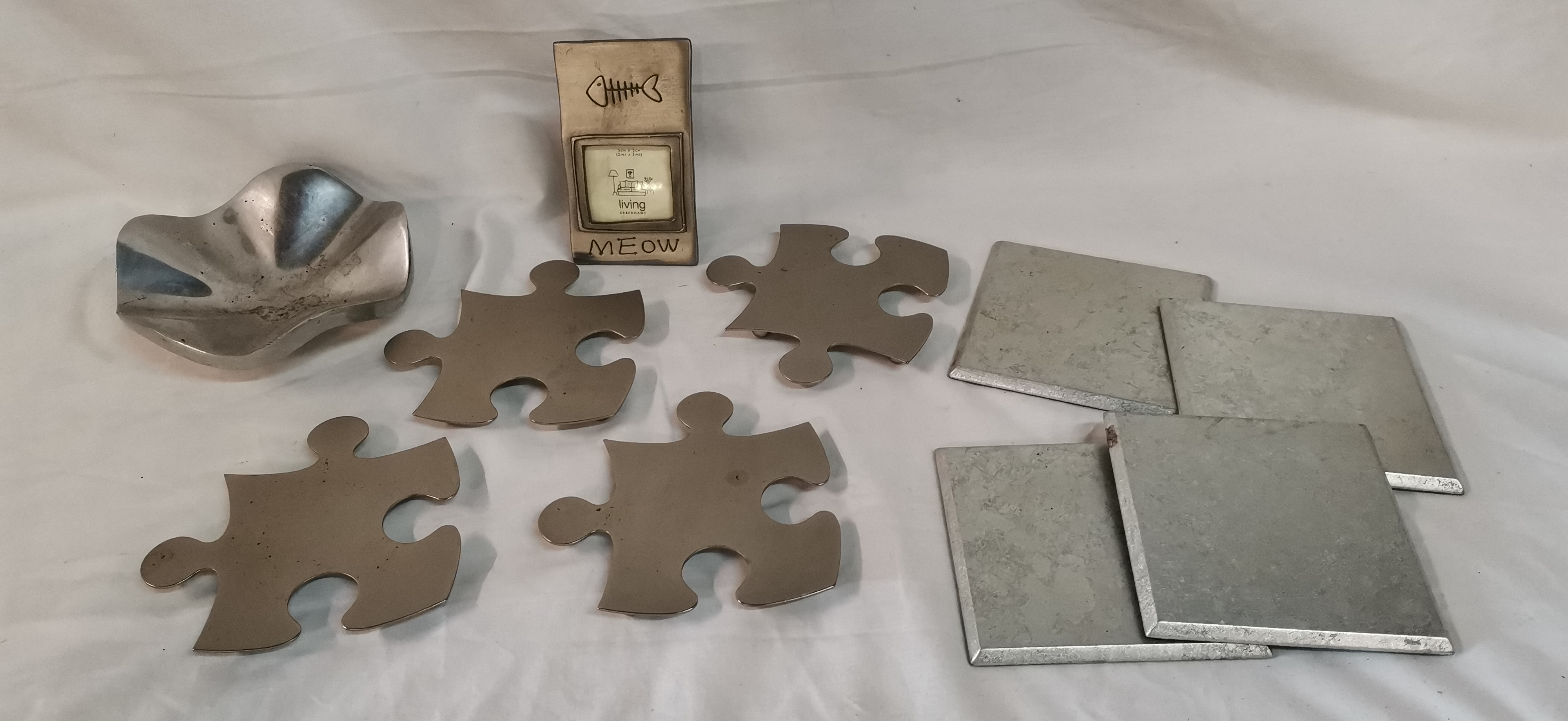 A collection of contemporary metal giftware and home accessories. The group includes a small decorative dish of organic, undulating form, cast in a silvery-grey metal with a matte finish. Also included is a miniature portrait-oriented photo frame in a pewter-toned metal, featuring an incised fish skeleton motif and the word MEOW, containing an original Living Debenhams paper insert. The collection further comprises a set of coasters in the shape of jigsaw puzzle pieces, manufactured from polished silvery metal and raised on spherical ball feet. Completing the lot is a set of square coasters with a mottled crystalline-textured surface and bevelled edges, featuring black felt-covered undersides. One square coaster retains a label for Lifestyle (www.life-style.co.uk).