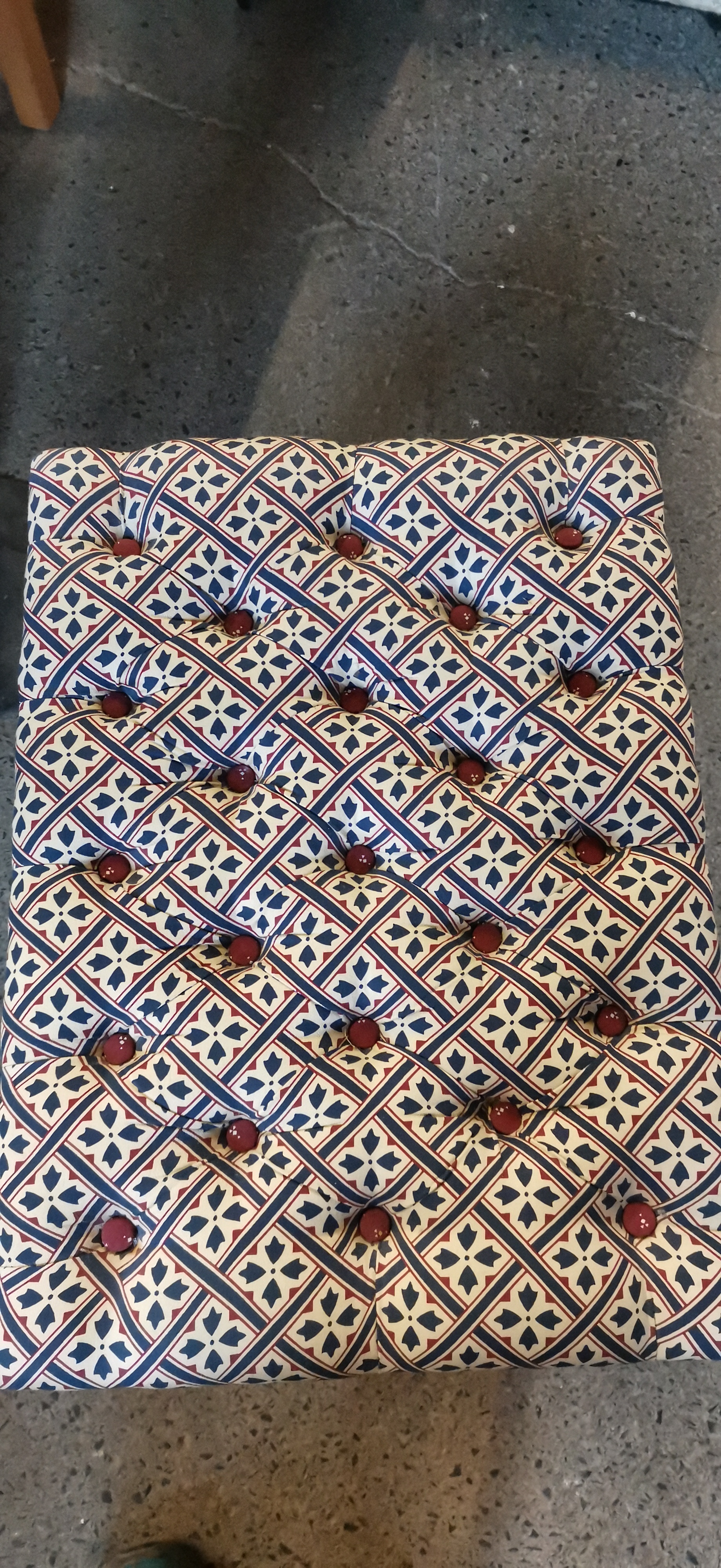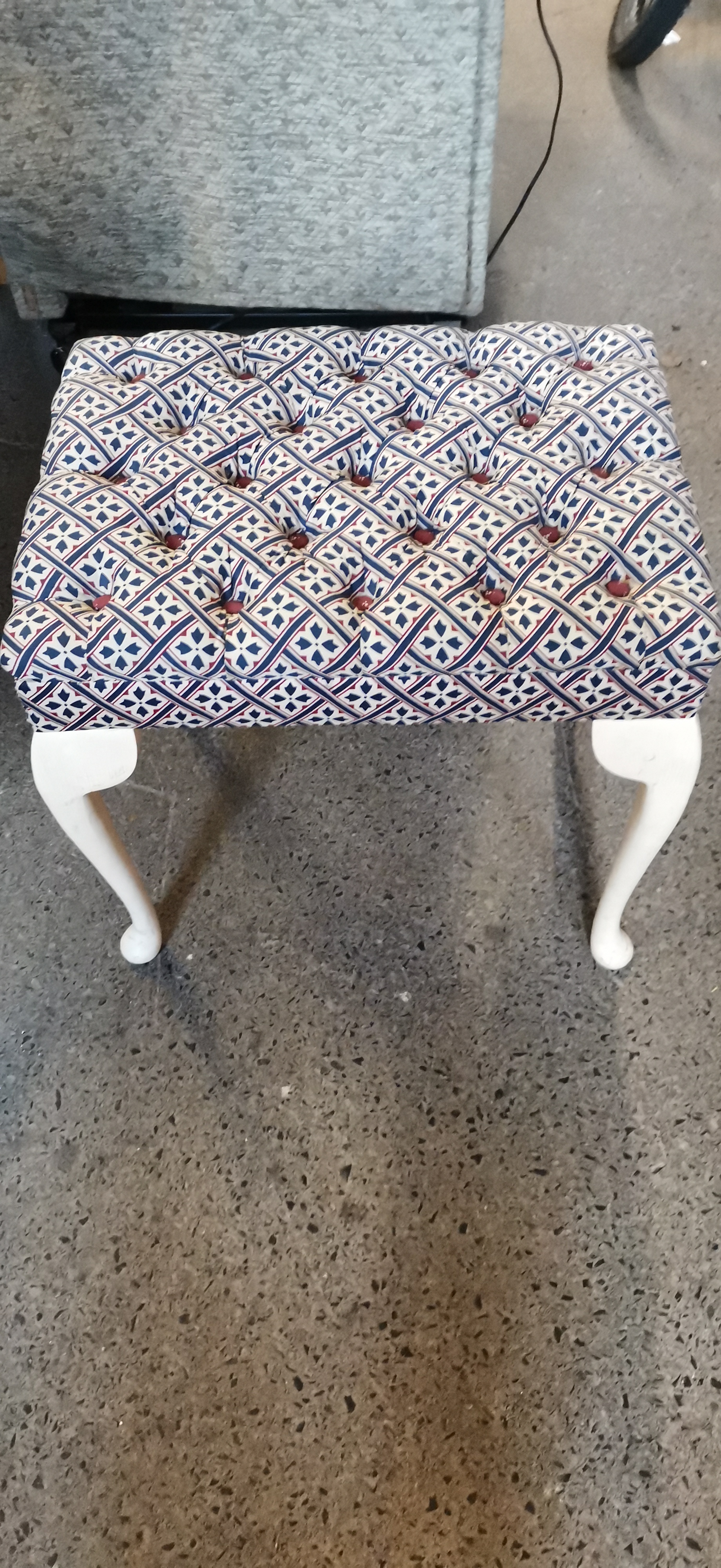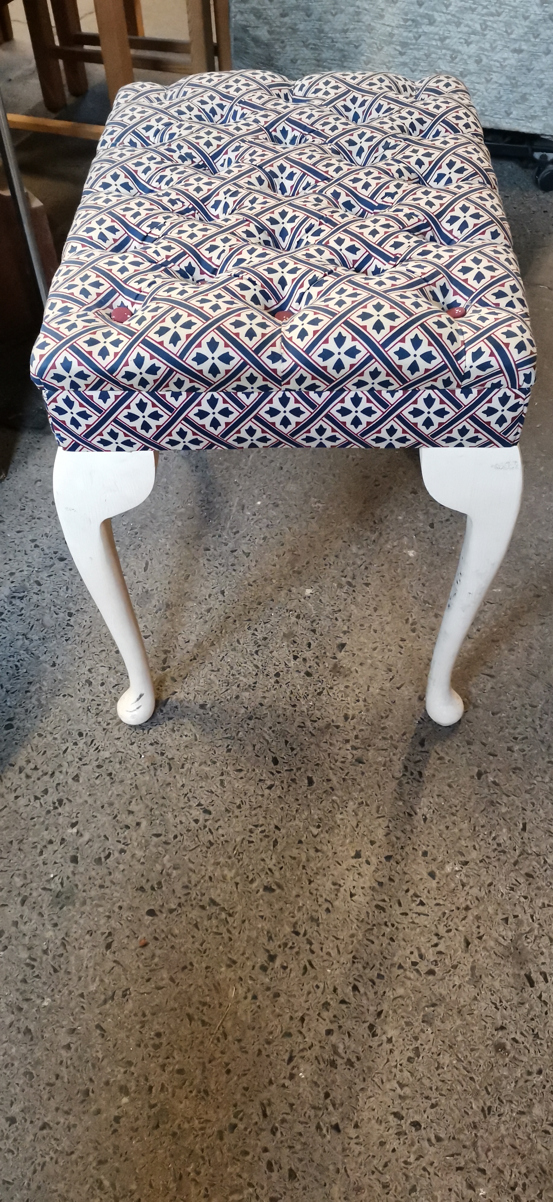 A rectangular dressing stool of 20th-century manufacture, designed in the Queen Anne style. The stool features a deep-buttoned tufted top finished with contrasting maroon-coloured buttons. It is upholstered in a modern fabric with a repeating geometric quatrefoil and lattice pattern in shades of navy blue, red, and white. The piece is supported on four cabriole legs ending in pad feet, with the wooden frame and legs finished in white paint.