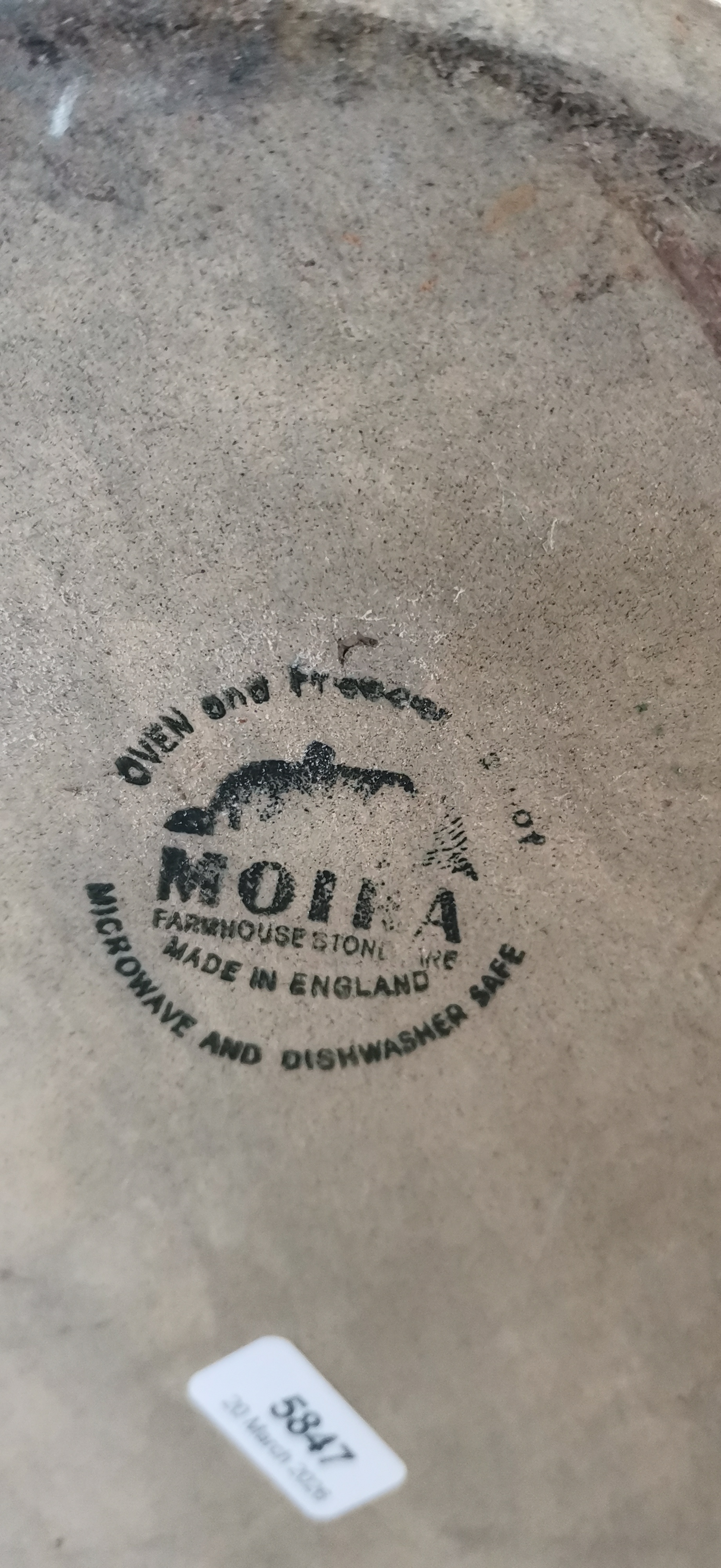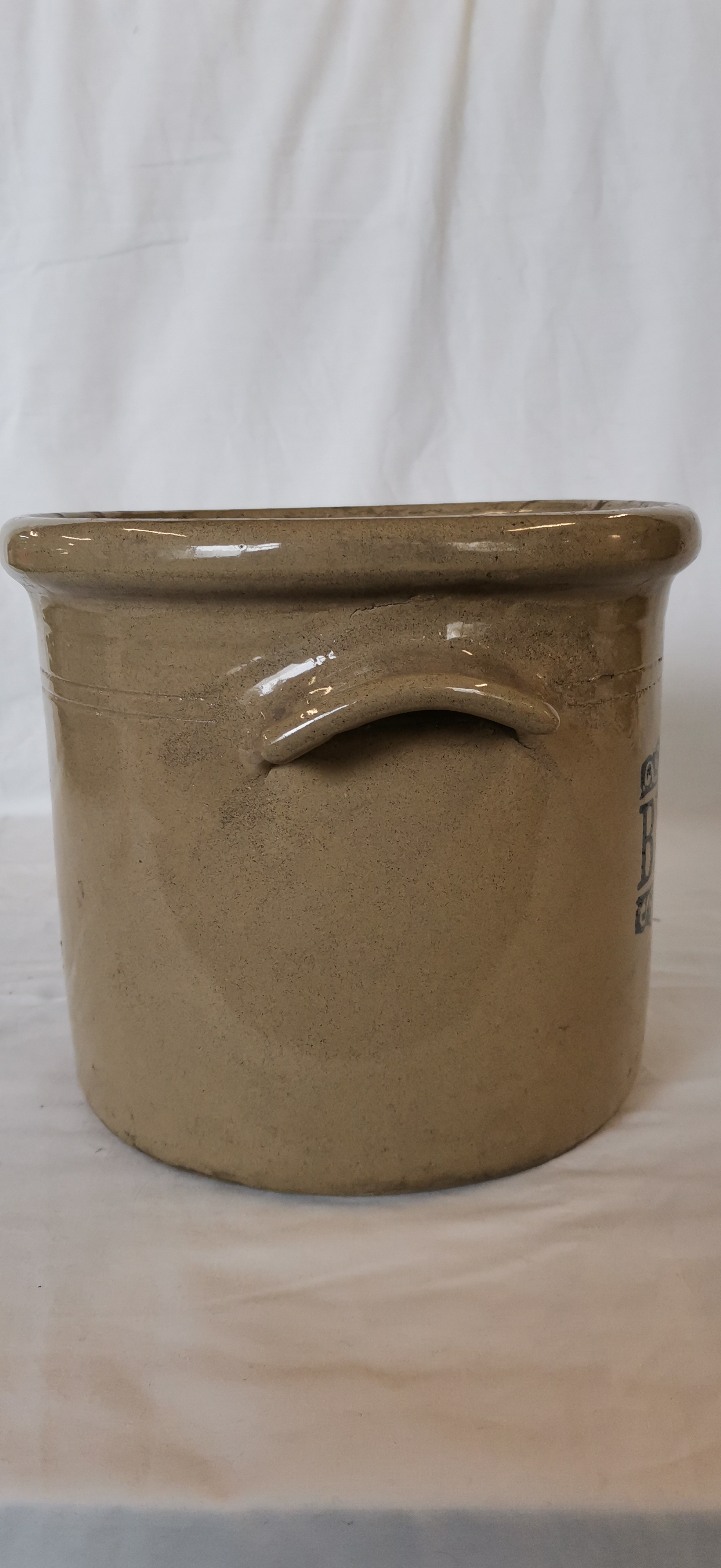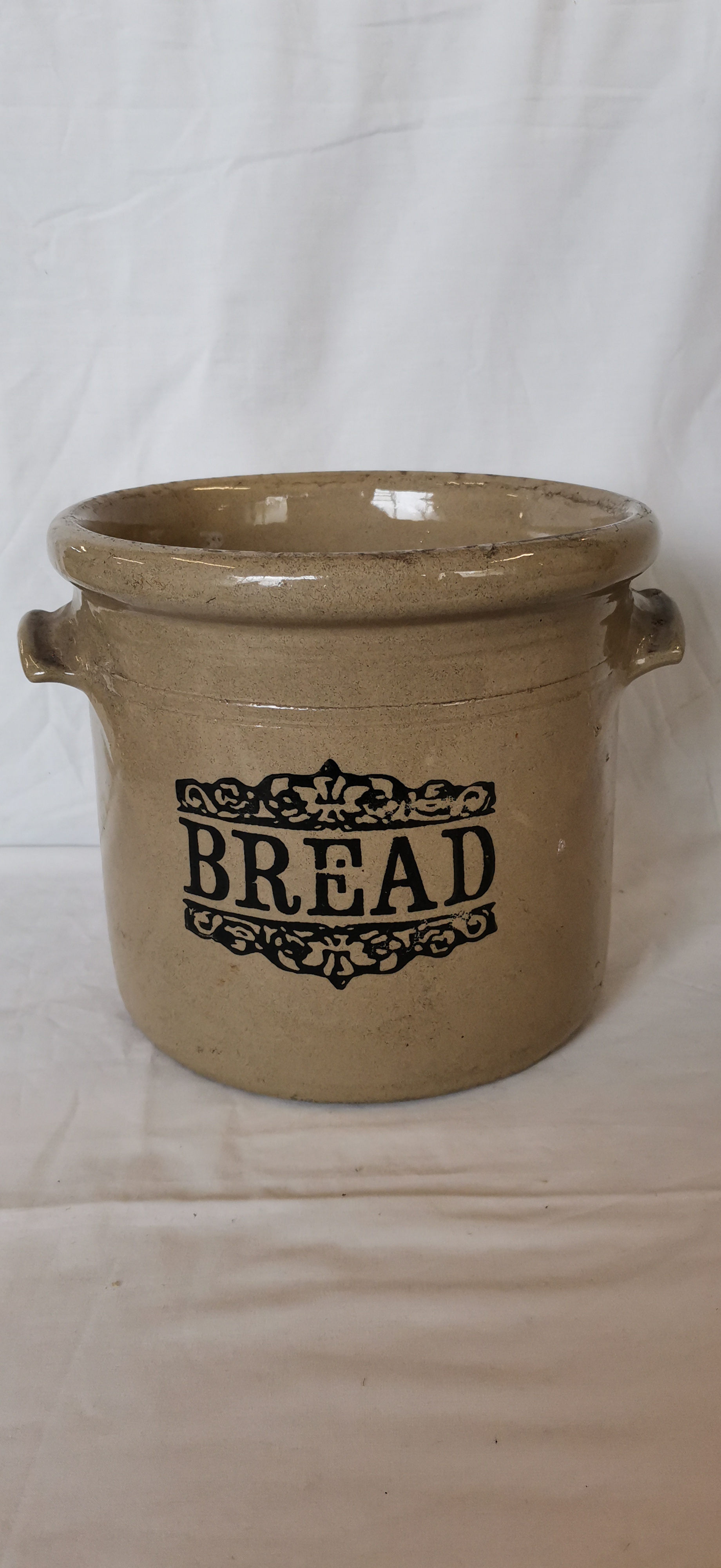 A large cylindrical stoneware bread crock produced by Moira Pottery, England. The vessel is finished in a light brown glaze both internally and externally. It features a thick rolled rim and two integral lug handles positioned on opposite sides. The front is decorated with a black transfer-printed label reading BREAD in bold serif capital letters, framed by an ornate scrolled border above and below. The base is unglazed and bears a circular black printed maker’s mark featuring a stylised bottle kiln graphic and the text MOIRA, FARMHOUSE STONEWARE, MADE IN ENGLAND. The mark also includes the instructions OVEN and freezer, and MICROWAVE AND DISHWASHER SAFE. The lid is not present.