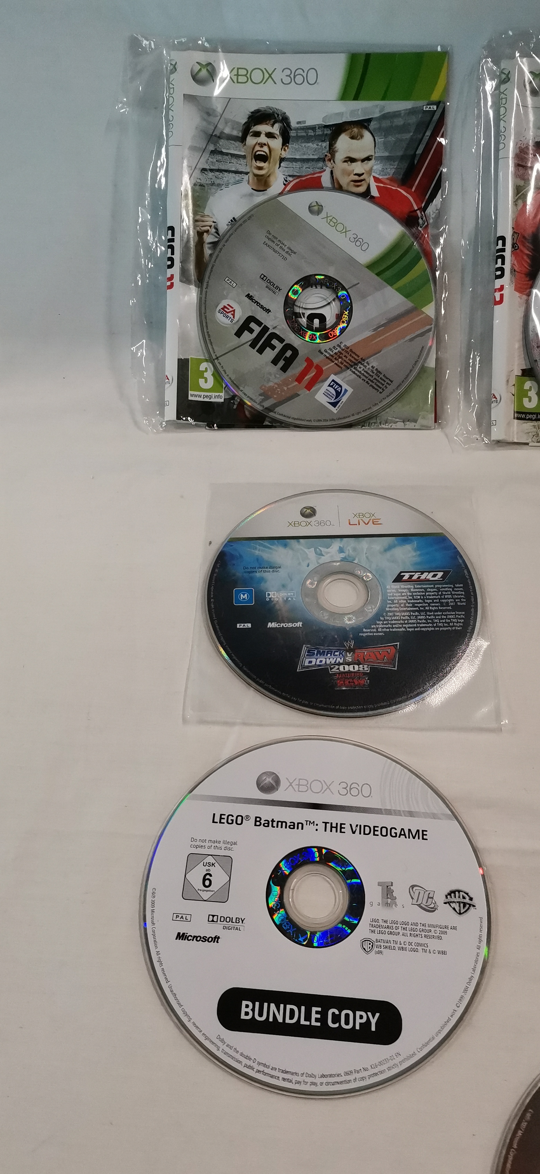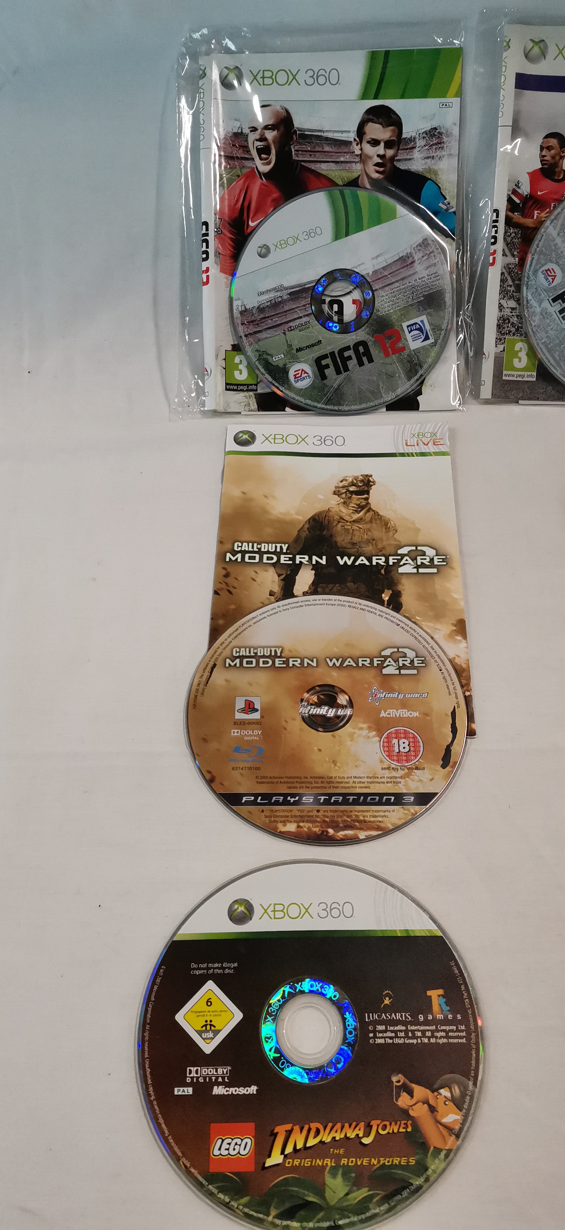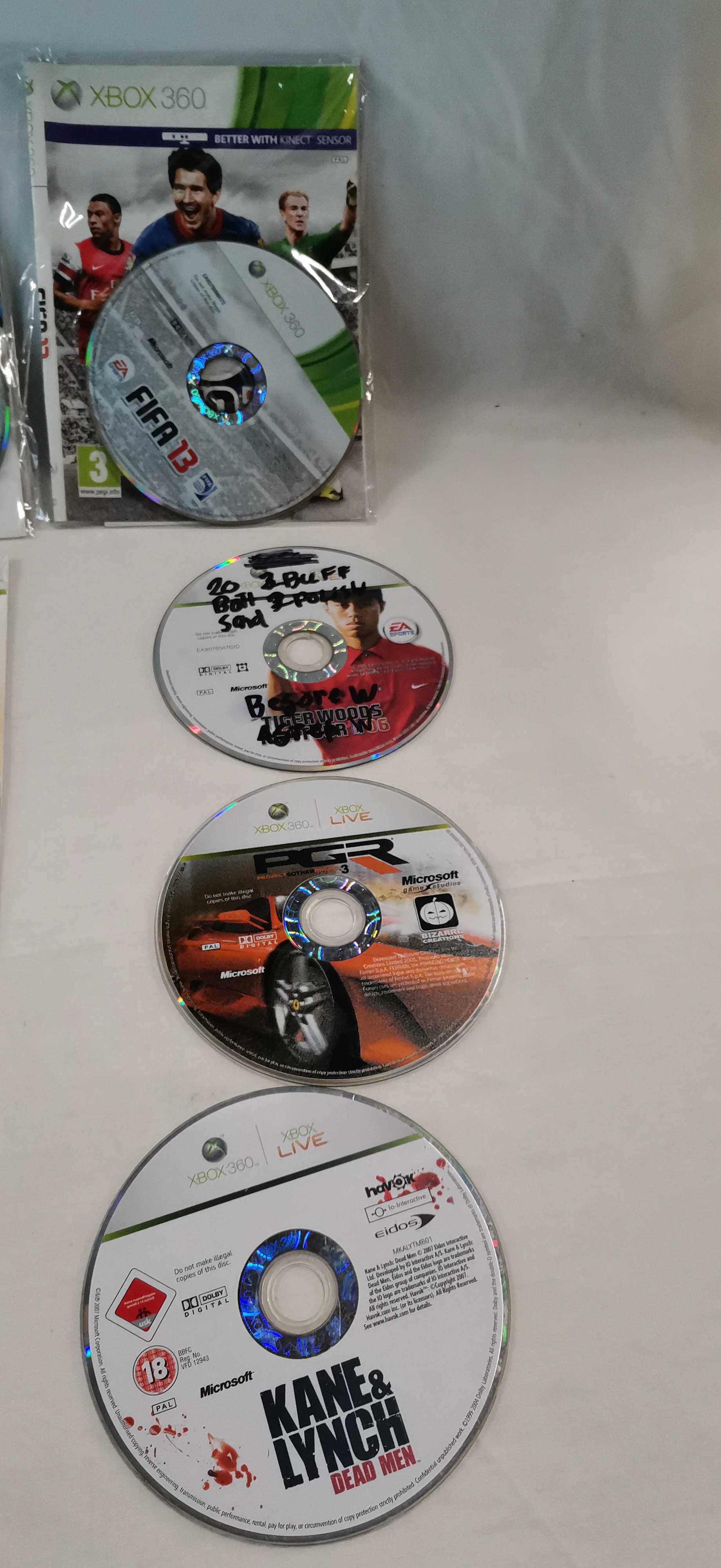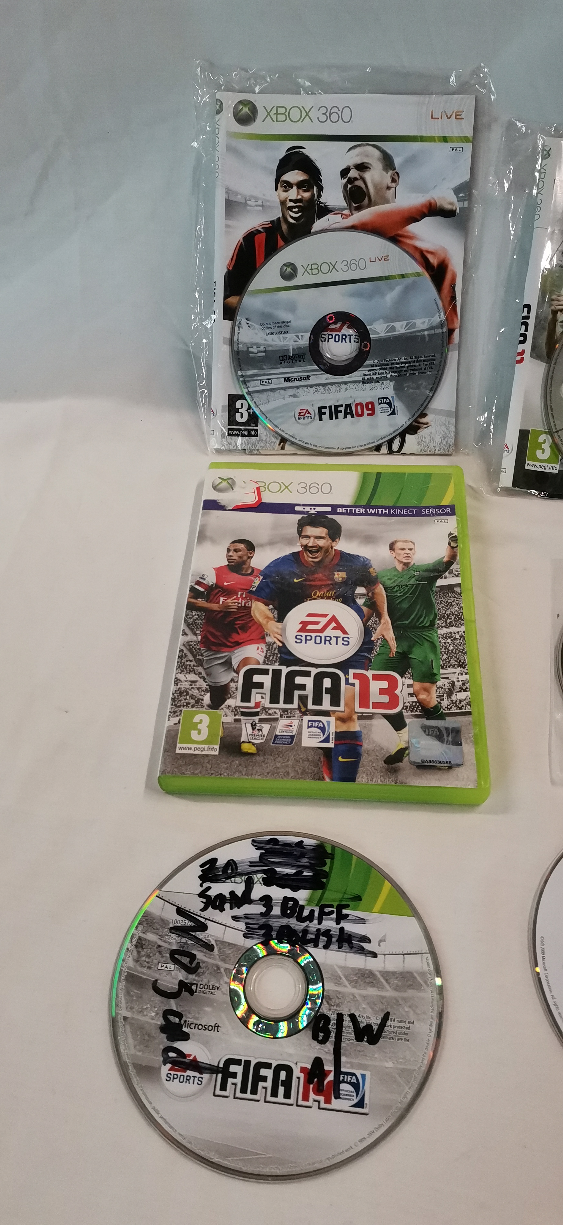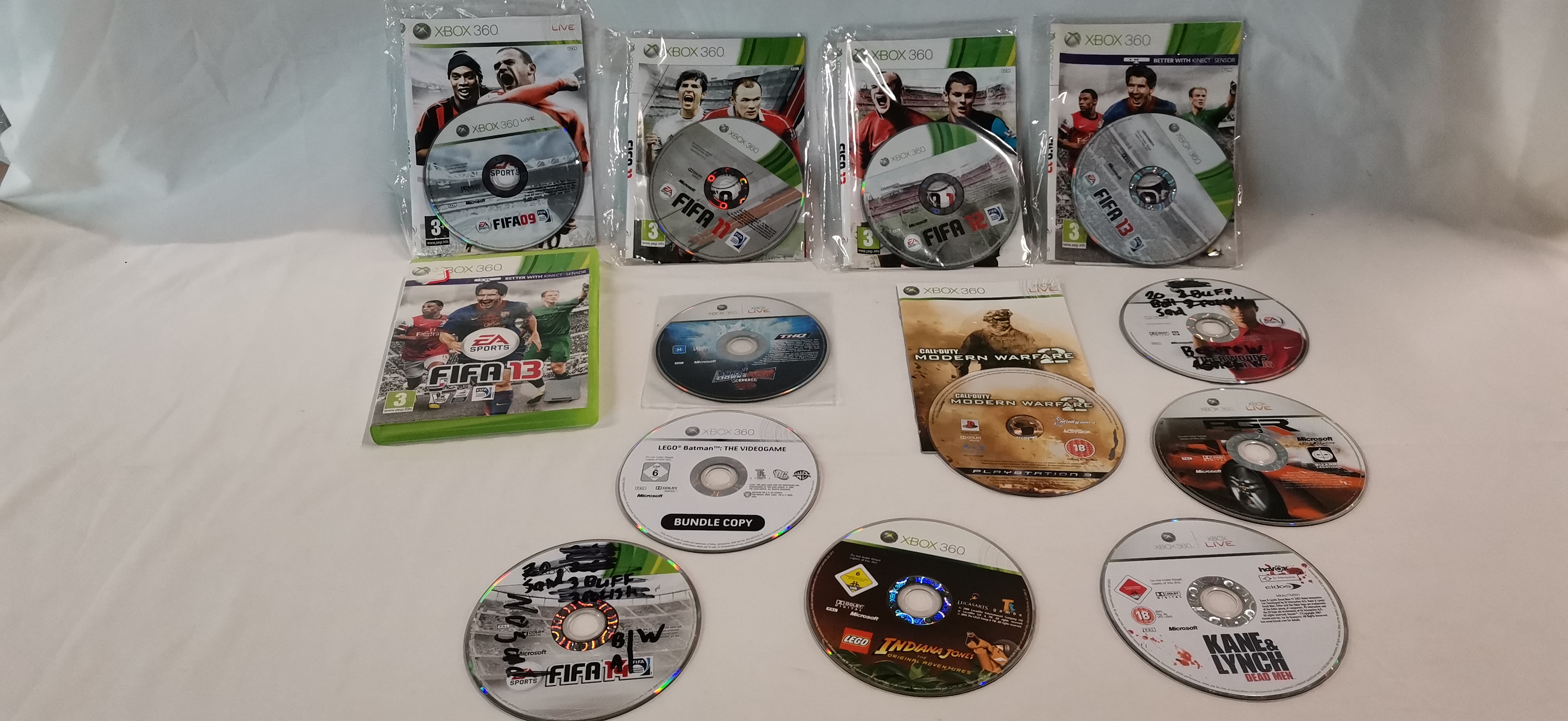 An assortment of video games primarily for the Microsoft Xbox 360 platform, with one title for the Sony PlayStation 3. The collection includes several iterations of the FIFA franchise, specifically FIFA 09, FIFA 11, FIFA 12, FIFA 13, and FIFA 14. Additional titles comprise Call of Duty: Modern Warfare 2 (PlayStation 3), LEGO Batman: The Videogame (Bundle Copy), LEGO Indiana Jones: The Original Adventures, Project Gotham Racing 3, Kane & Lynch: Dead Men, WWE SmackDown vs. Raw 2008, and Tiger Woods PGA Tour 06. The items consist of optical discs, with one copy of FIFA 13 housed in a standard green plastic retail case. Other discs are presented in paper sleeve inserts or as loose media. Several discs feature prominent handwritten notations in black permanent marker across the face, including text such as 3 BUFF 3 POLISH.
