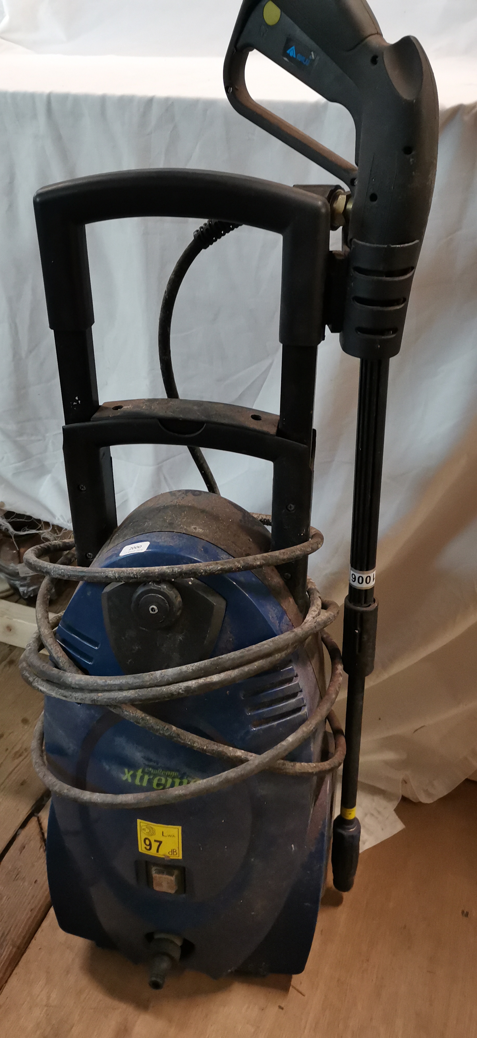 One Challenge Xtreme model ABW-VRB-90 electric pressure washer. The unit is housed in a blue and black plastic casing featuring an integrated transport handle and wheels. According to the manufacturer identification label, the equipment has a power rating of 1800W and operates on a 230V-240V~50Hz power supply, fitted with a standard UK three-pin plug. Performance specifications include an average operating pressure of 90bar (9MPa) and a maximum pressure of 135bar (13.5MPa), with a maximum flow rate of 360 L/h. The unit carries an IPX5 ingress protection rating and is CE marked. It is designed for a maximum input water temperature of 50 degrees Celsius. The lot includes a trigger-operated spray gun, a lance attachment, and a high-pressure hose.
