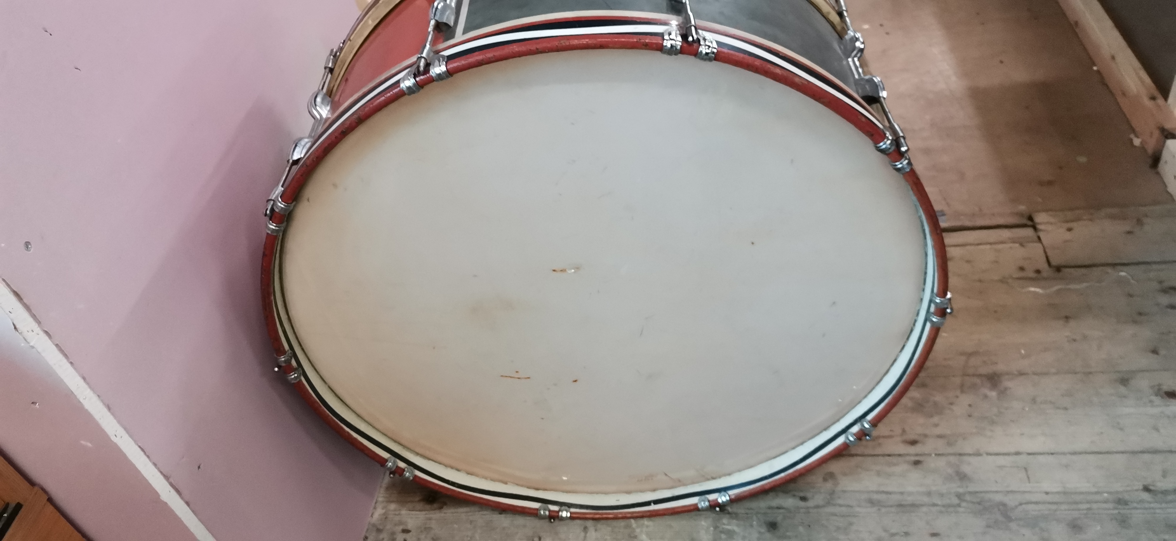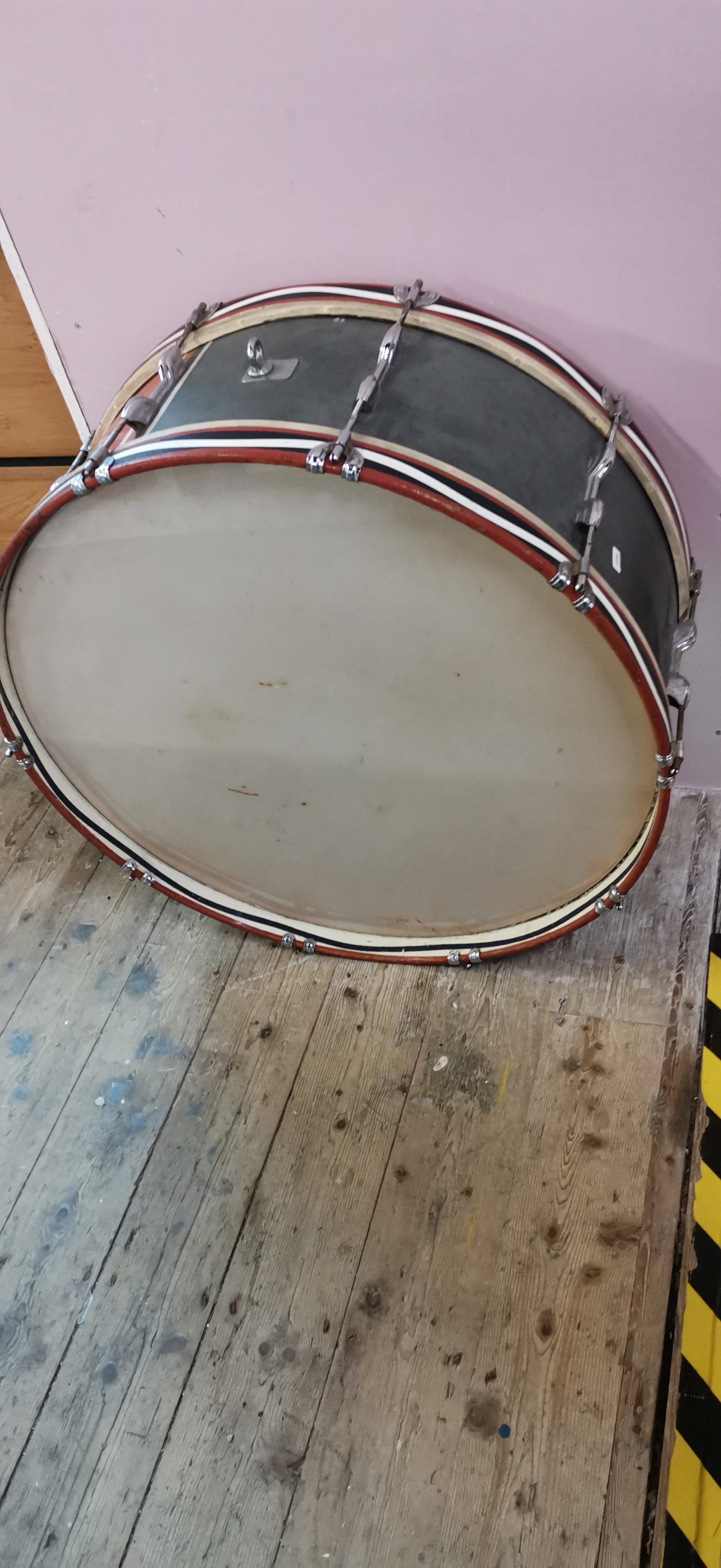 A large military pattern parade bass drum manufactured by Premier in England. The drum features a cylindrical shell finished in a dark grey-green colour, flanked by two wooden hoops. These hoops are decorated with a hand-painted wave pattern in red, white, and blue. The instrument is equipped with a series of chrome-plated metal tension rods and lugs. A rectangular chrome mounting plate is fixed to the shell, featuring an integrated carrying eye and stamped with the Premier script logo above the words MADE AND REGD IN ENGLAND. The drum is fitted with translucent heads on both sides. A small white adhesive inventory sticker bearing the number 12707 is attached to the shell.