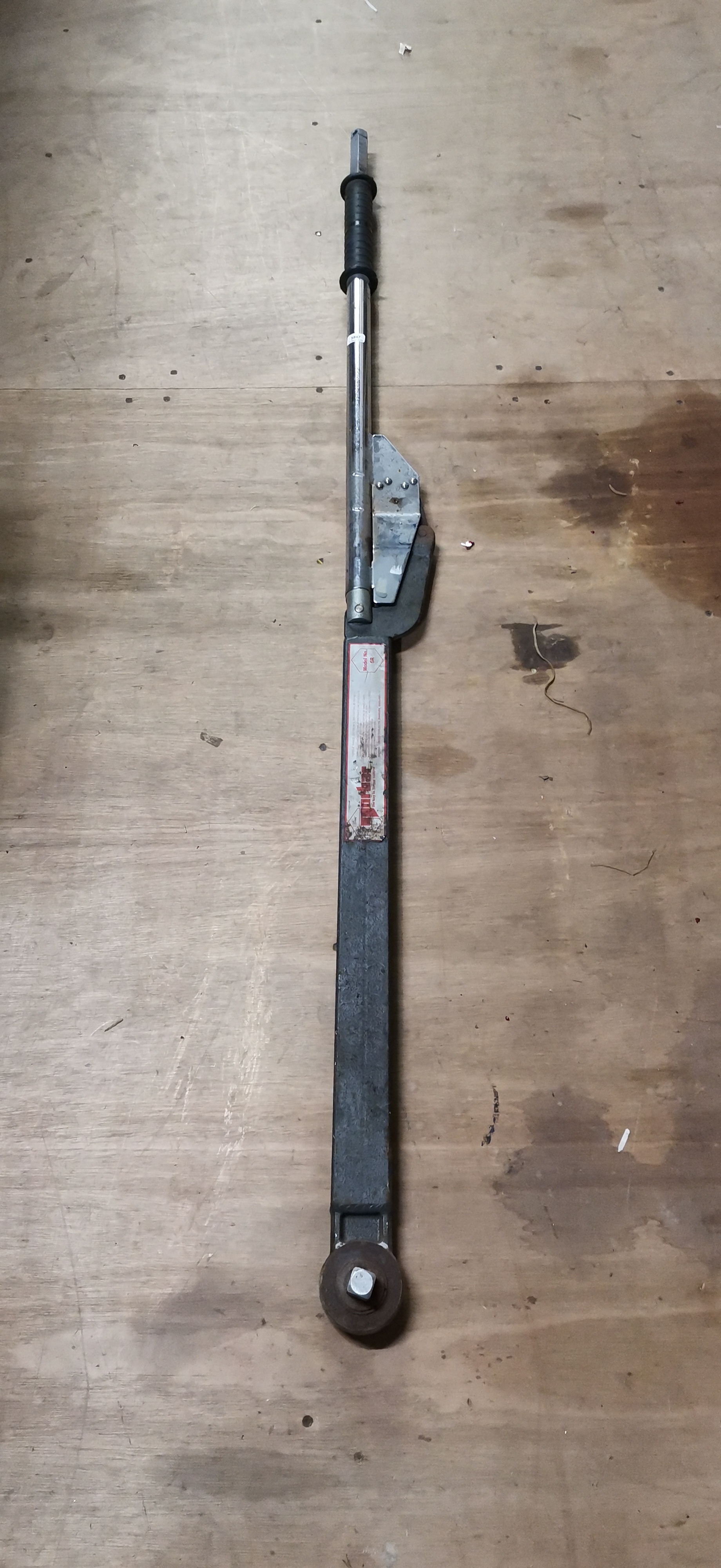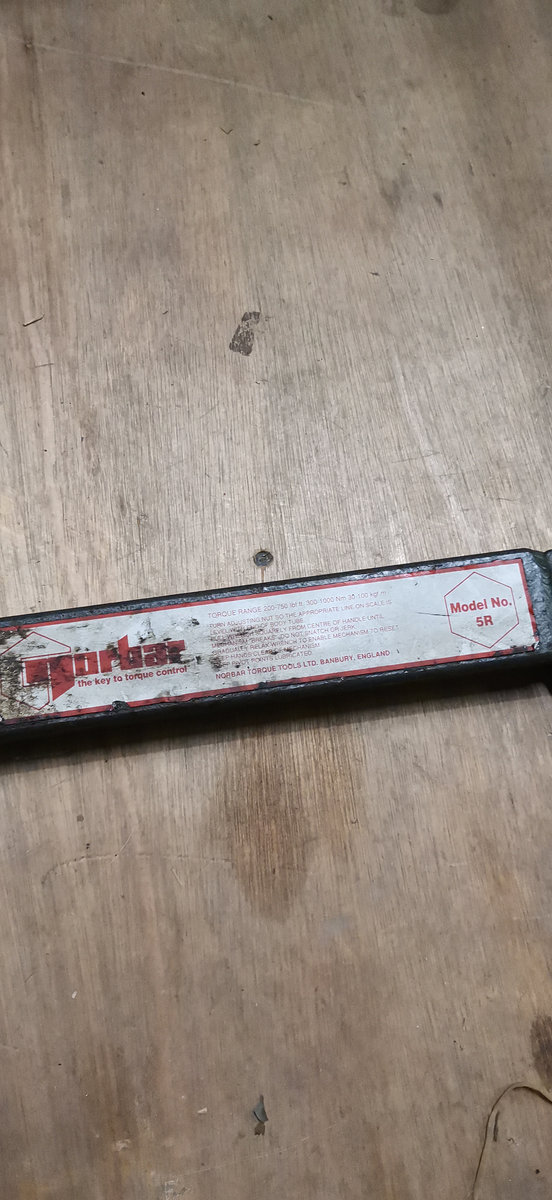 A Norbar Torque Tools Ltd. Model 5R industrial torque wrench of break-back design. The tool is constructed with a heavy-duty cast and forged steel body featuring a dark finish, paired with a chrome-plated steel handle extension and a black ribbed rubber grip. A manufacturer’s label is affixed to the main body, displaying the red and white Norbar logo and the phrase the key to torque control. The label identifies the tool as Model No. 5R and lists the torque range as 200-750 lbf.ft, 300-1000 N.m, and 30-100 kgf.m. Detailed operating instructions are printed on the label, which also attributes the manufacture to Norbar Torque Tools Ltd. of Banbury, England. The wrench includes an integrated square drive and a secondary handle attachment point.