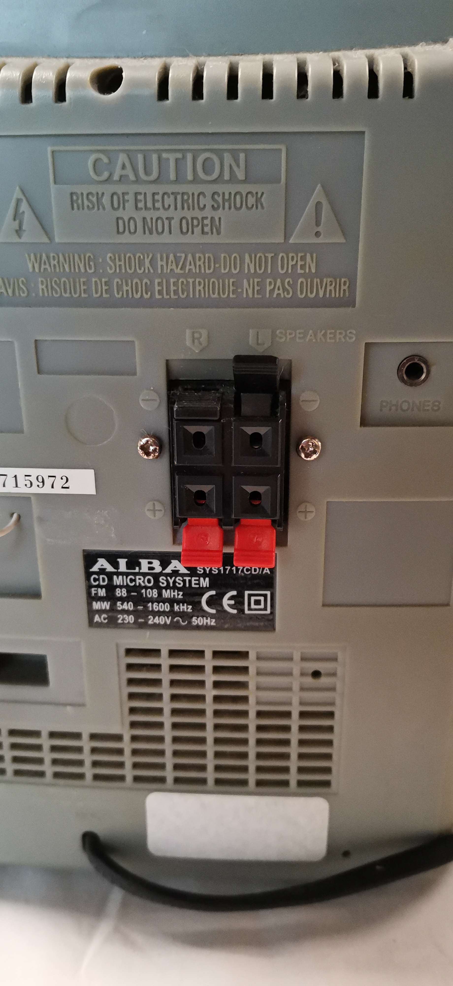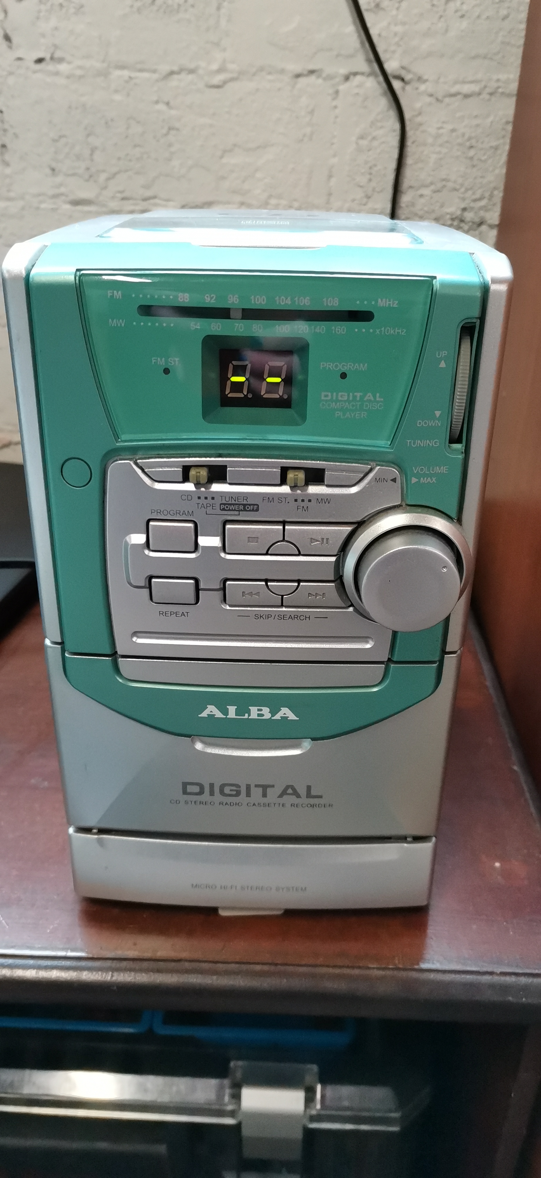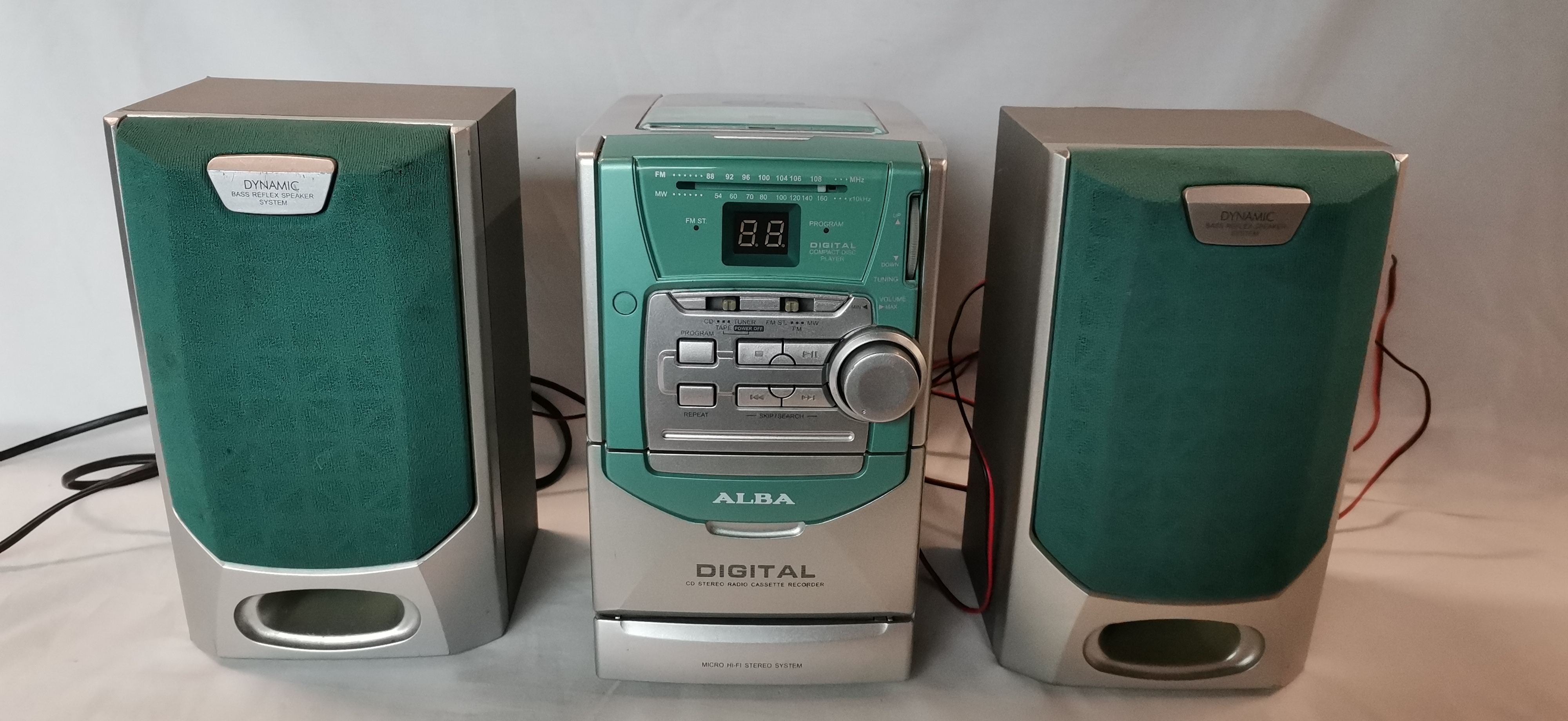 An Alba SYS1717CD/A micro hi-fi stereo system comprising a central unit and a pair of matching speakers. The system is constructed from silver and teal green moulded plastic. The central unit features a top-loading compact disc player, an integrated cassette tape recorder and player, and an FM/MW radio tuner. The front panel includes a two-digit green LED display for track information, an analogue tuning scale, a rotary volume control, and various playback buttons including program, repeat, and skip/search. The speakers are of a bass reflex design with teal fabric grilles. The rear of the unit is fitted with spring-clip speaker terminals and a 3.5mm headphone jack. Markings include the Alba brand name on the front and a rear identification label stating model SYS1717CD/A, FM 88 – 108 MHz, MW 540 – 1600 kHz, and AC 230 – 240V ~ 50Hz.