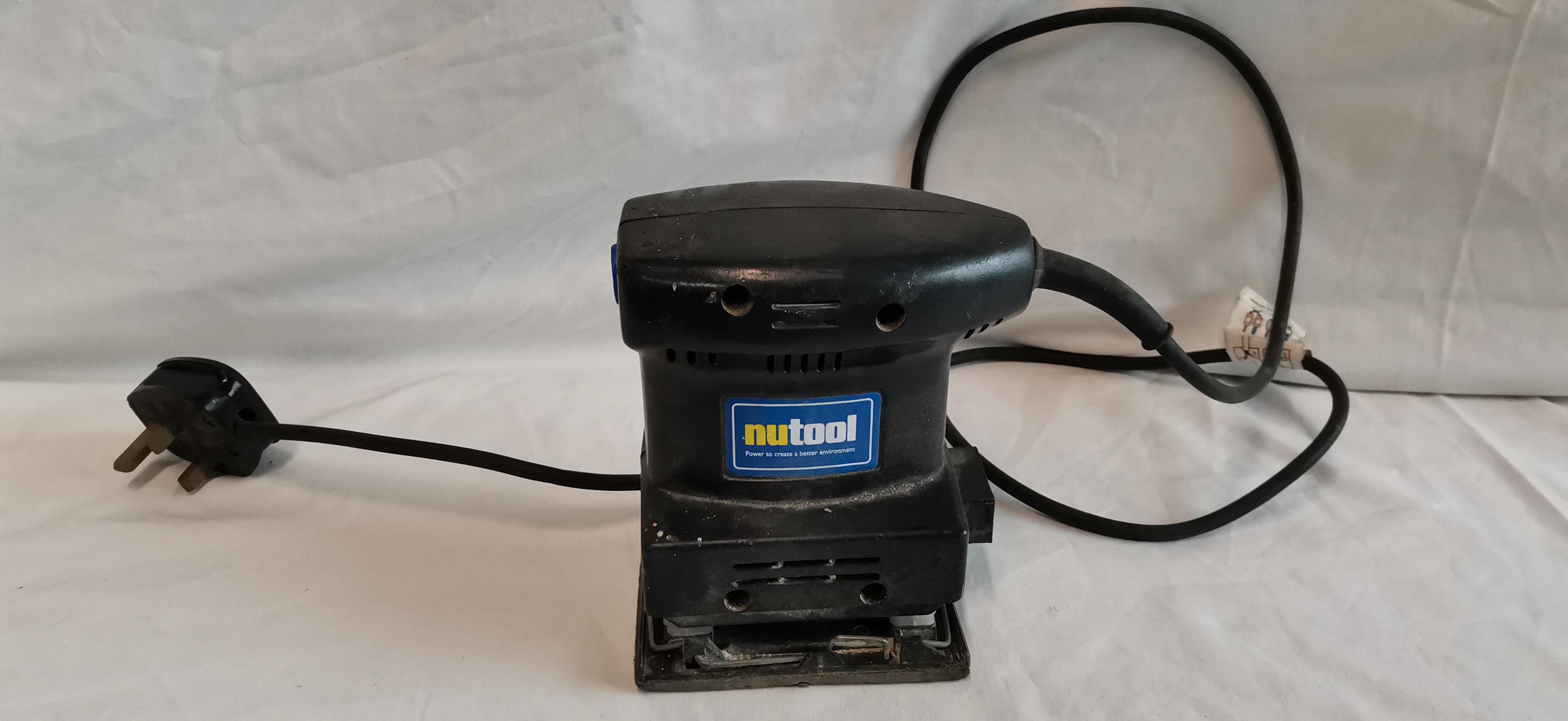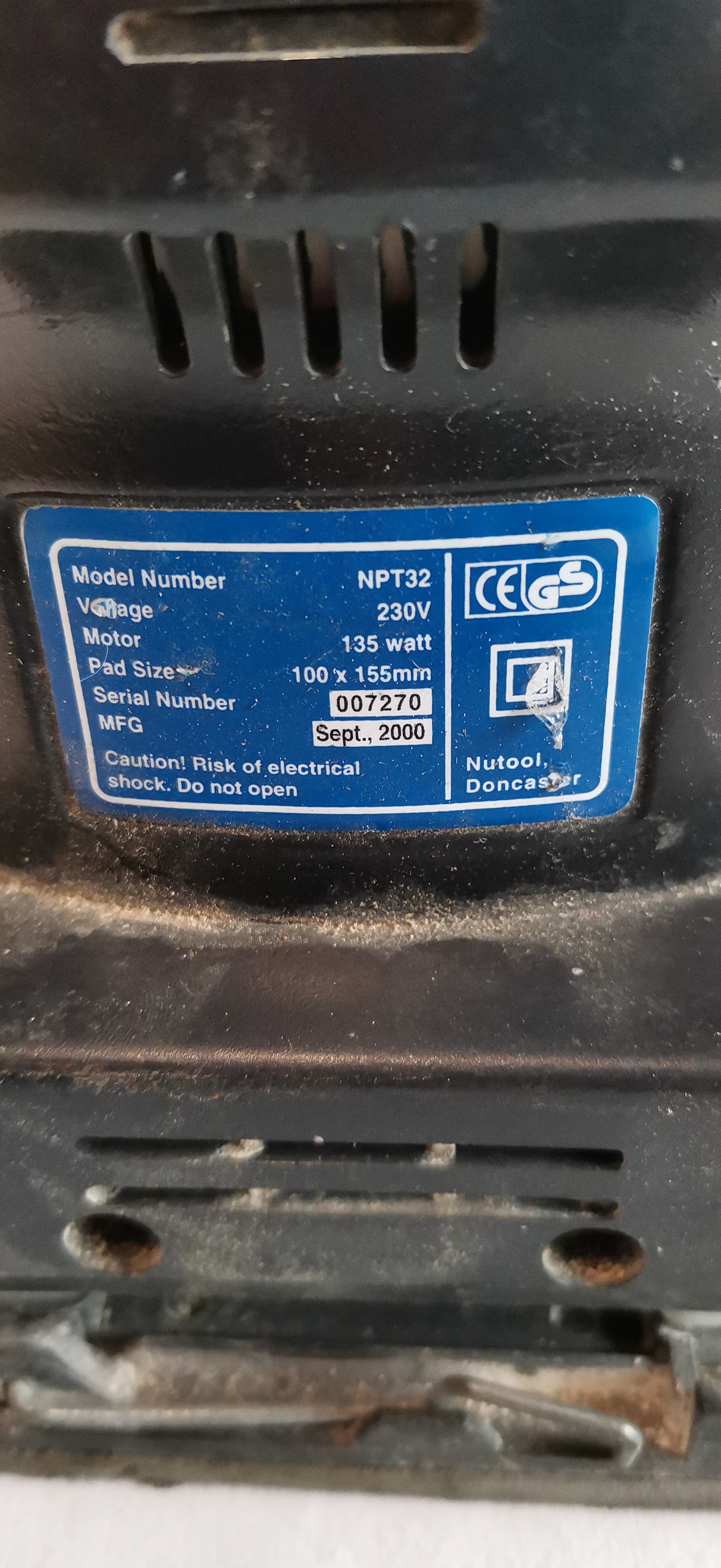 A Nutool NPT32 electric orbital palm sander, manufactured in September 2000. The tool features a black moulded plastic housing and is powered by a 135-watt motor. The front of the unit displays the Nutool logo in yellow and white with the slogan Power to create a better environment. A technical specification label on the reverse identifies the model as NPT32, operating at 230V, with a serial number of 007270. The unit is fitted with an integrated power lead and a standard United Kingdom 3-pin electrical plug. The base is designed for 1/3 sheet sanding applications.
