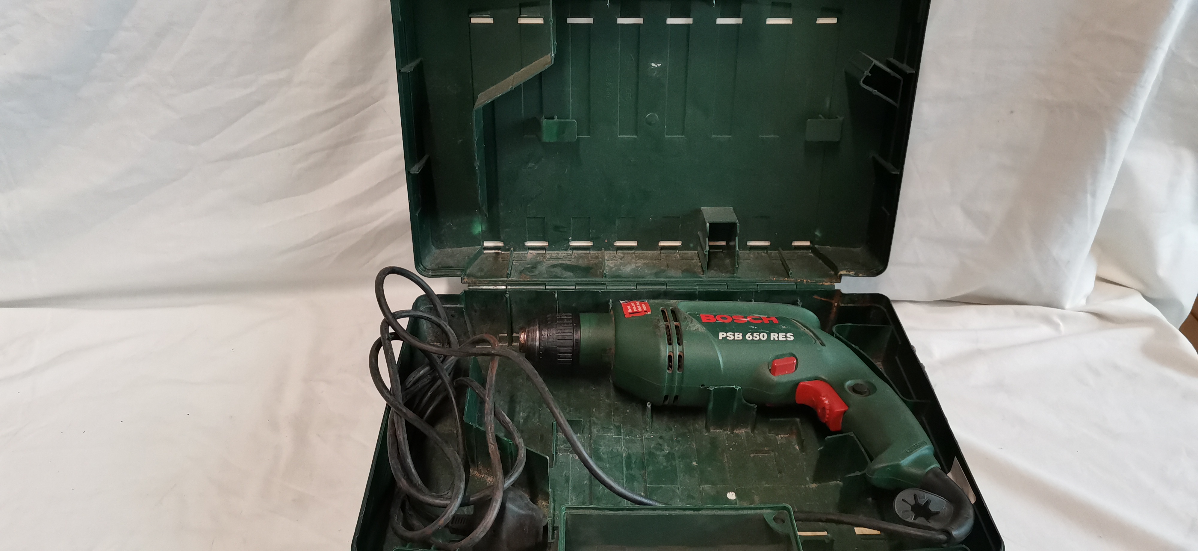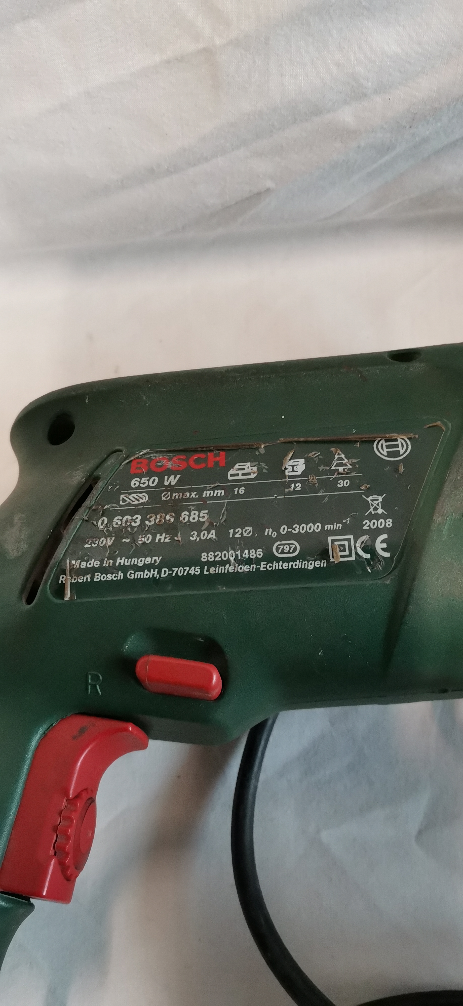 A corded Bosch PSB 650 RES electronic impact drill manufactured by Robert Bosch GmbH. The tool features a green plastic housing with a red trigger and selector switches, a keyless chuck, and an integrated work light. It is presented in its original green plastic hard-shell carrying case. The side of the drill body carries a printed label with the Bosch logo in red, alongside technical specifications including 650W power output, 230V voltage, 3.0A current, and a no-load speed of 0-3000 RPM. The label further identifies the model number as 0 603 386 585 and states the item was made in Hungary in 2008. Drilling capacities are listed as 16mm for concrete, 12mm for steel, and 30mm for wood. The main housing includes the brand name in raised red lettering and the model name in white. The power cable is fitted with a standard UK 3-pin plug.