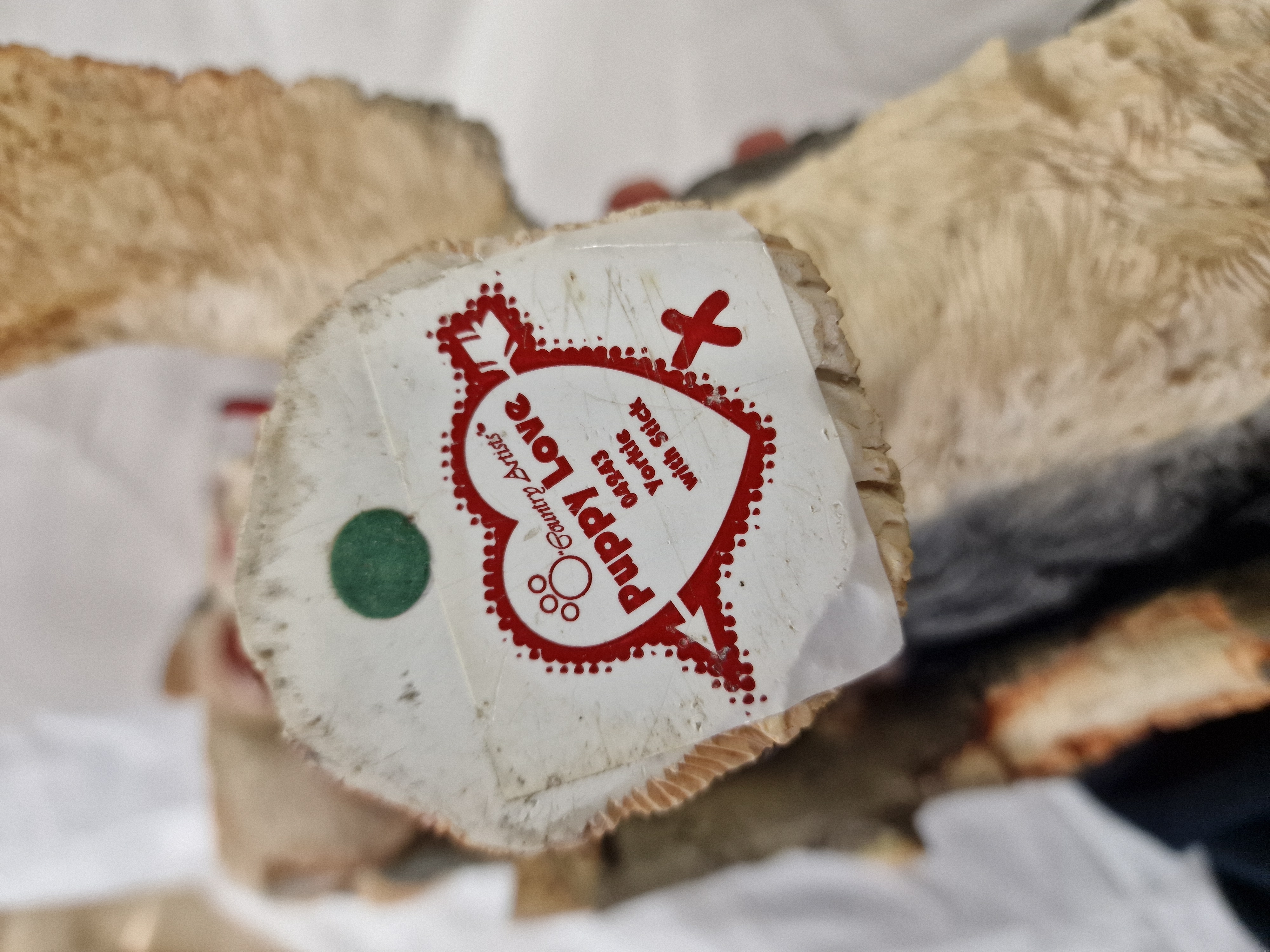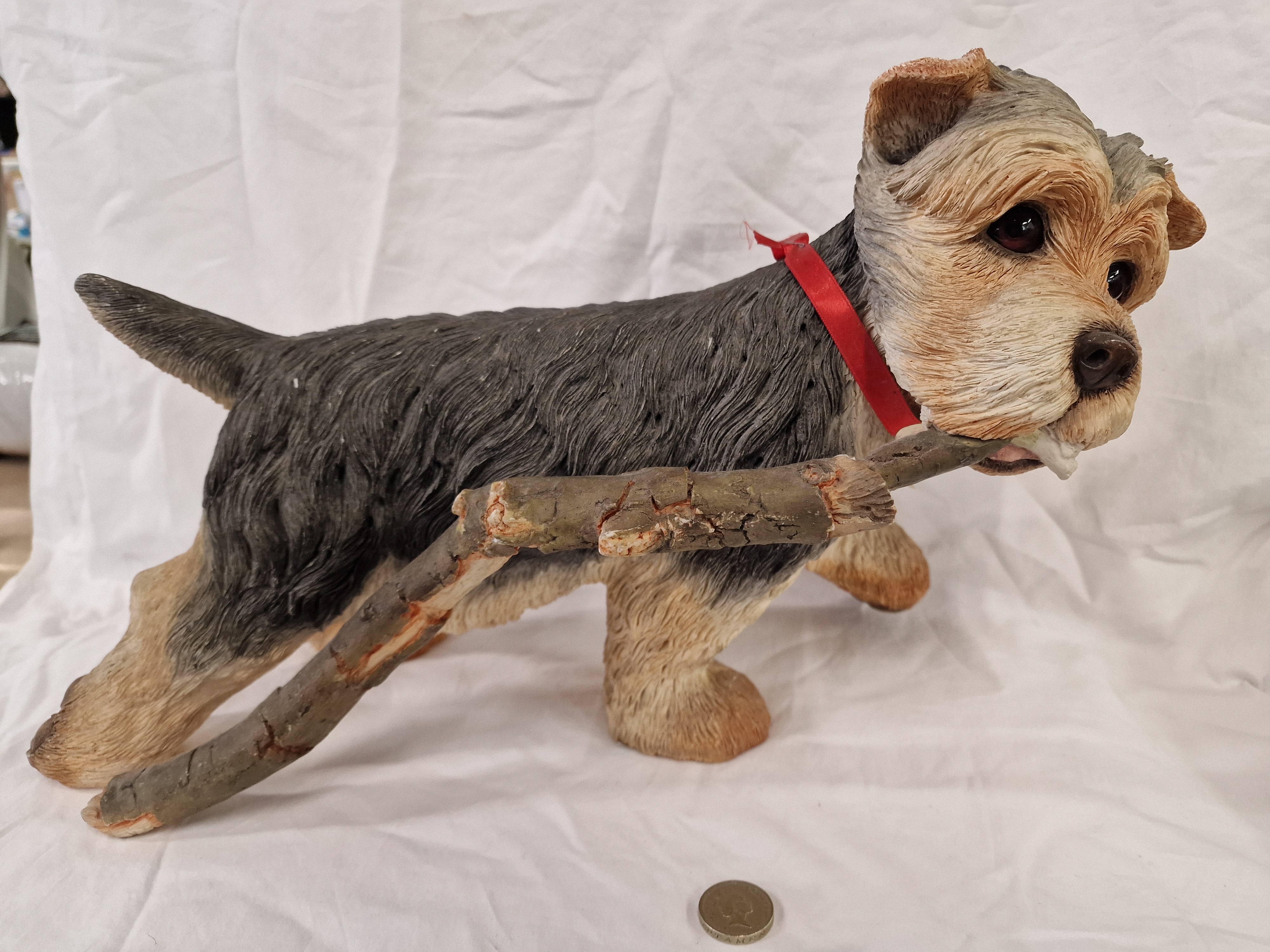 A hand-painted cold-cast resin figurine of a Yorkshire Terrier from the Puppy Love series by Country Artists. The model, numbered 04243 and titled Yorkie with stick, depicts the dog in a walking gait carrying a large branch. The piece features realistic fur textures in grey and tan tones and includes a red ribbon collar. The base of one foot retains the original heart-shaped manufacturer label with the series name and model details. A green felt protector is attached to the underside.