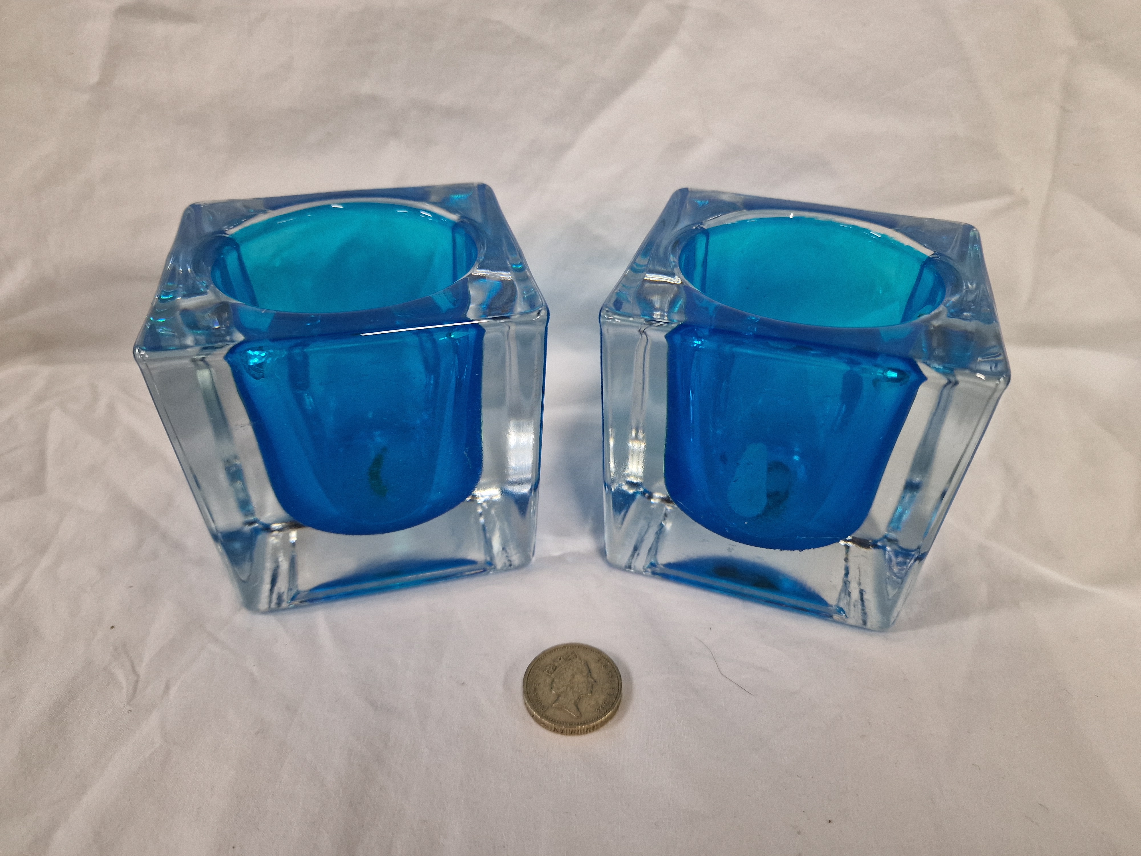 A pair of art glass candle holders of cubic form. Each piece is constructed from heavy clear glass using the sommerso technique, featuring a turquoise-blue core encased within the clear outer block. The exterior is square with bevelled top edges, while the interior well is rounded to accommodate a tea light or small candle. The design is in the style of mid-20th-century Murano glass, resembling works by makers such as Mandruzzato. No maker’s marks, signatures, or labels are present.