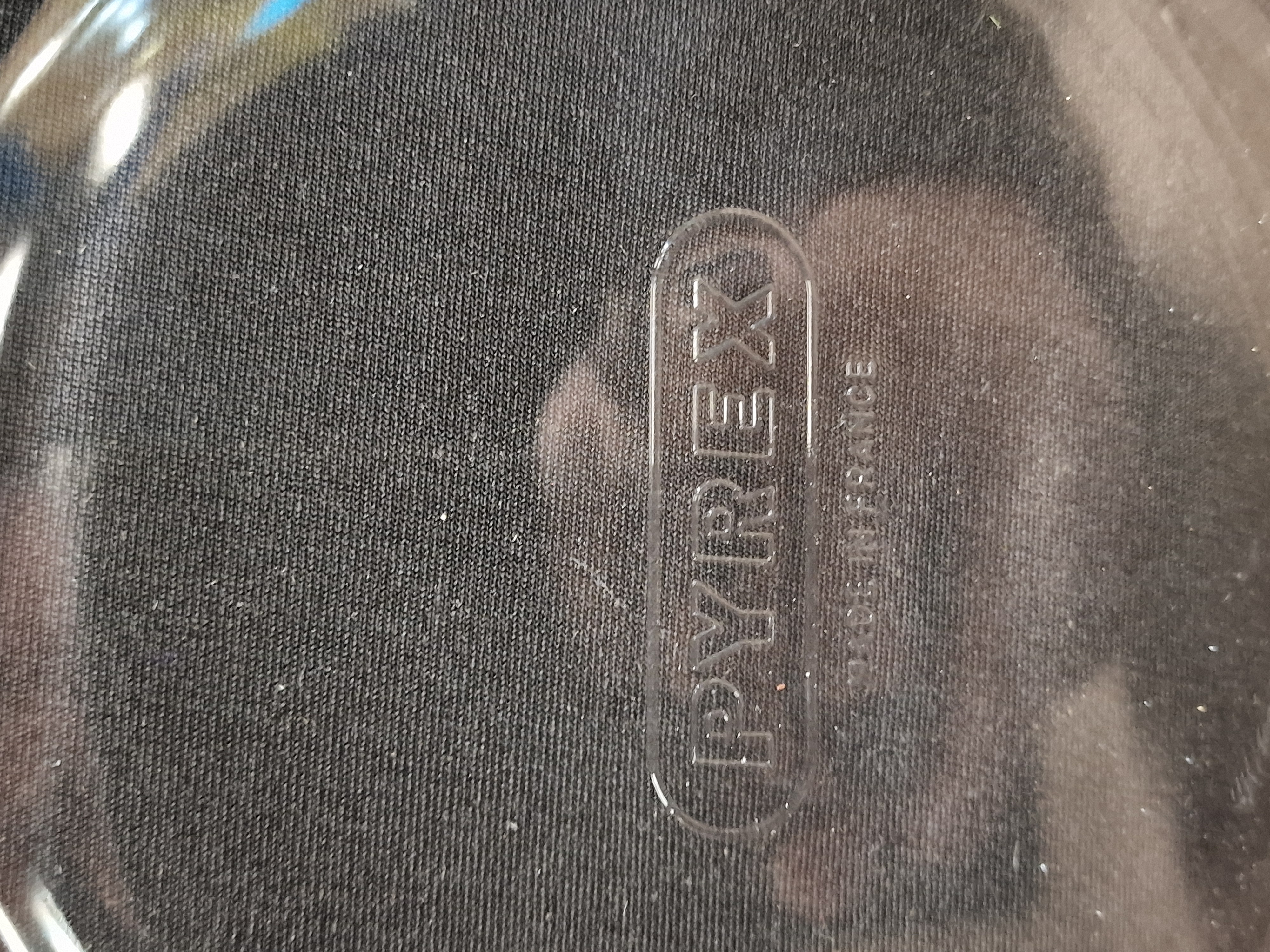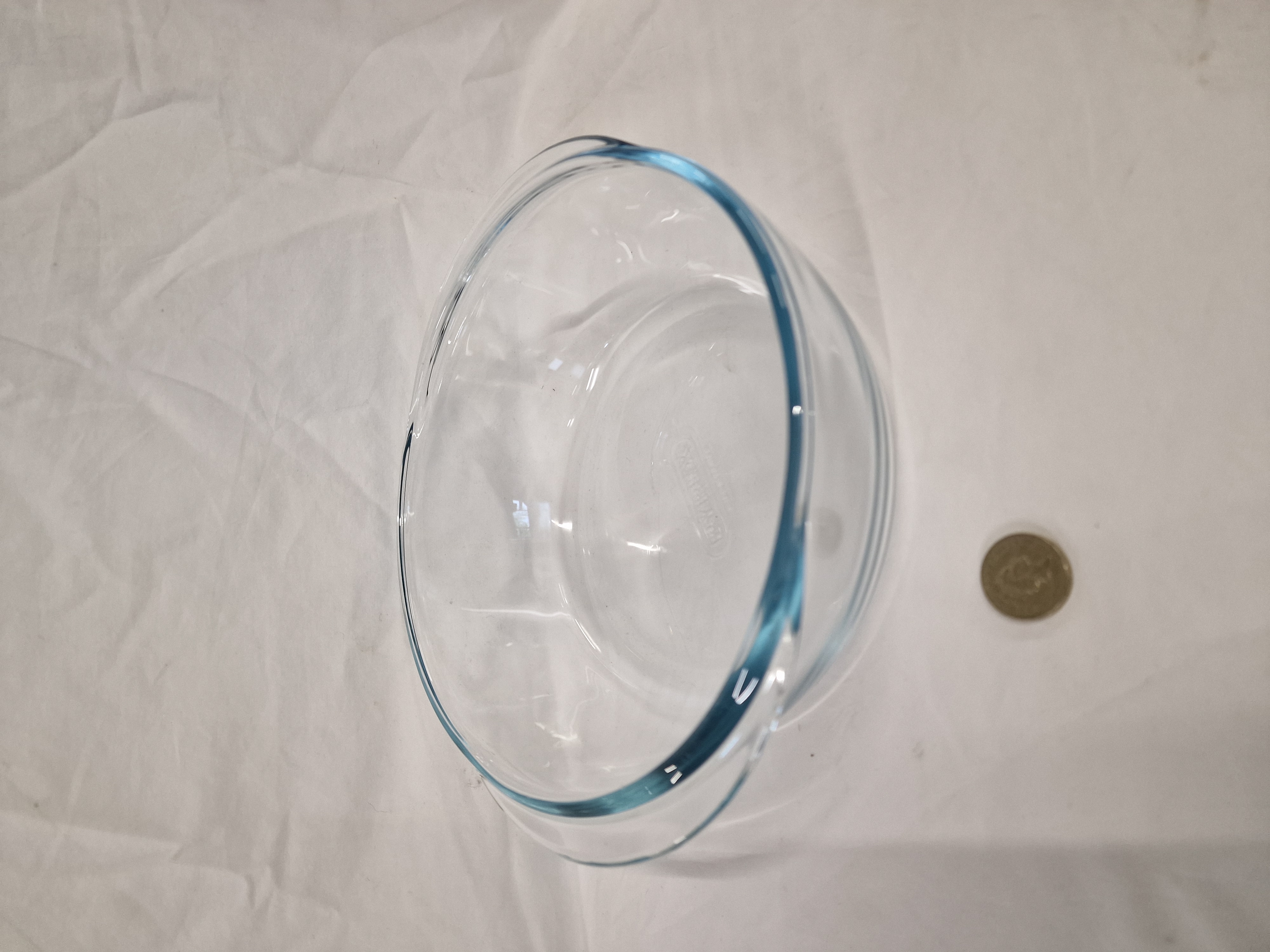 A round clear glass ovenware bowl manufactured by Pyrex in France. The piece is crafted from heat-resistant borosilicate glass, showing a subtle bluish-green tint at the thickened edges. The design is utilitarian, featuring a slightly flared rim for ease of handling. The base of the bowl is embossed with the maker mark PYREX within a rounded rectangular border, alongside the inscription MADE IN FRANCE.