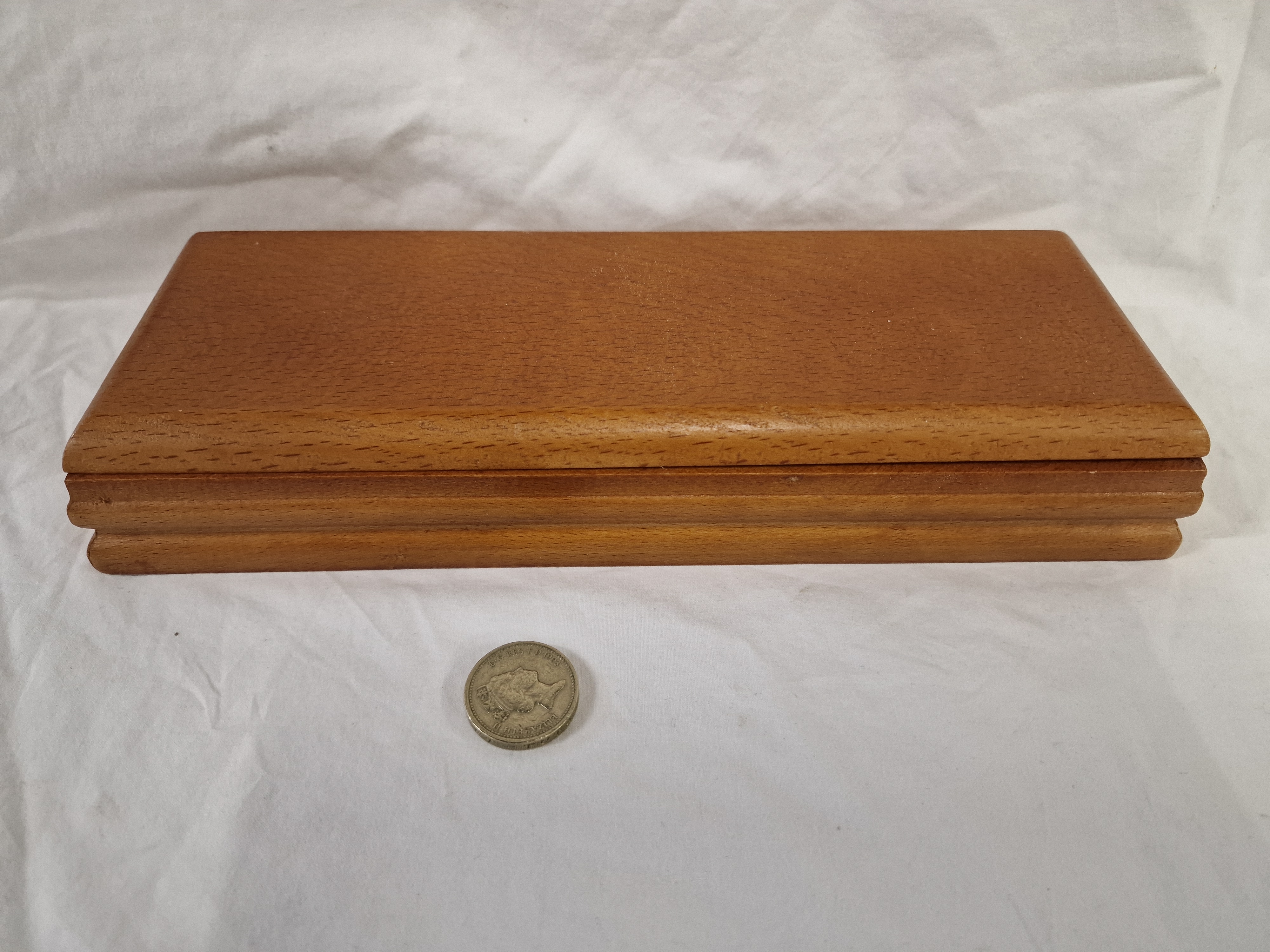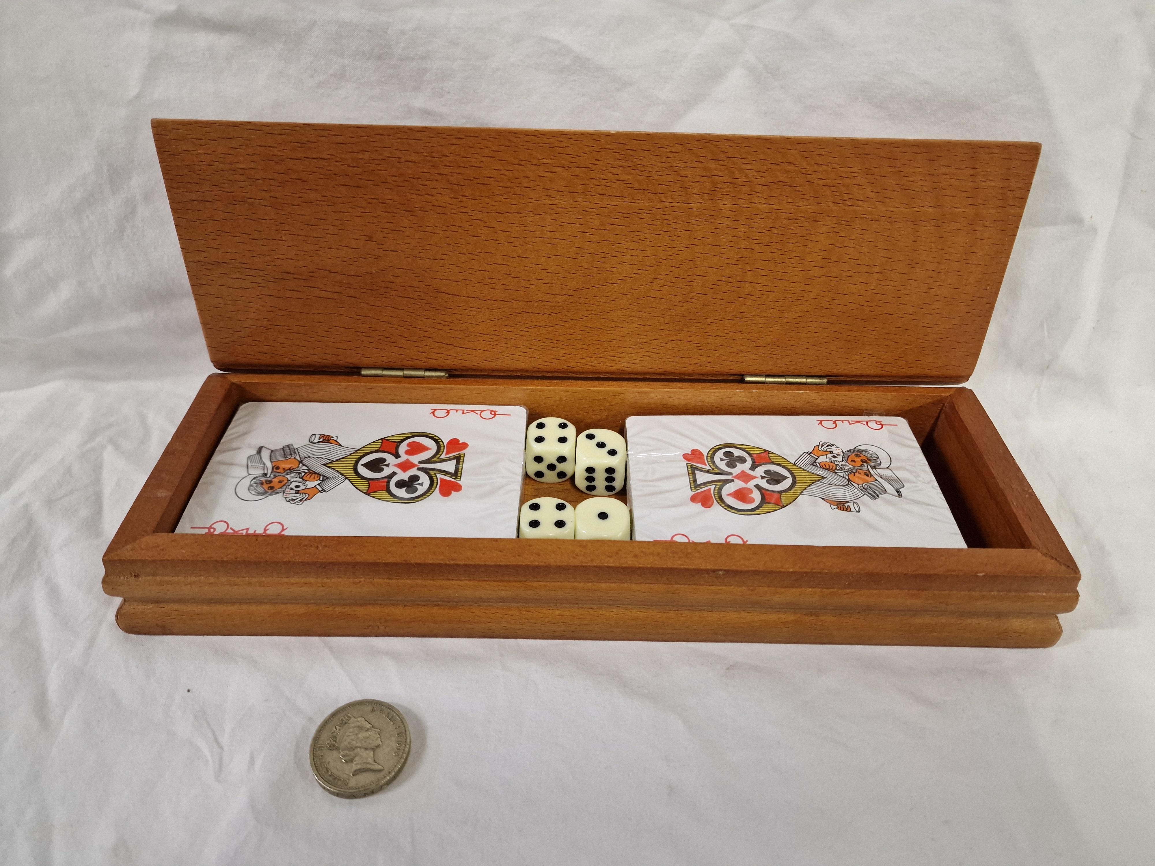 A rectangular hinged games box constructed from a light-coloured hardwood with a grain consistent with beech. The interior is configured to hold two decks of playing cards and four six-sided dice. The playing cards are factory-sealed in clear plastic wrapping and feature a stylized jester illustration on the reverse; the card faces are printed with the Piatnik brand name in red cursive script. The four white dice feature standard black pips. The box is designed with a stepped base and a plain, unadorned lid, secured by two metal hinges. No maker’s marks or labels are present on the wooden casing. A 1983 British one pound coin is present in the images for scale.