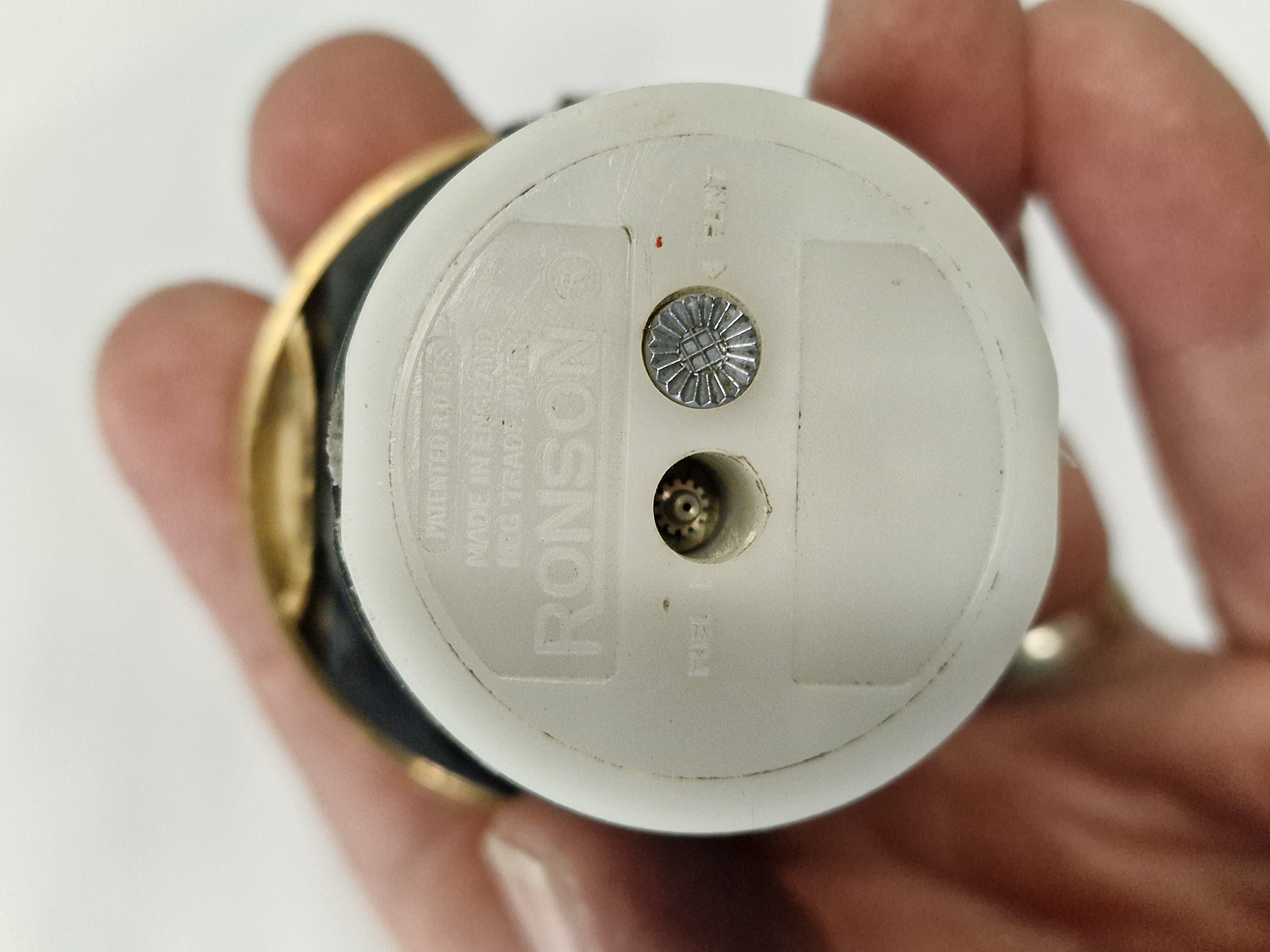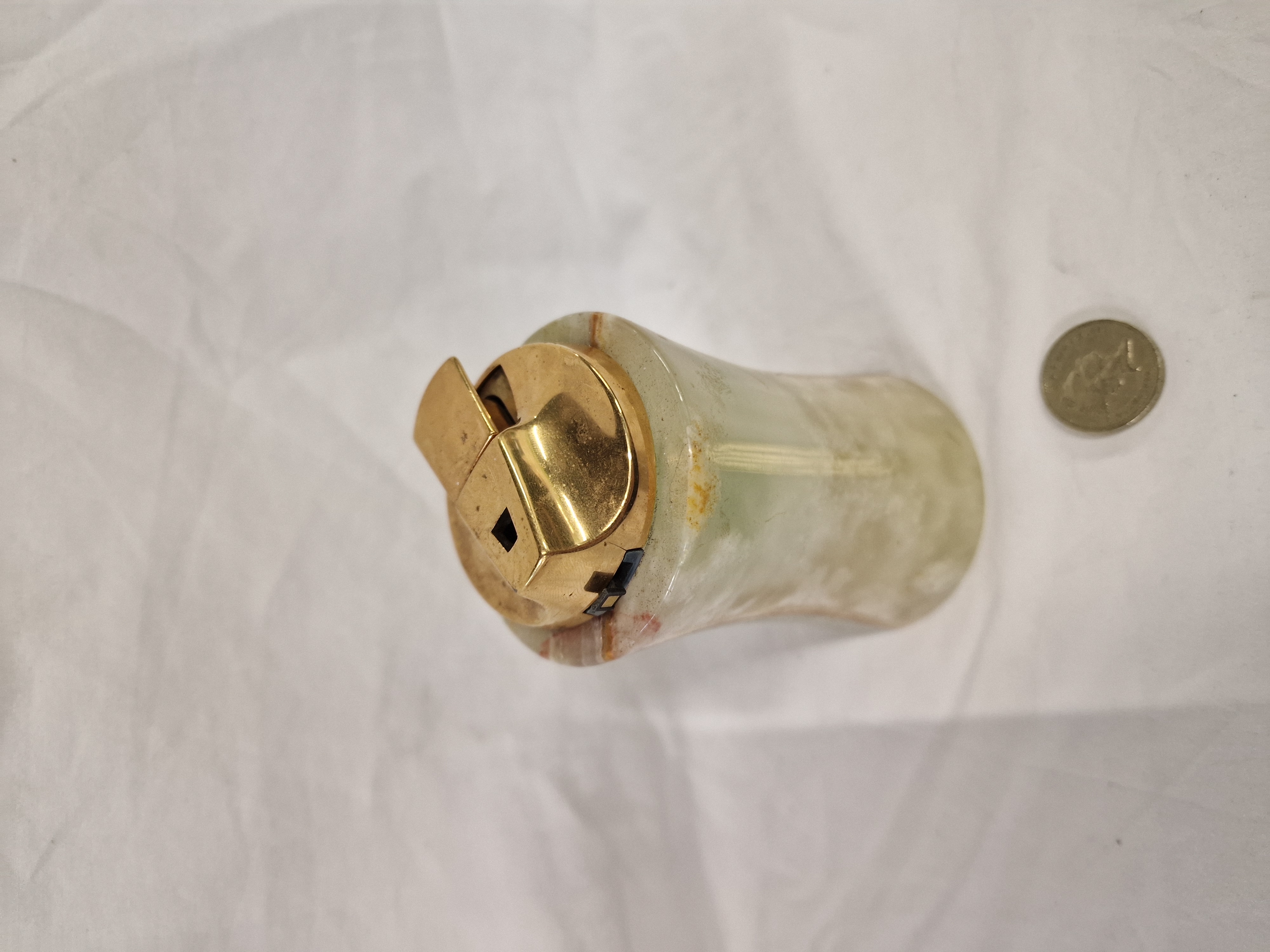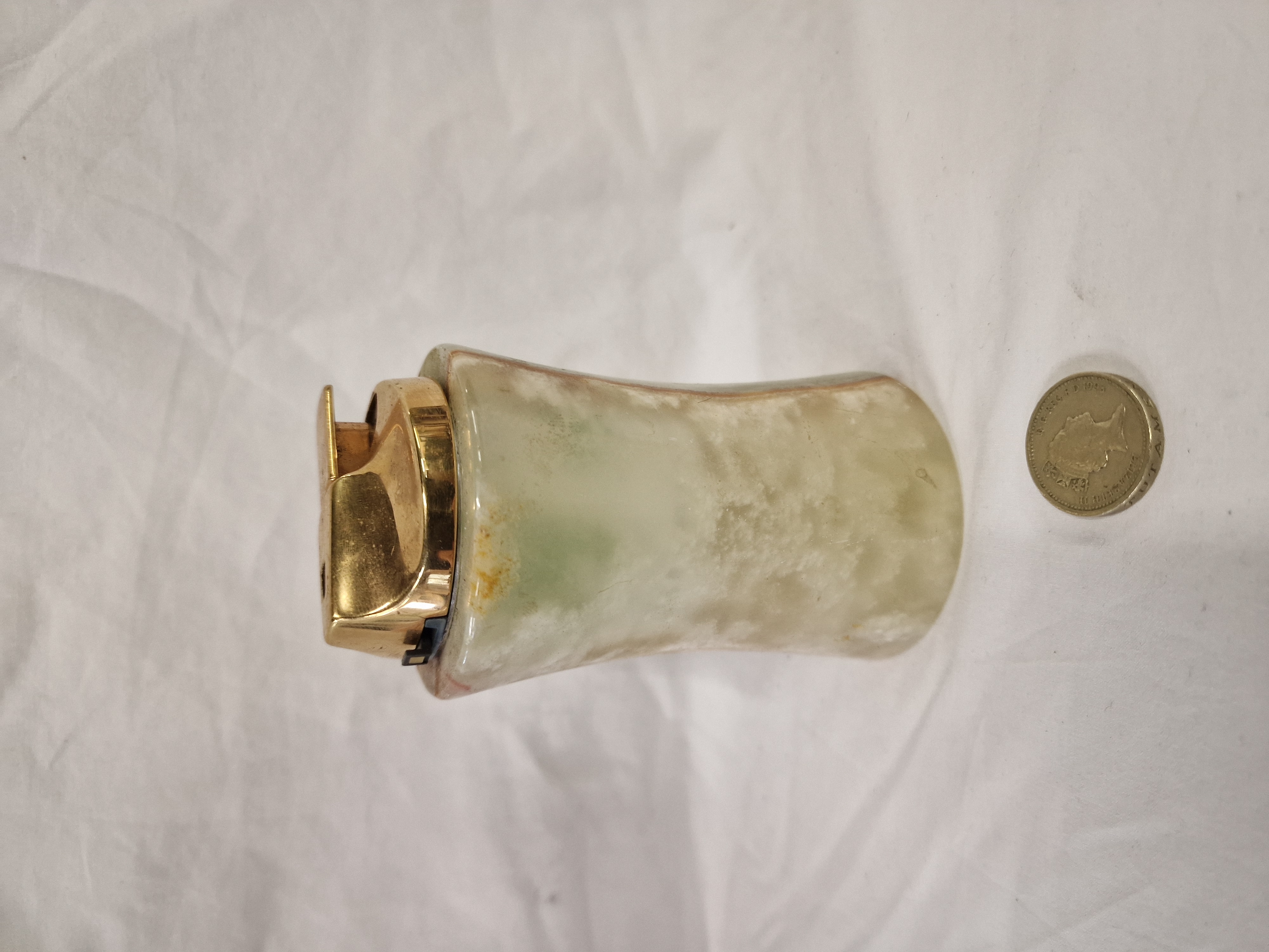 A mid-20th-century Ronson table lighter featuring a carved and polished pale green onyx body with natural white veining. The stone is shaped in a waisted, flared profile. The top is fitted with a gold-tone metal Ronson lighter mechanism. The underside features a white plastic insert with access points for fuel and flint. The base is embossed with the following marks: RONSON, MADE IN ENGLAND, REG. TRADE MARK, PATENTED RD. DES., FLINT with an arrow, and FUEL. Included for scale is a British one pound coin.