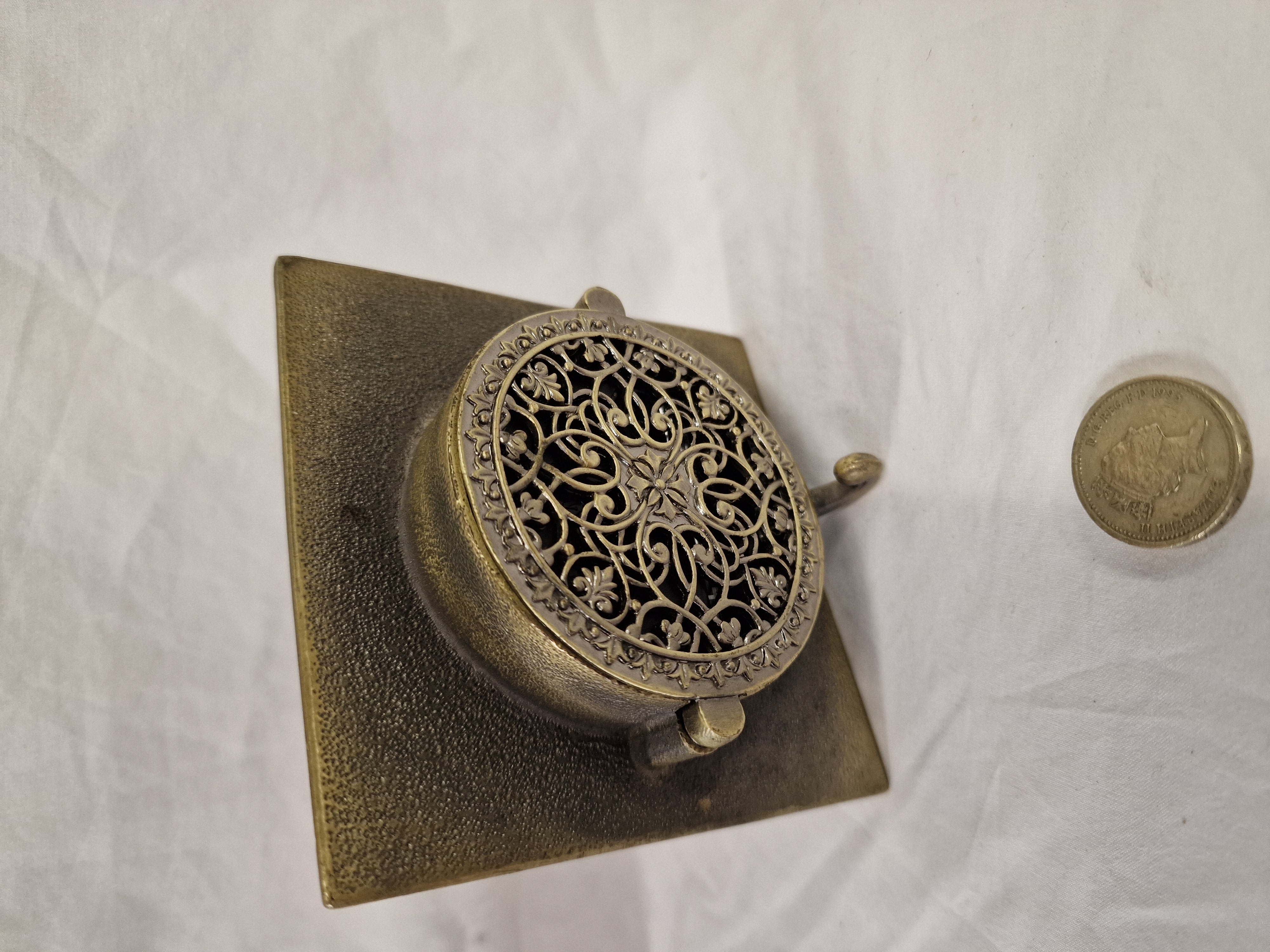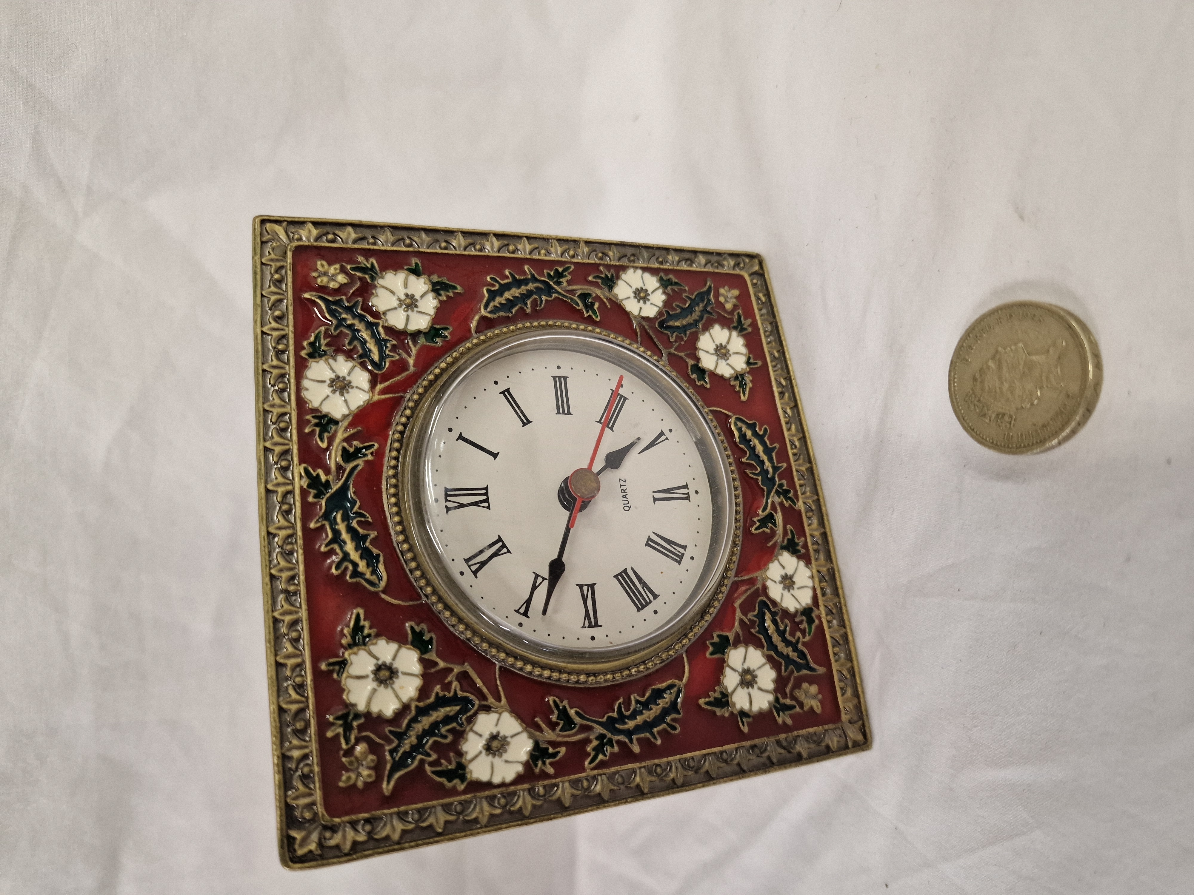 A square-form miniature desk or mantel clock constructed from a cast gold-tone metal case. The front face features a red enamelled ground decorated with raised floral motifs, including white flowers with yellow centres and dark green foliage, enclosed within a repeating foliate scroll border. The circular white dial is set within a beaded bezel and features black Roman numeral hour markers with the word QUARTZ printed above the six o’clock position. The handset consists of black spade-style hour and minute hands and a red sweep second hand. The reverse of the clock displays a stippled, textured metal finish with a central, decorative pierced filigree cover over the movement housing. A small hinged stand is attached to the back for upright display. The timepiece is powered by a battery-operated quartz movement.