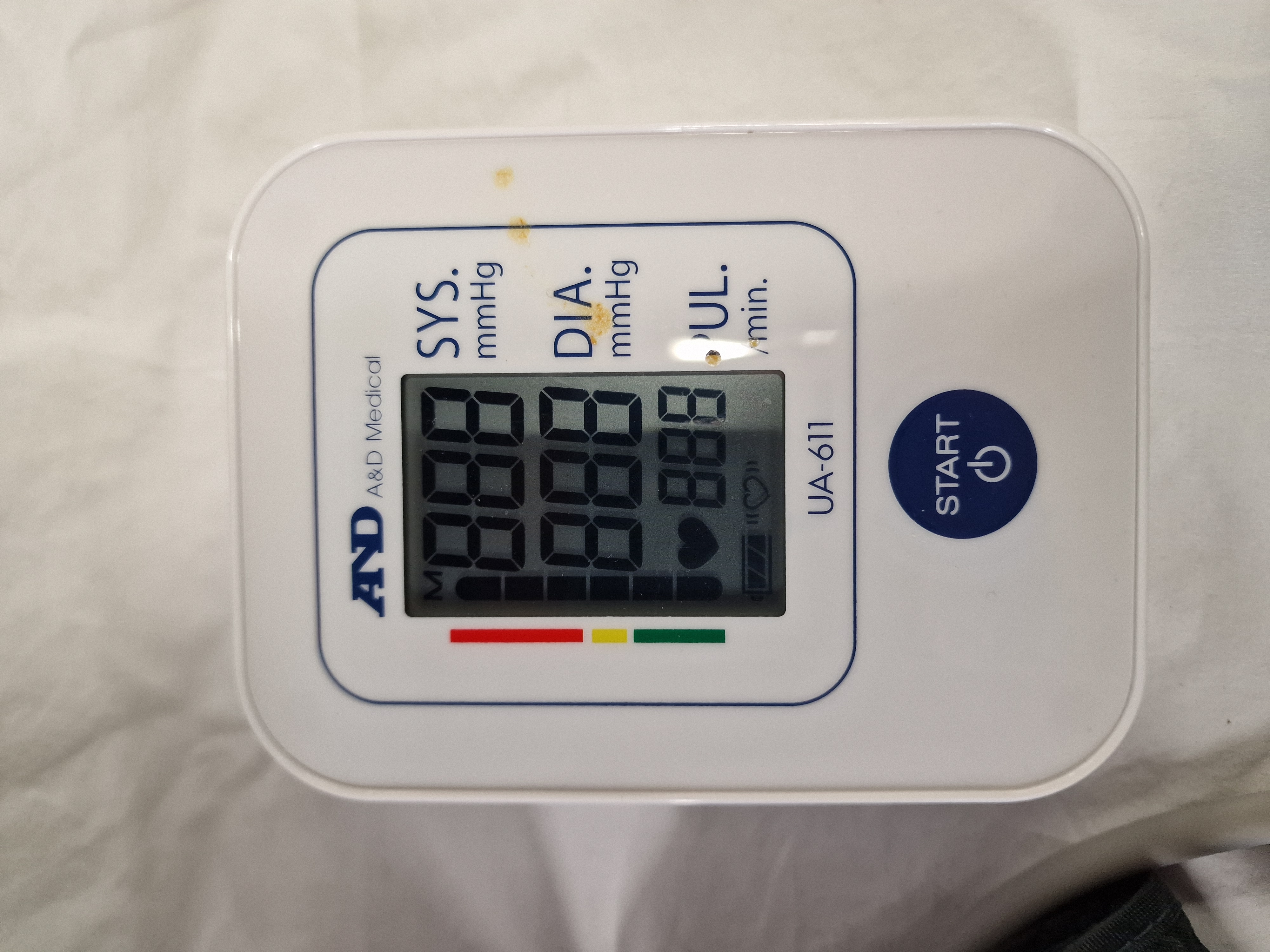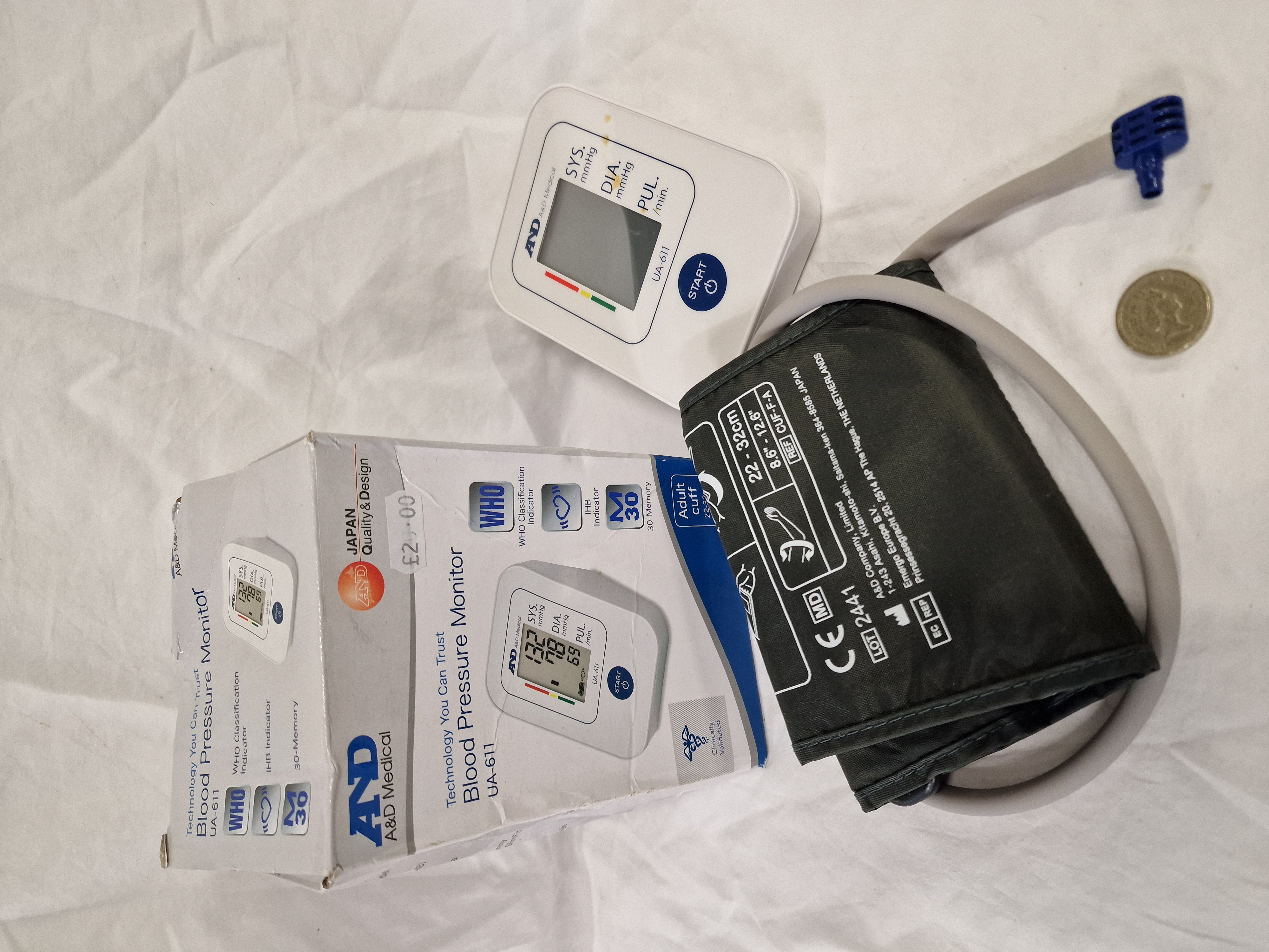 An A&D Medical UA-611 digital upper arm blood pressure monitor, British and Irish Hypertension Society (BIHS) approved. The device features an LCD screen for displaying systolic and diastolic pressure in mmHg and pulse rate per minute. Functional features include a 30-reading memory, a WHO classification indicator, and irregular heartbeat (IHB) detection. The unit is constructed with a white plastic casing and a single blue start button. Included is an adult-sized SlimFit arm cuff (REF CUF-F-A, LOT 2441) and the original manufacturer’s cardboard packaging.