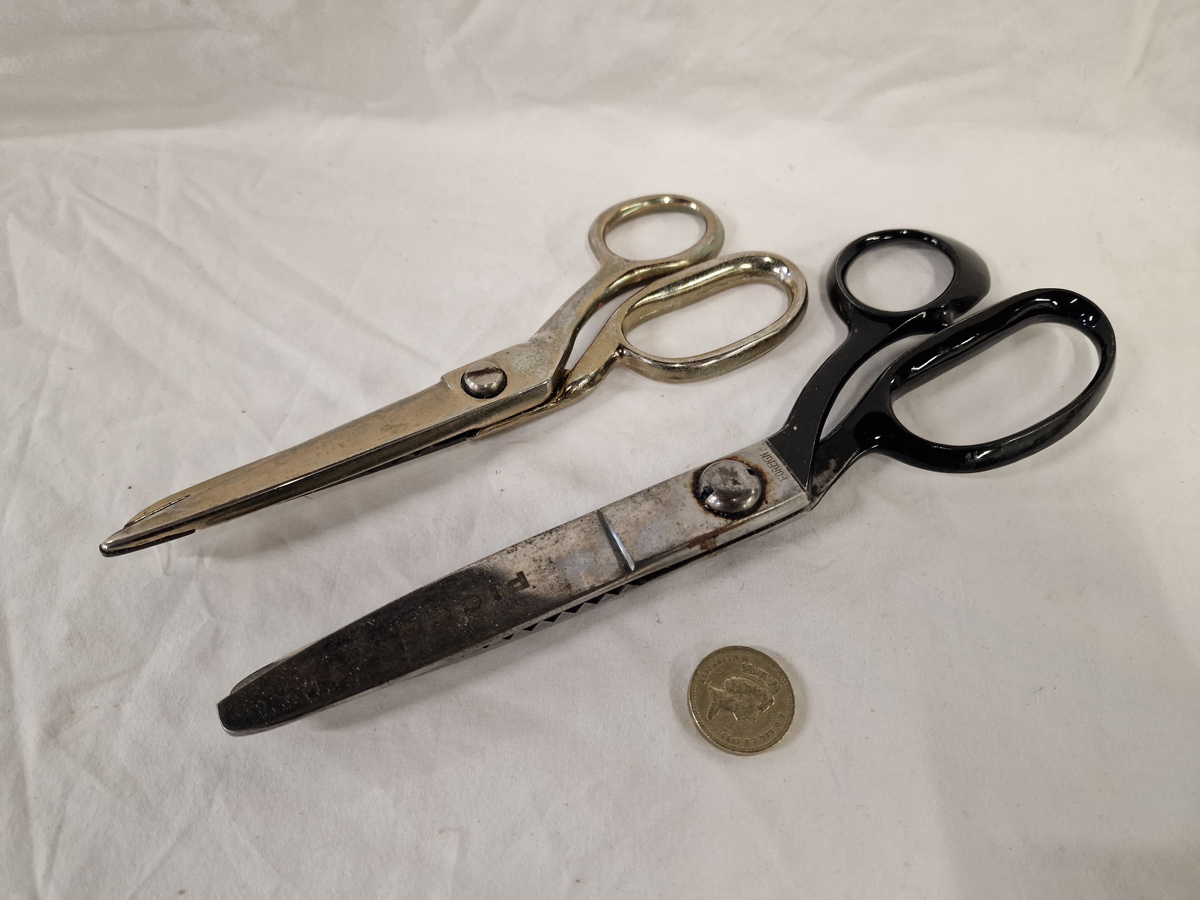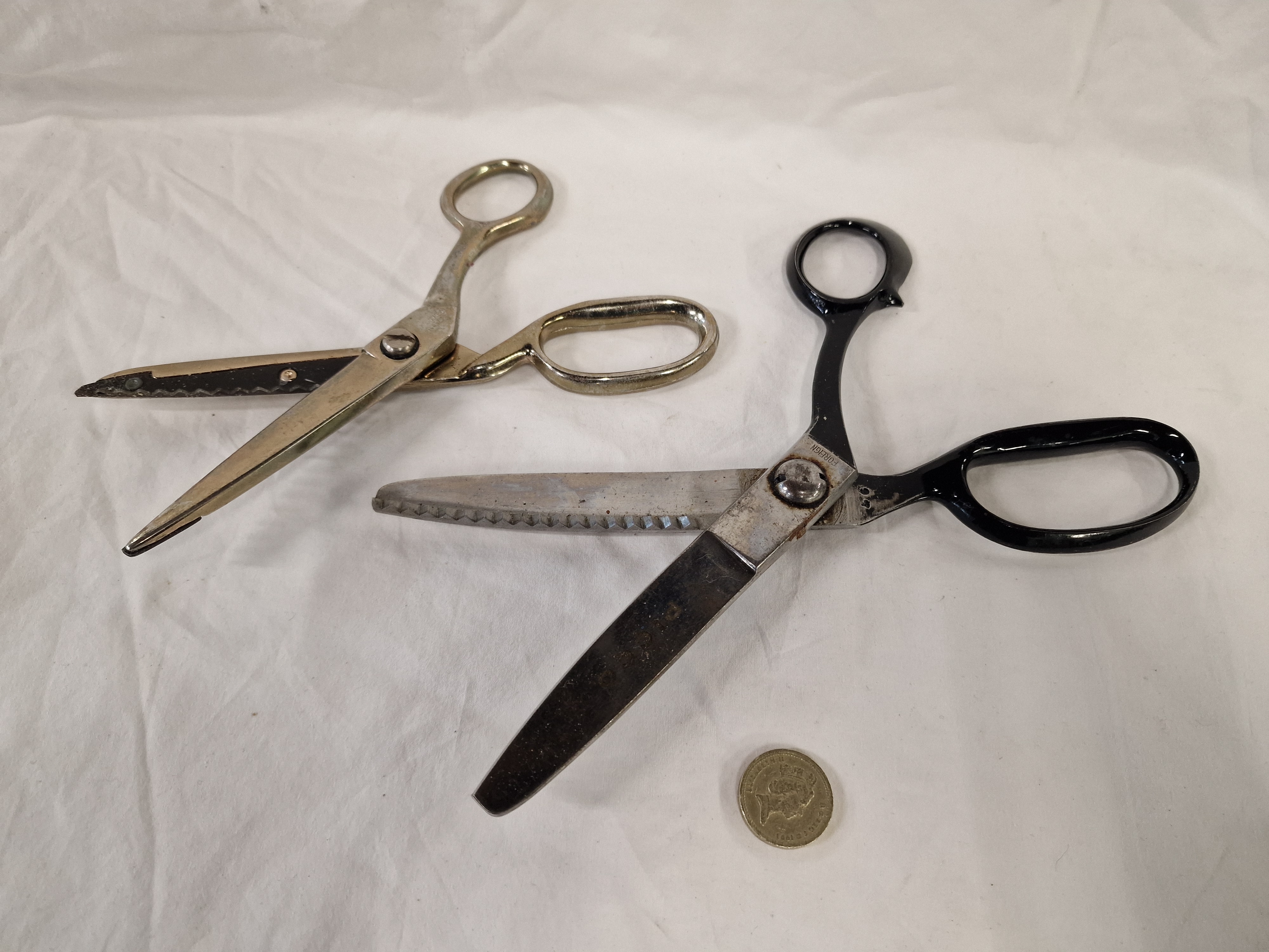 This lot comprises two pairs of vintage pinking shears of mid-20th-century manufacture, designed for tailoring and dressmaking. The first pair is of British origin, constructed from steel with a chrome or nickel-plated finish. It features zigzag cutting blades and is stamped on the handle shank with BRITISH MADE and the registered design number REGD NO 835261. The second pair is a heavy-duty model featuring steel blades and black-coated handles, likely japanned. This pair is stamped with FOREIGN on the handle shank and the word PINKING on one blade, alongside a small numerical stamp. Both items are typical of industrial sewing equipment from the period. A British one pound coin is included in the images for scale.