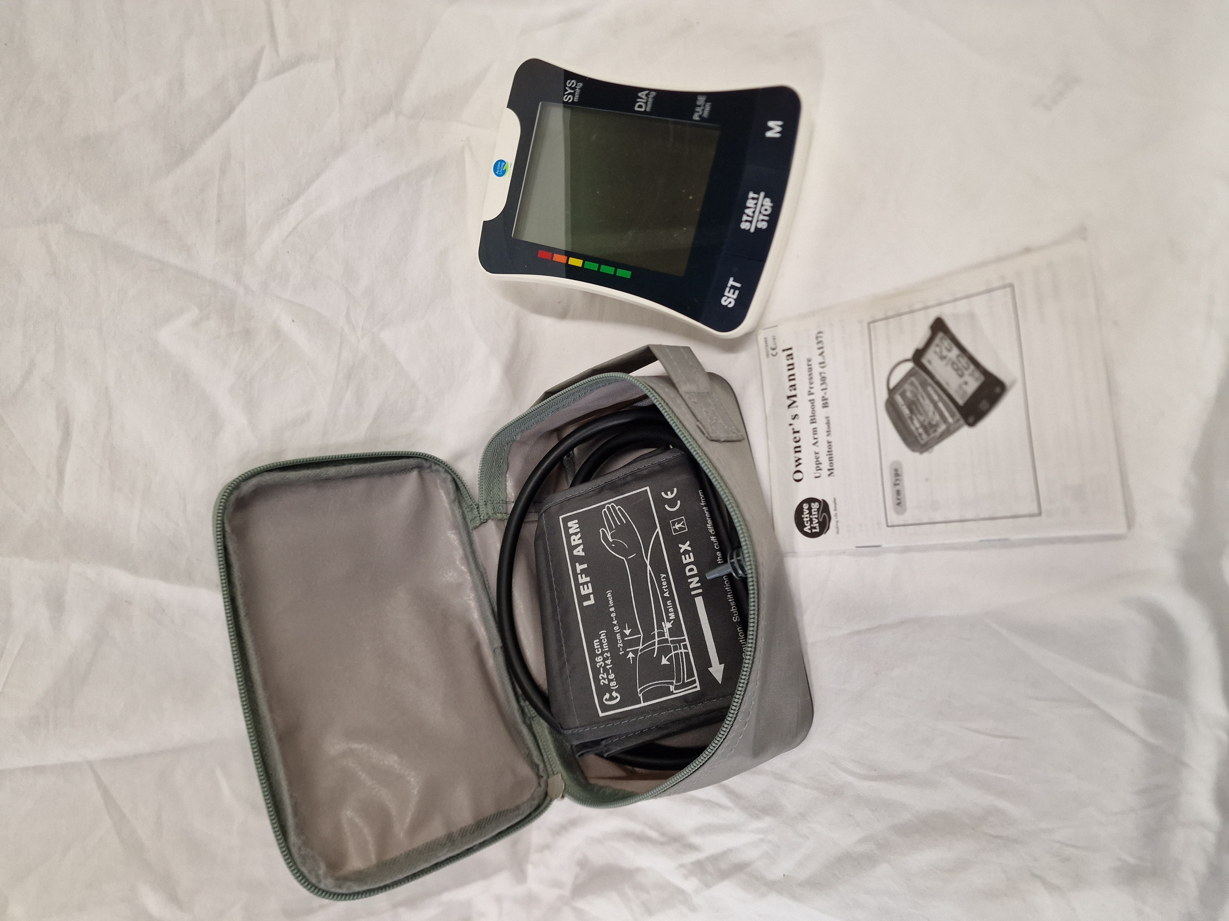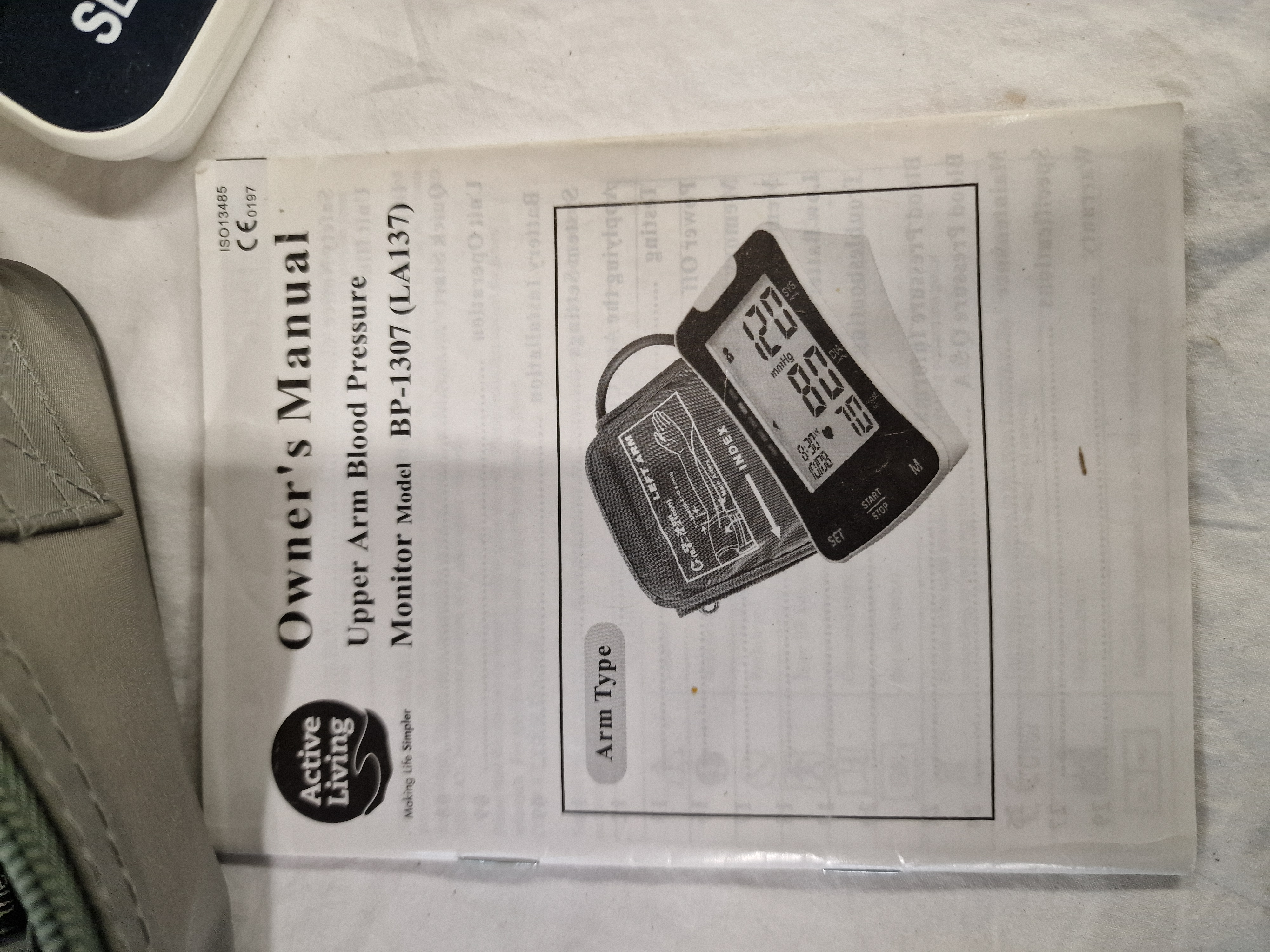 An Active Living digital upper arm blood pressure monitor set, model number BP-1307 (LA137). The set comprises a battery-operated monitor unit with a digital display, an adjustable arm cuff, a grey zipped fabric carrying case, and the original printed owner’s manual. The monitor unit features a white and blue plastic housing with a large screen displaying indicators for systolic pressure (SYS), diastolic pressure (DIA), and pulse rate. Control buttons are marked SET, START STOP, and M. The grey fabric arm cuff is designed for arm circumferences of 22-36 cm and includes instructional diagrams for placement on the left arm. The manual is titled Owner’s Manual Upper Arm Blood Pressure Monitor Model BP-1307 (LA137) and bears the Active Living manufacturer’s name and logo.