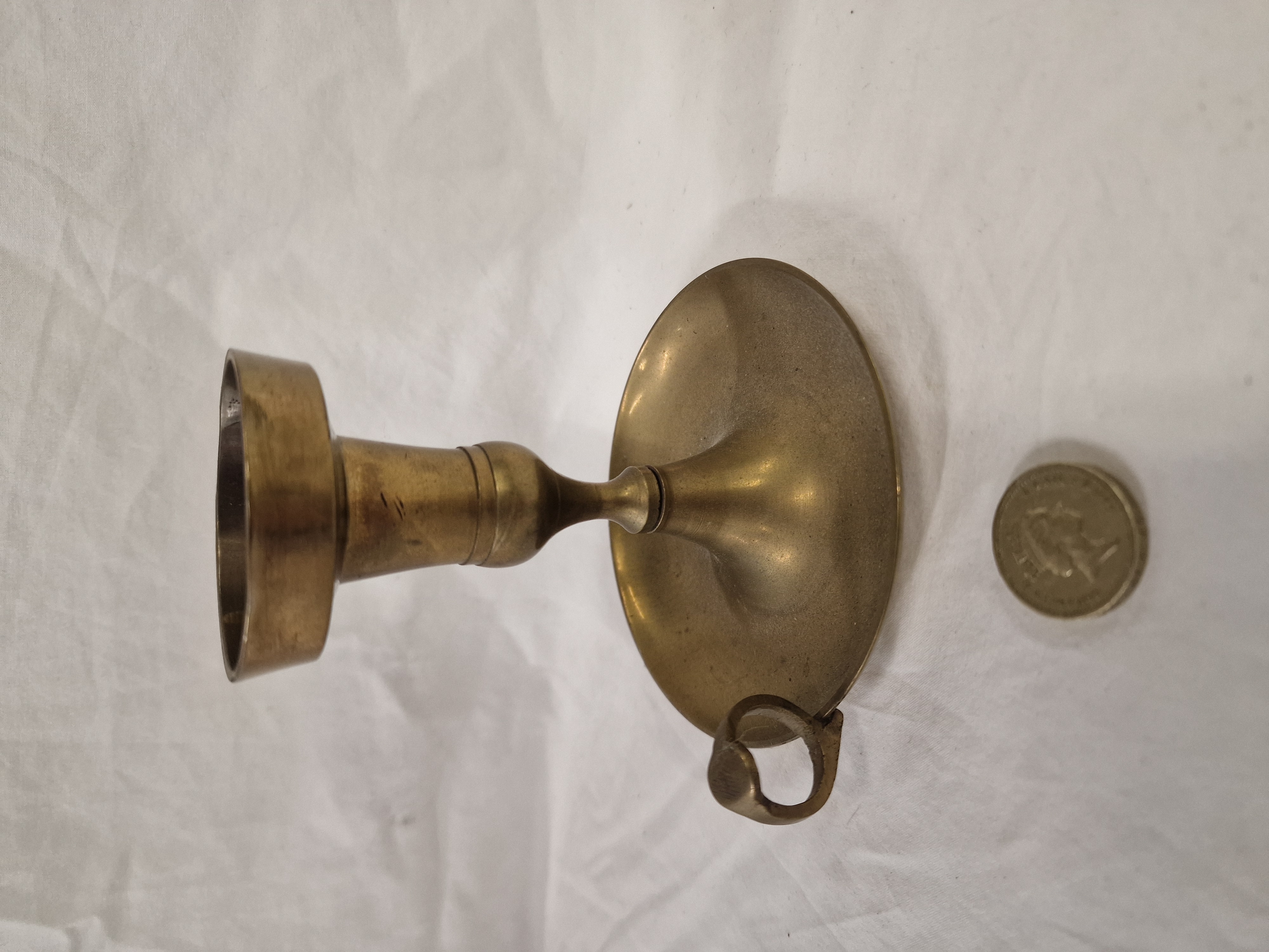 A vintage brass chamberstick of cast and turned construction. The piece features a circular, slightly domed base rising to a central stem with a single turned knop. It is surmounted by a deep, wide candle cup designed to collect wax drips. A small loop handle is fixed to the outer rim of the base. No maker marks or inscriptions are present on the visible surfaces. A British one pound coin is included in the images for scale.