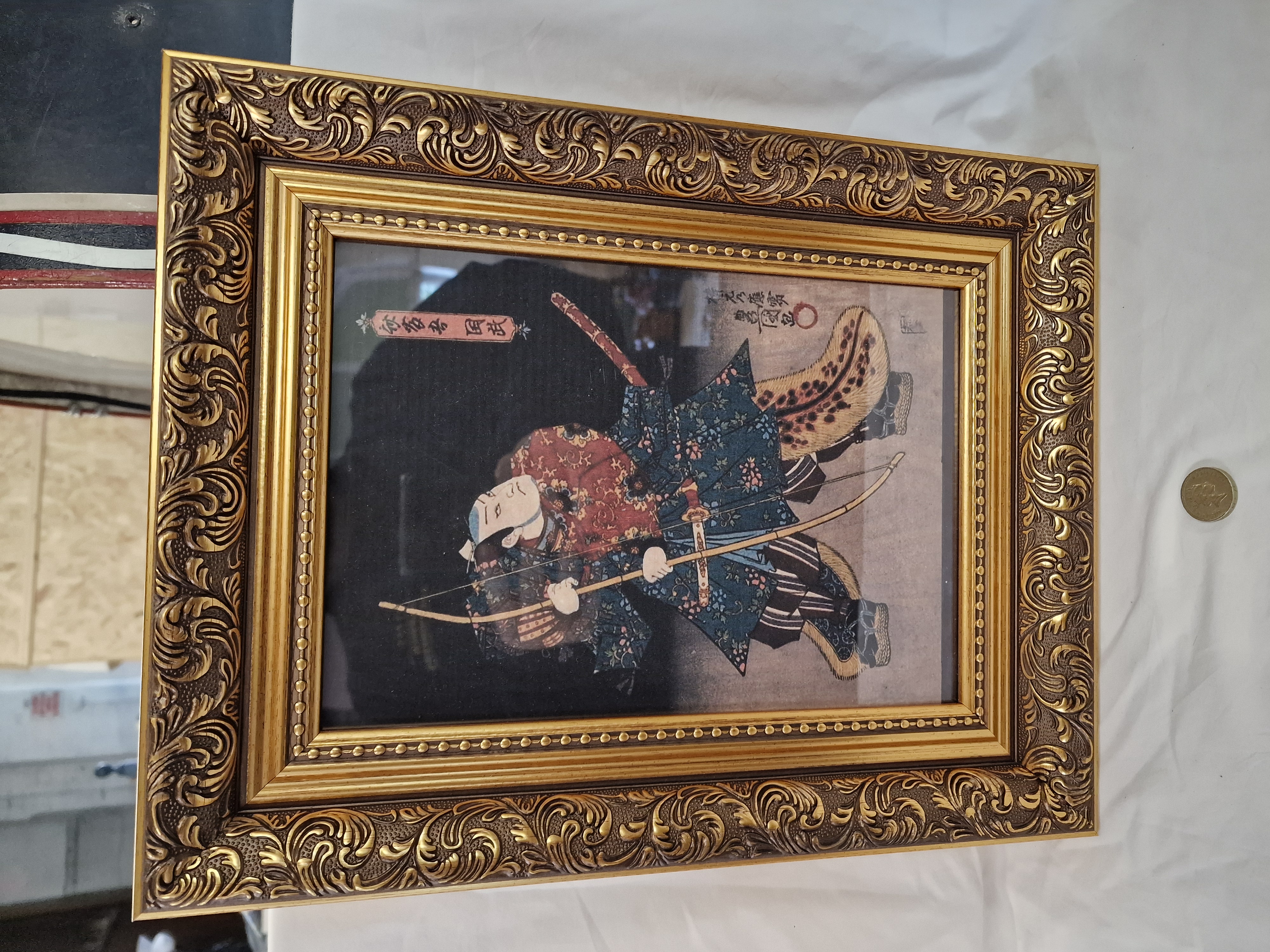 A framed Japanese woodblock prints depicting samurai warriors, including one featuring a figure with a bow in an ornate gold-toned frame.