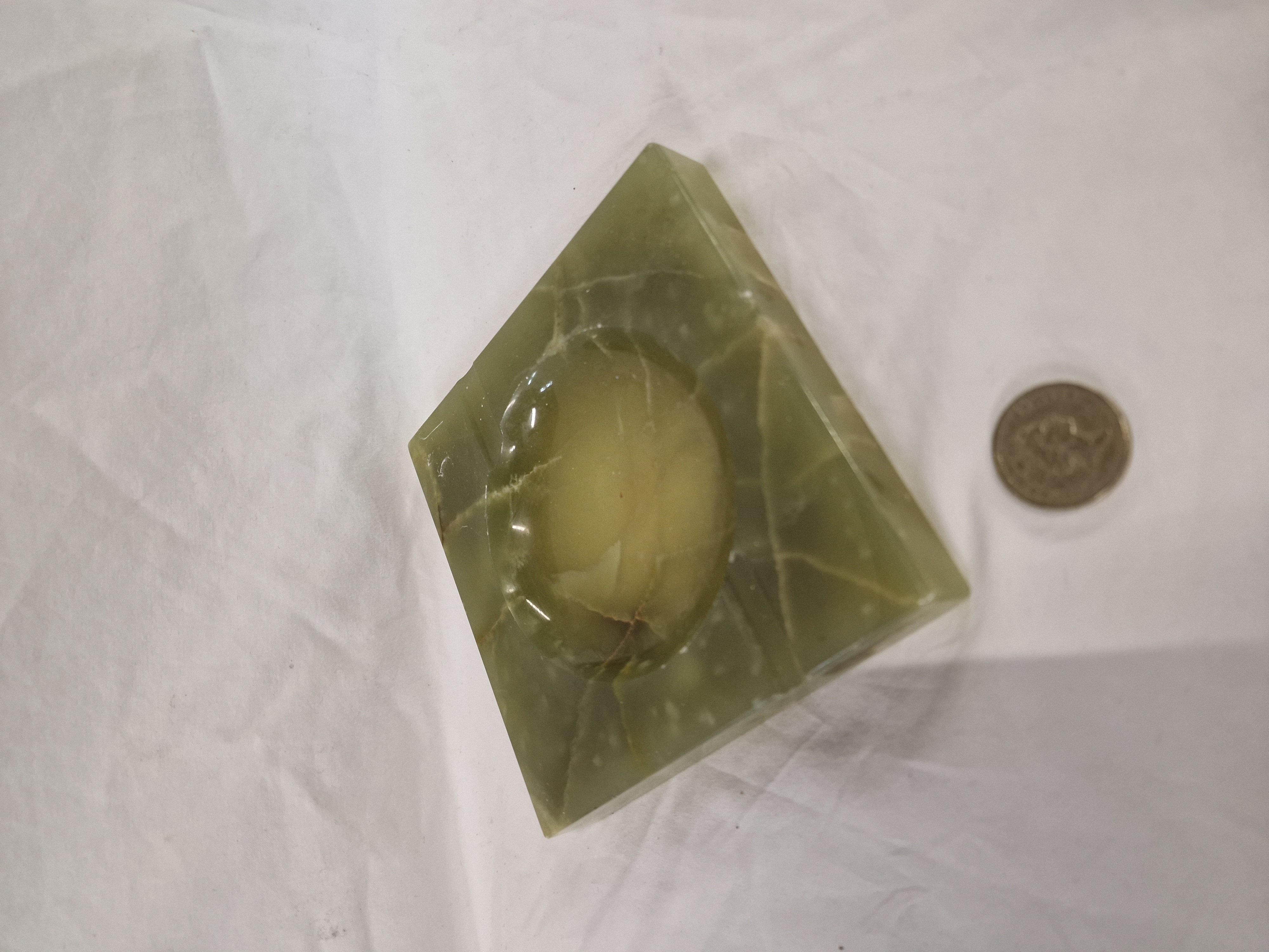 A carved green onyx ashtray or trinket dish of square form featuring bevelled edges and a circular central well. The translucent stone displays a light green body with natural cream-coloured veining and a polished surface finish. The item is of a form and material often associated with mid-century decorative wares, however, no maker marks or signatures are present to confirm a specific manufacturer. A UK one-pound coin is provided in the imagery for scale.