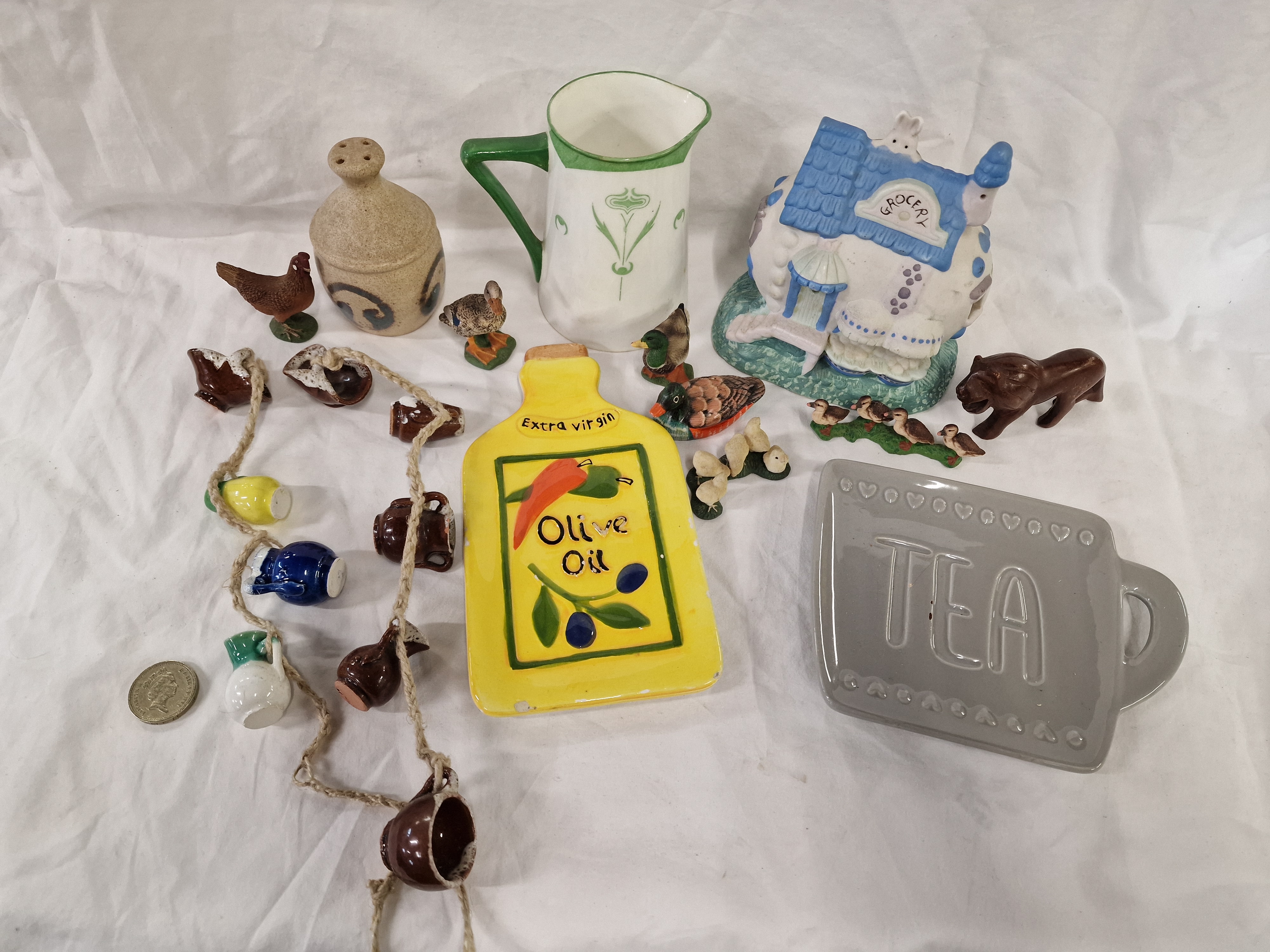A collection of decorative ceramic items and kitchenware. The lot includes a grey glazed earthenware tea bag rest in the form of a mug, featuring the word TEA in raised relief with embossed heart and beaded borders. Also present is a yellow-glazed earthenware decorative tile or spoon rest shaped like an oil bottle, decorated with a red chilli pepper and olive branch motif and the text Extra virgin Olive Oil. The collection further comprises a white-glazed earthenware jug of baluster form with a green-painted handle and rim, decorated with a stylised foliate motif; a small stoneware pepper shaker with cobalt blue hand-painted swirls; and a painted ceramic or resin model of a grocery shop with a blue textured roof. Animal figurines include a brown-glazed lion, a hen on a green base, and several ducks and ducklings. A length of twine featuring approximately nine miniature ceramic vessels in various glazes is also included.