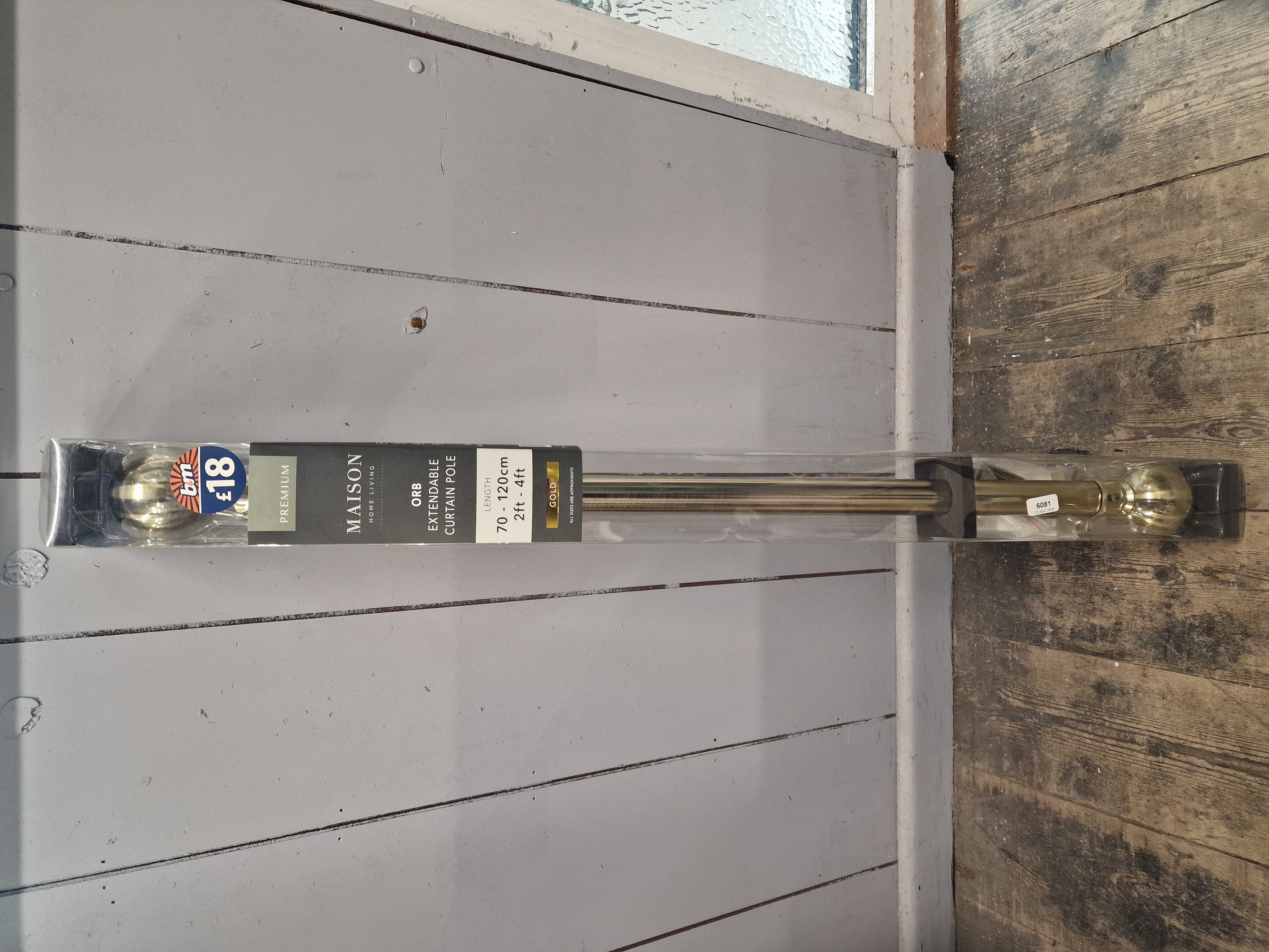 A Maison Home Living Premium extendable curtain pole featuring orb finials and a gold-coloured finish. The item is designed with an adjustable length ranging from 70cm to 120cm. It is presented in its original clear plastic retail packaging with visible branding and a retail price sticker of £18. The set includes the pole and two decorative orb-shaped finials.