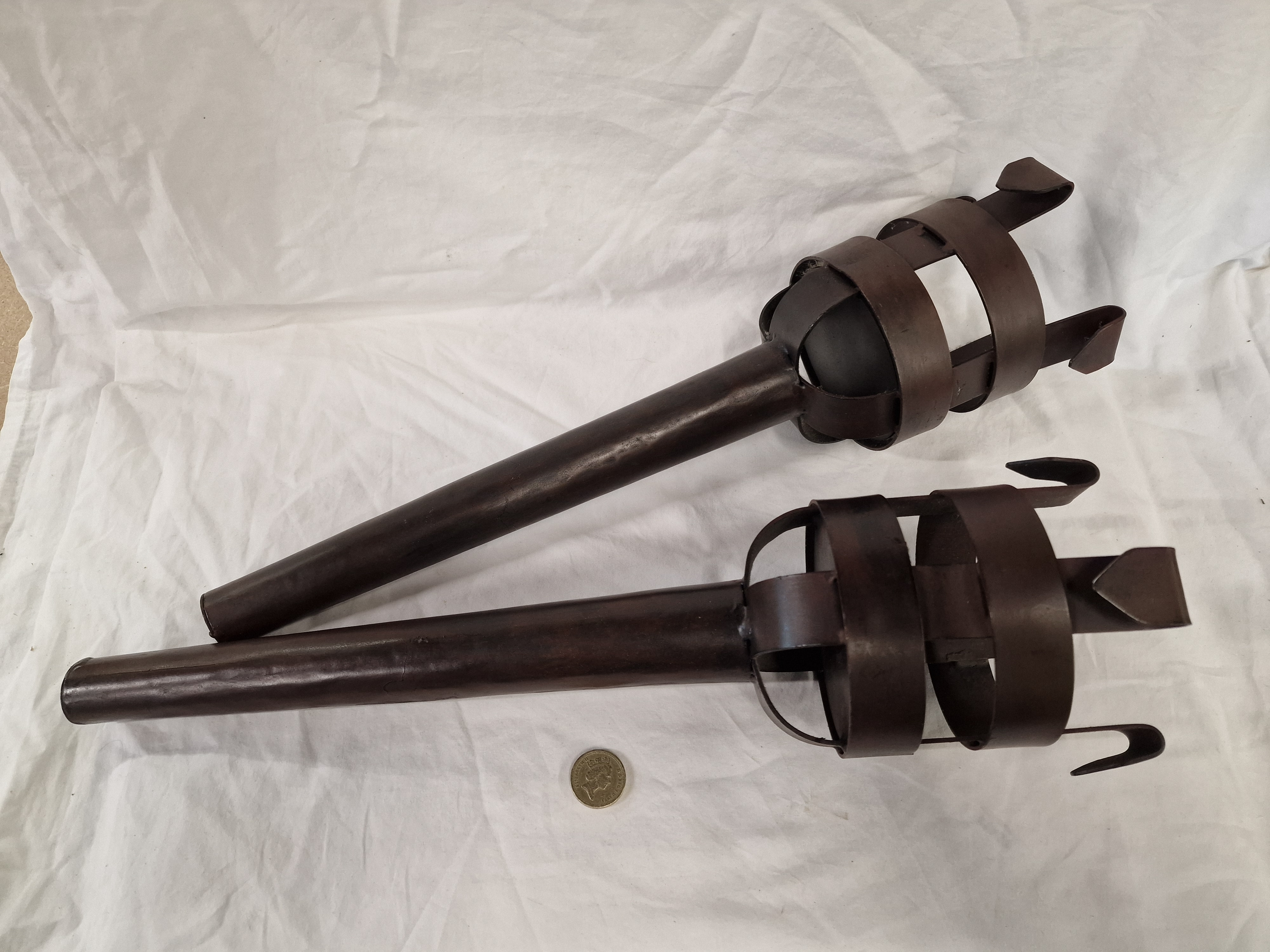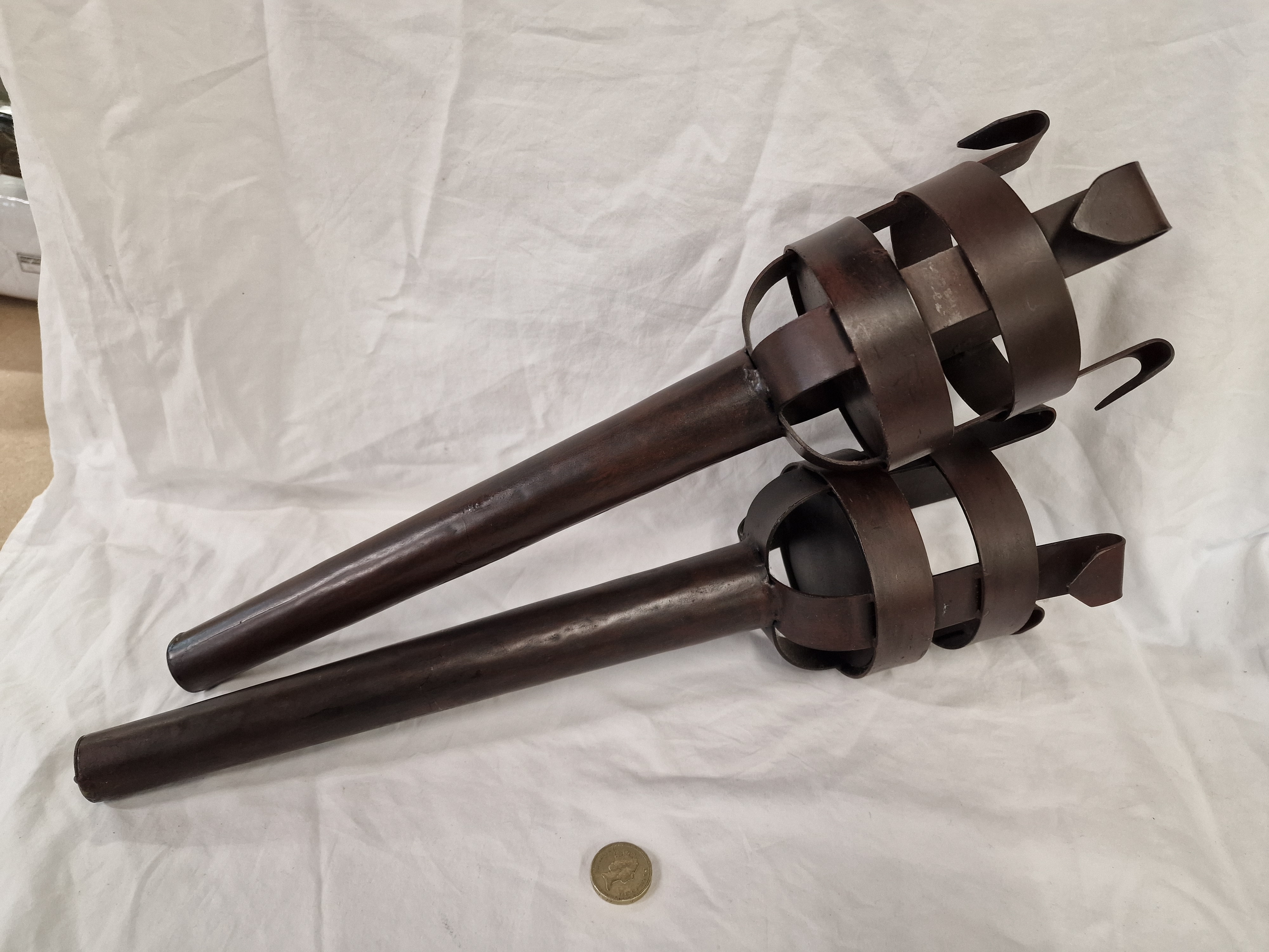 A pair of decorative torches or cressets in the Medieval style, constructed from wrought and welded iron. Each item features a basket-style head composed of three horizontal iron bands and three vertical supports. The vertical members terminate in recurved scroll finials. The heads are welded to long, tapering cylindrical handles. The design is in the Gothic Revival or Medieval style, likely dating from the late 20th century. No maker’s marks or manufacturer’s stamps are visible on the exterior or interior surfaces. A one-pound coin is included in the images for scale.