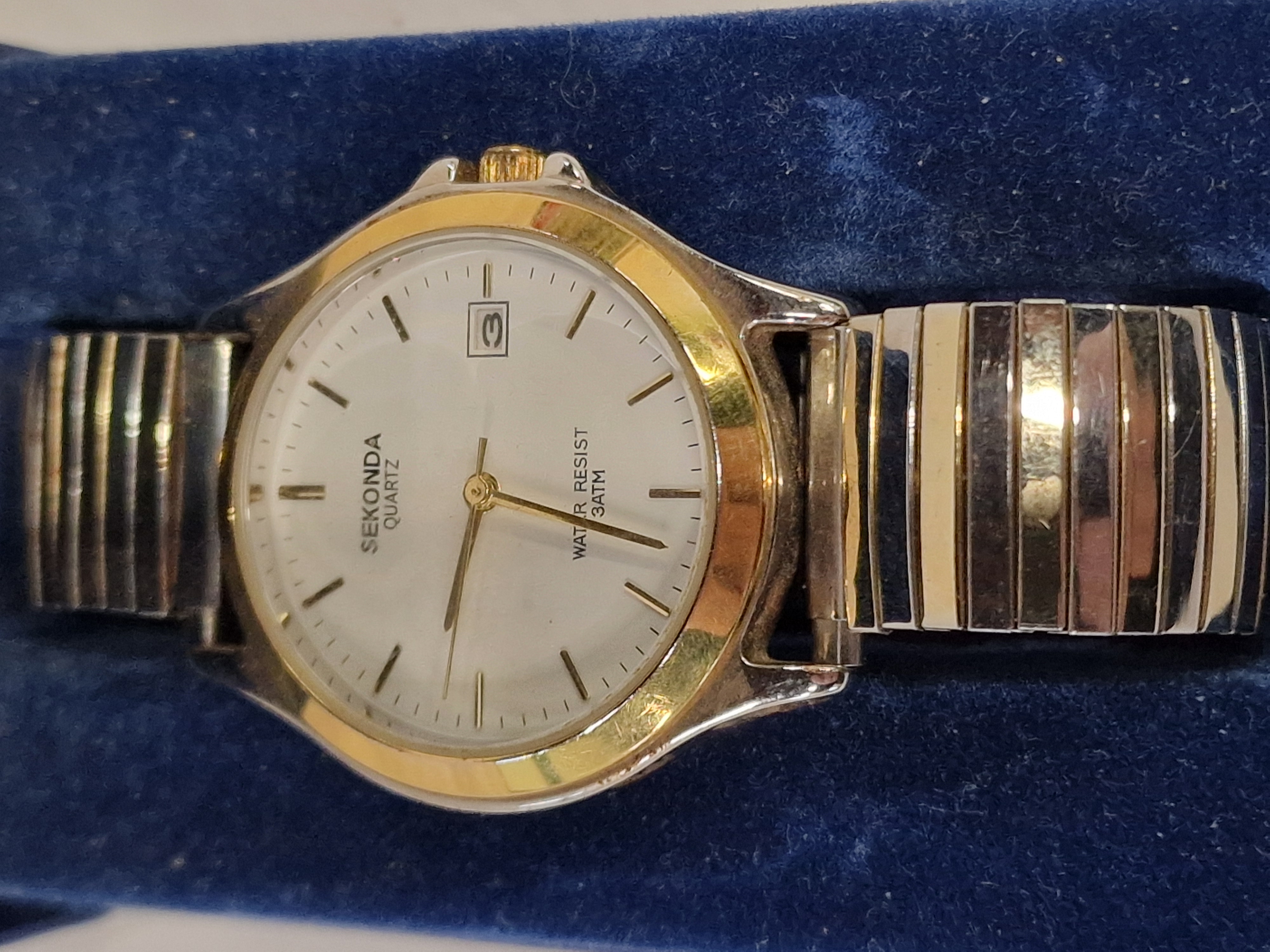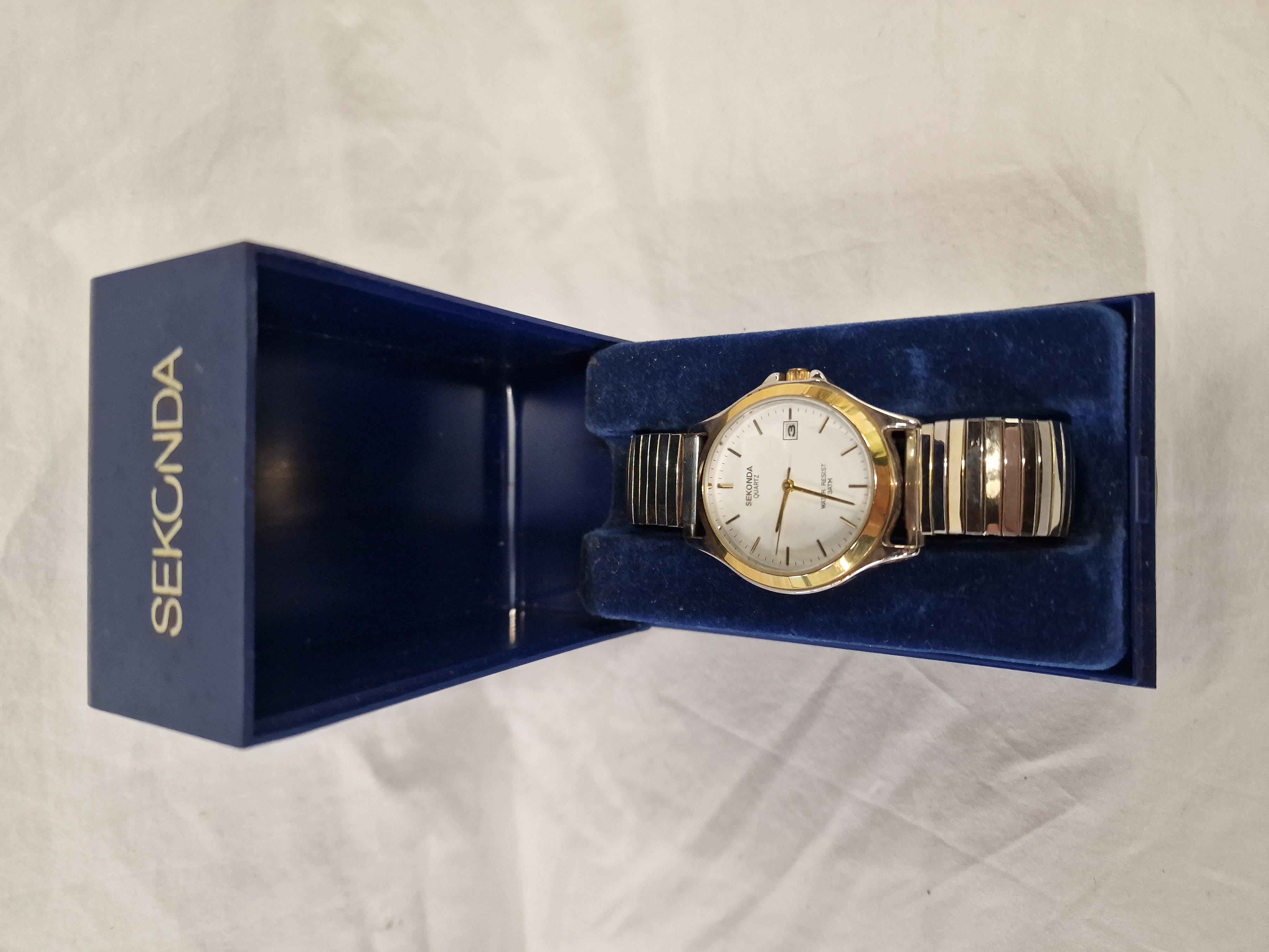 A Sekonda gents quartz wristwatch featuring a white dial with gold-toned baton hour markers, gold-toned hands, and a date aperture at the 3 o’clock position. The dial bears the marks SEKONDA QUARTZ and WATER RESIST 3ATM. The case is constructed from two-tone base metal with a silver-toned body and a gold-toned bezel and crown. The watch is fitted with a two-tone silver and gold-toned expanding metal link bracelet. The item is presented in its original blue Sekonda branded box.