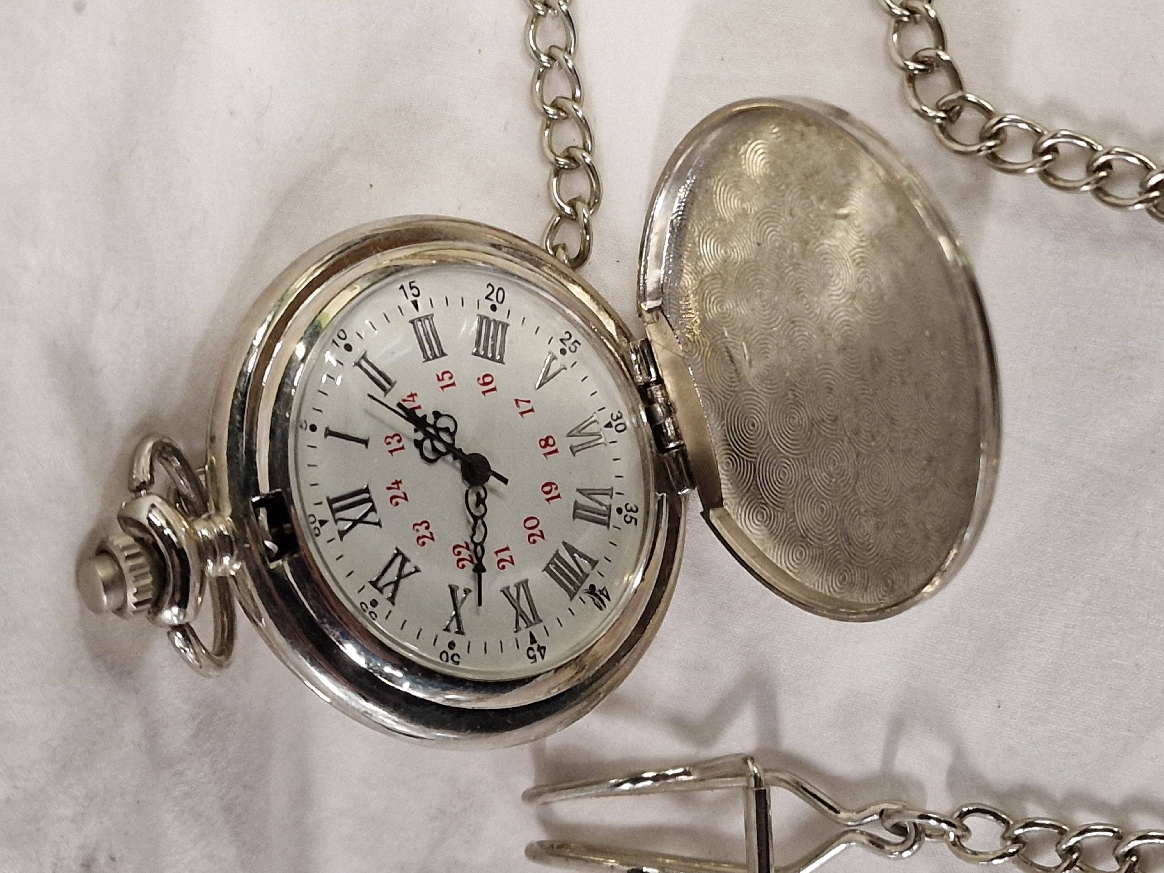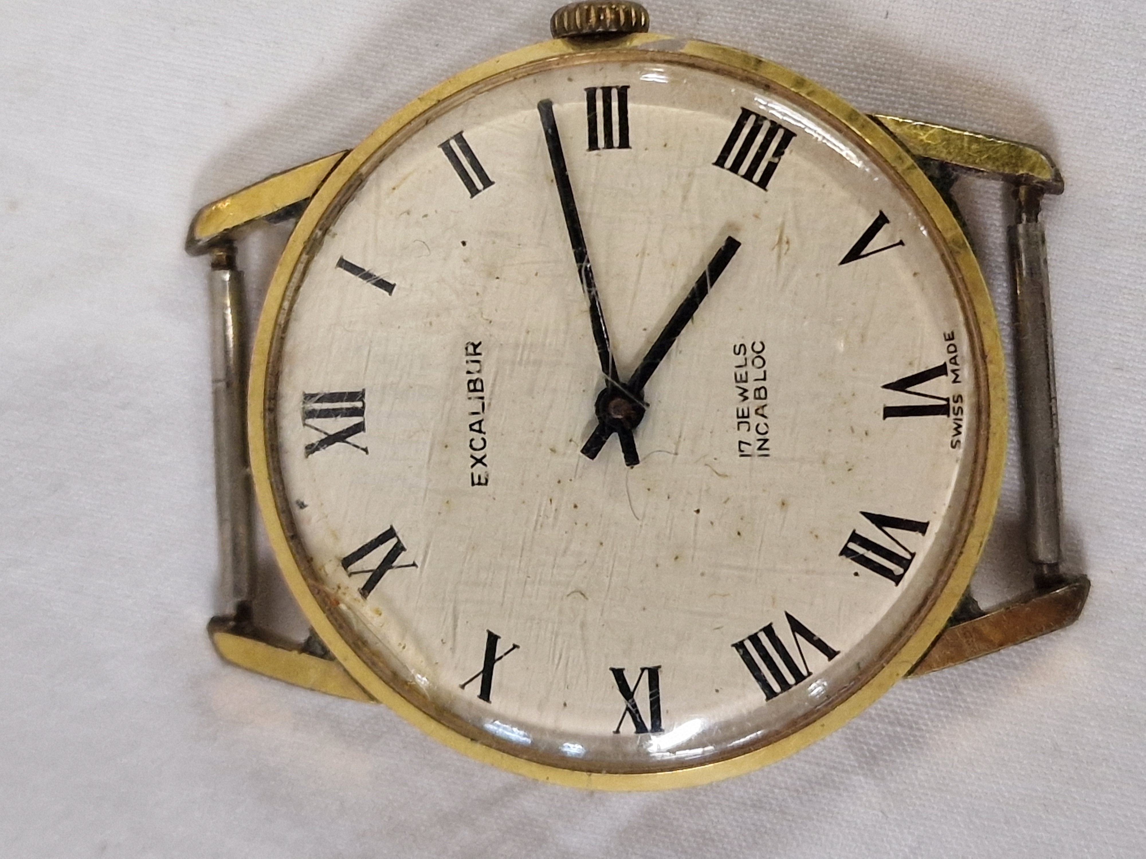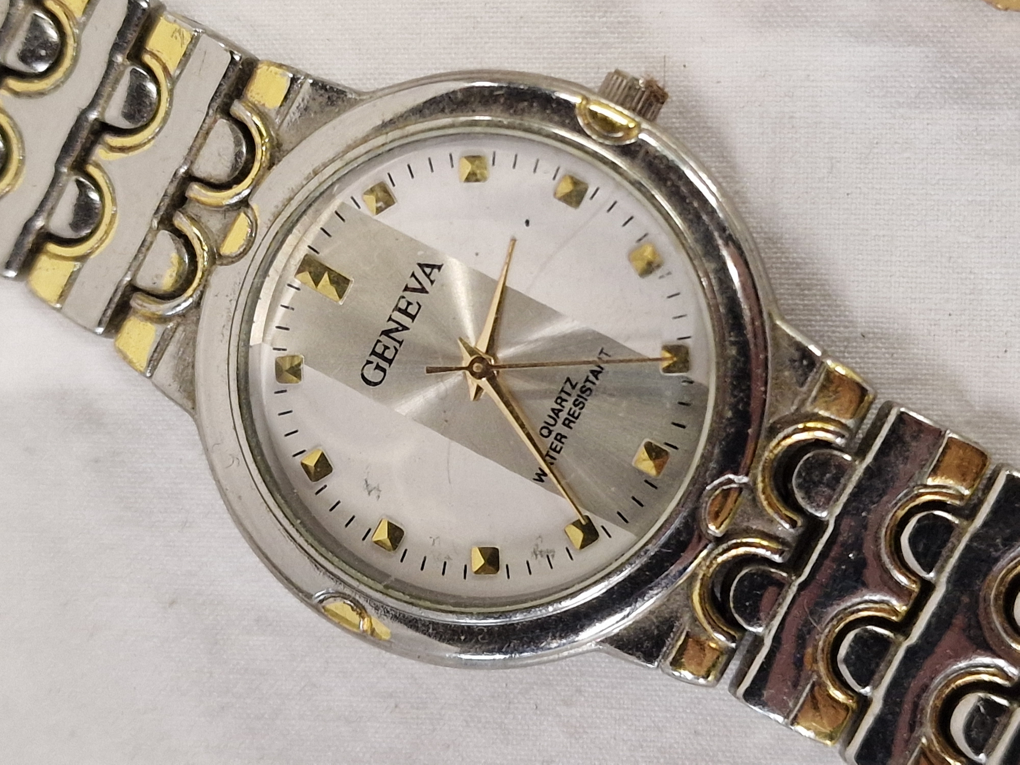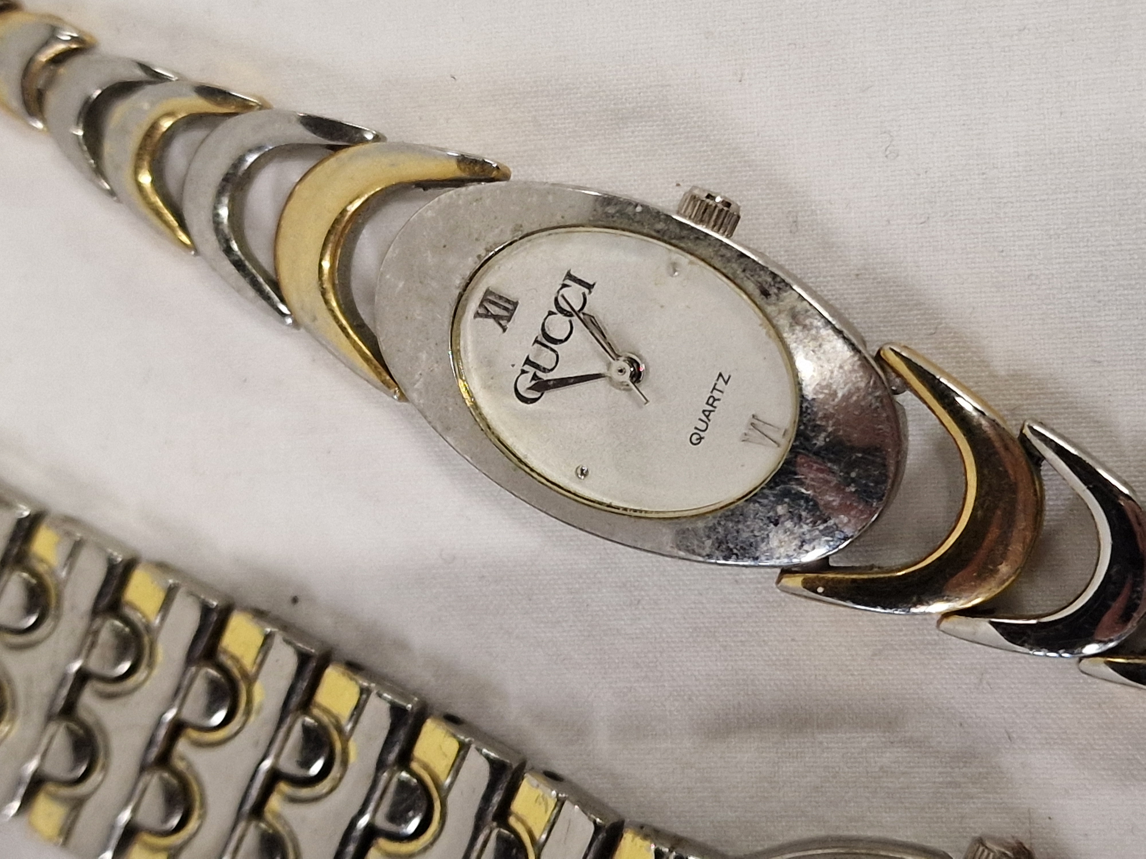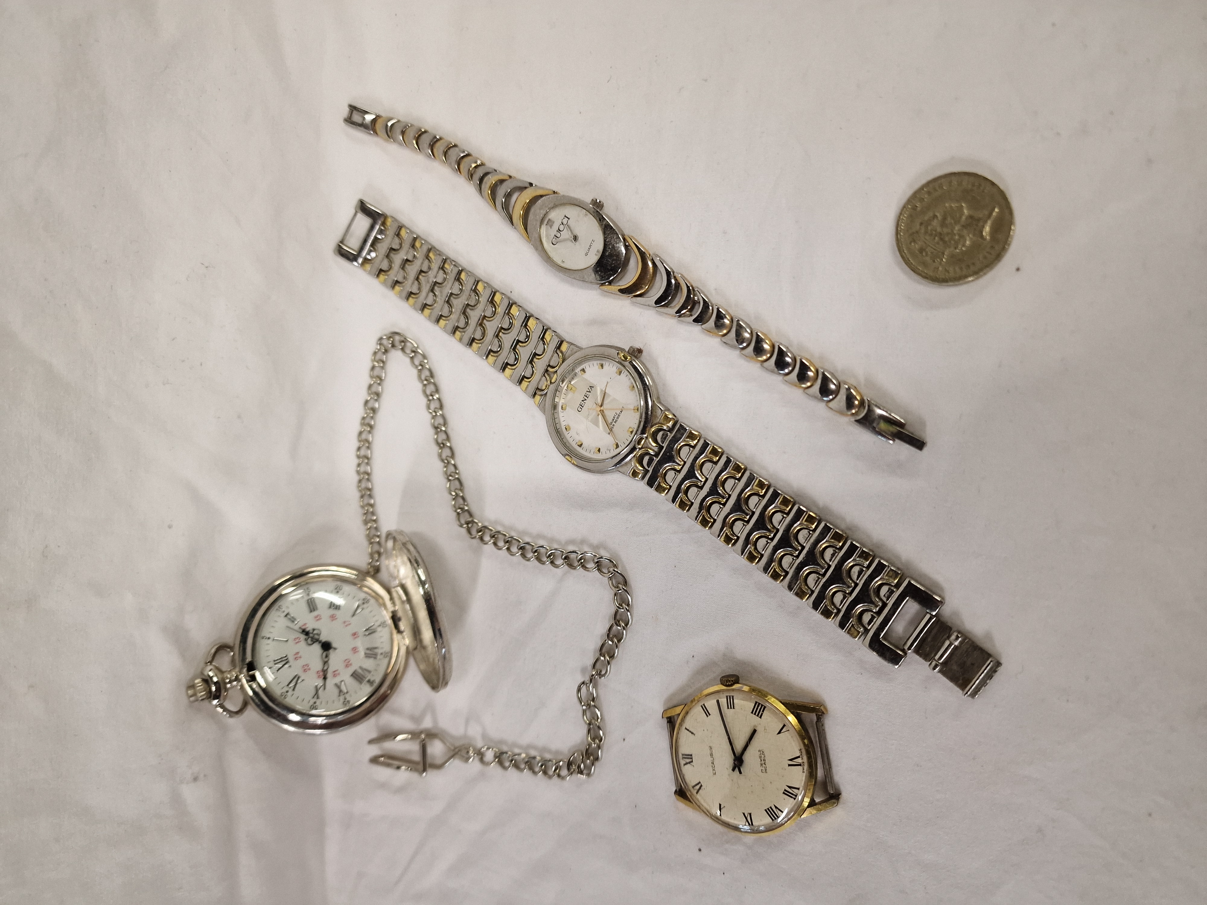 An assortment of timepieces comprising various wristwatches and a pocket watch. Included is a ladies quartz wristwatch bearing the mark Gucci, featuring a two-tone silver and gold-toned metal case with an oval white dial, Roman numerals at the XII and VI positions, and an integrated crescent-link bracelet. Also present is a quartz wristwatch bearing the mark Geneva, featuring a two-tone metal case and bracelet, a silvered sunburst dial with pyramid hour markers, and water resistant marking. The collection further contains a vintage manual wind wristwatch head bearing the mark Excalibur, Swiss made, with a 17 jewel Incabloc movement, gold-toned case, and cream dial with Roman numerals. Completing the assortment is an unbranded hunter-style pocket watch in a silver-toned metal case with an engine-turned interior lid, white dial with Roman and red 24-hour Arabic numerals, decorative filigree hands, and an attached curb link chain.