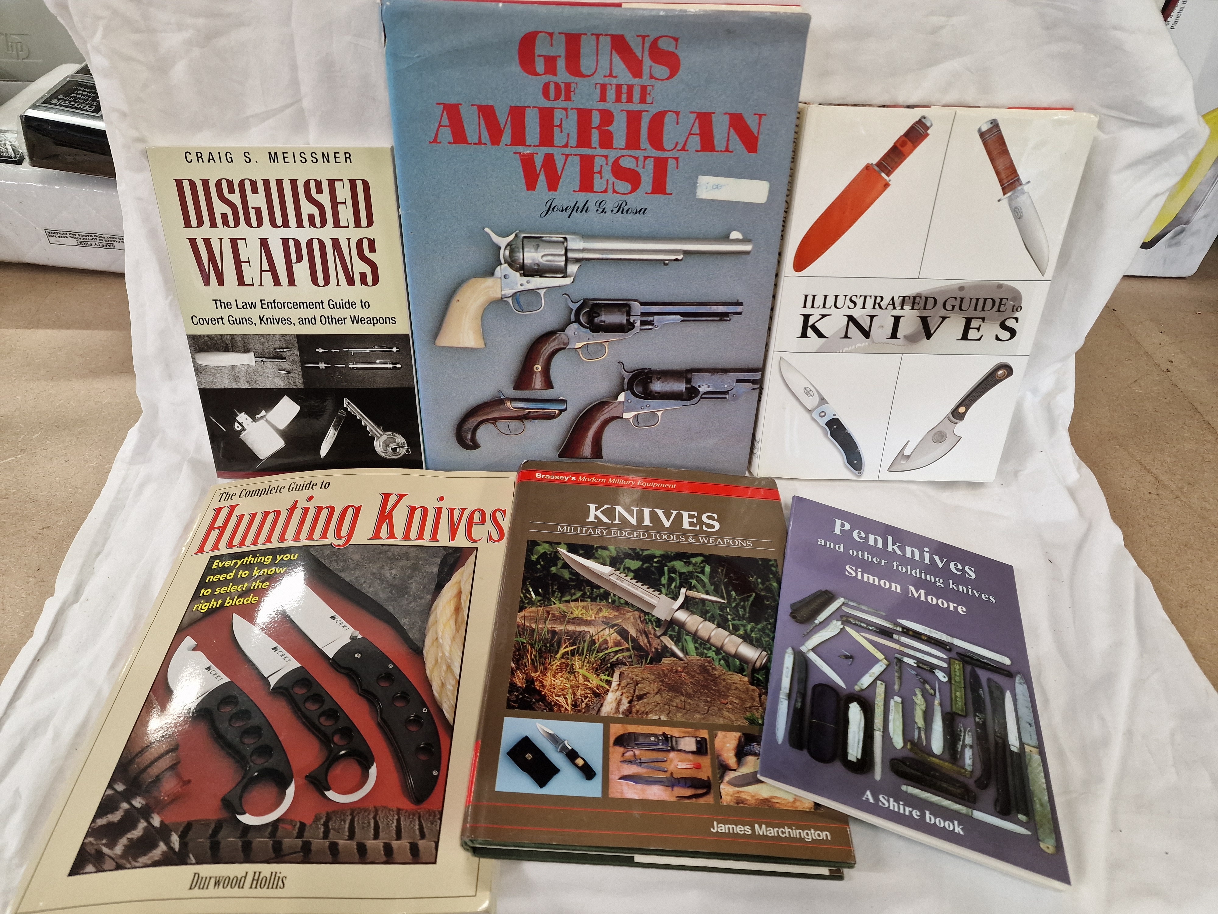 A collection of reference books focused on the history, law, and identification of firearms and edged weapons. The group comprises several volumes in both hardcover and softcover formats, ranging from octavo to quarto in size. The collection includes: Craig S. Meissner, Disguised Weapons: The Law Enforcement Guide to Covert Guns, Knives, and Other Weapons (softcover); Joseph G. Rosa, Guns of the American West (hardcover with dust jacket); Illustrated Guide to Knives (hardcover with dust jacket); Durwood Hollis, The Complete Guide to Hunting Knives: Everything you need to know to select the right blade (softcover); James Marchington, Knives: Military Edged Tools & Weapons, part of the Brassey’s Modern Military Equipment series (hardcover); and Simon Moore, Penknives and other folding knives, a Shire book (softcover).