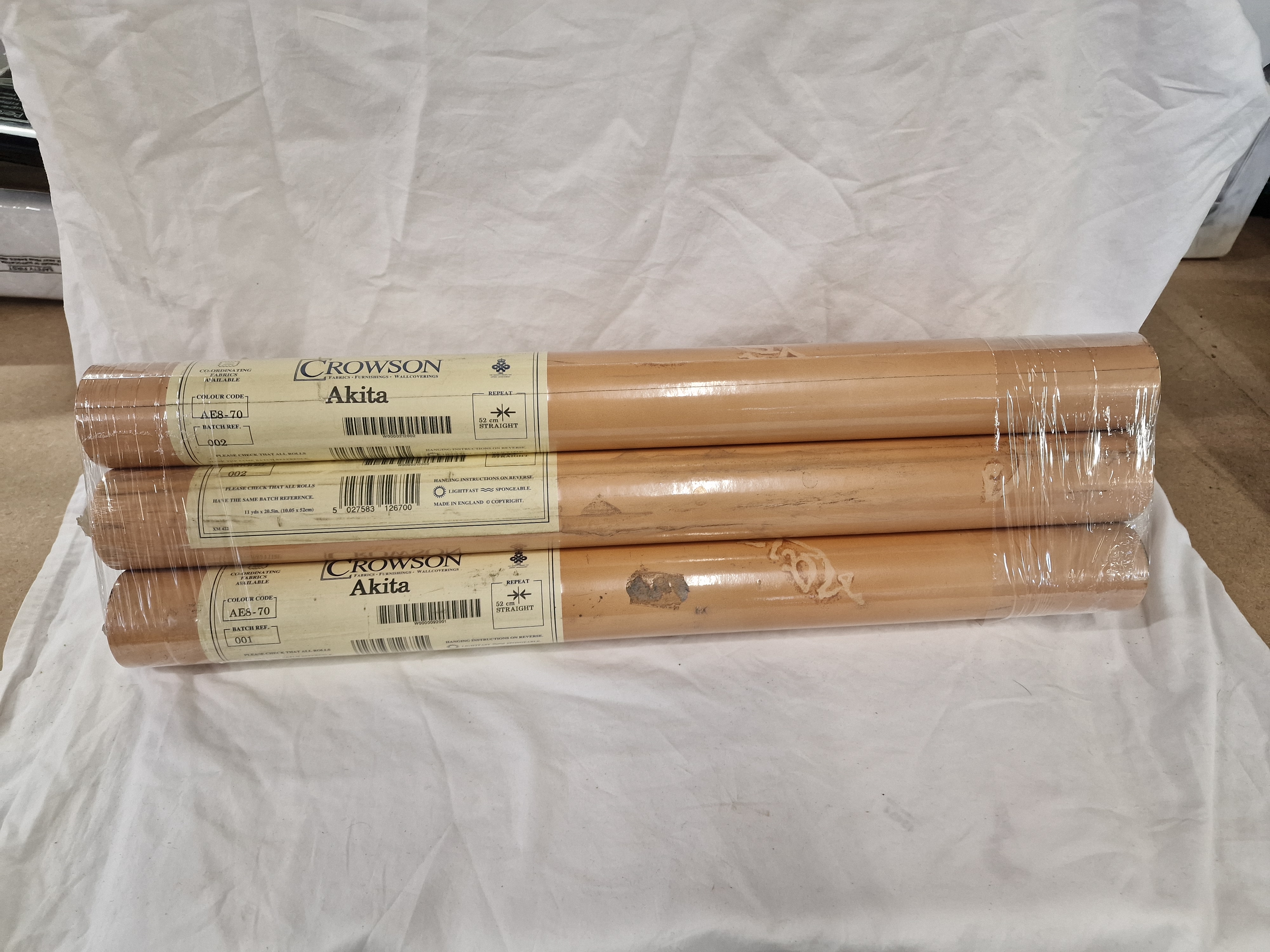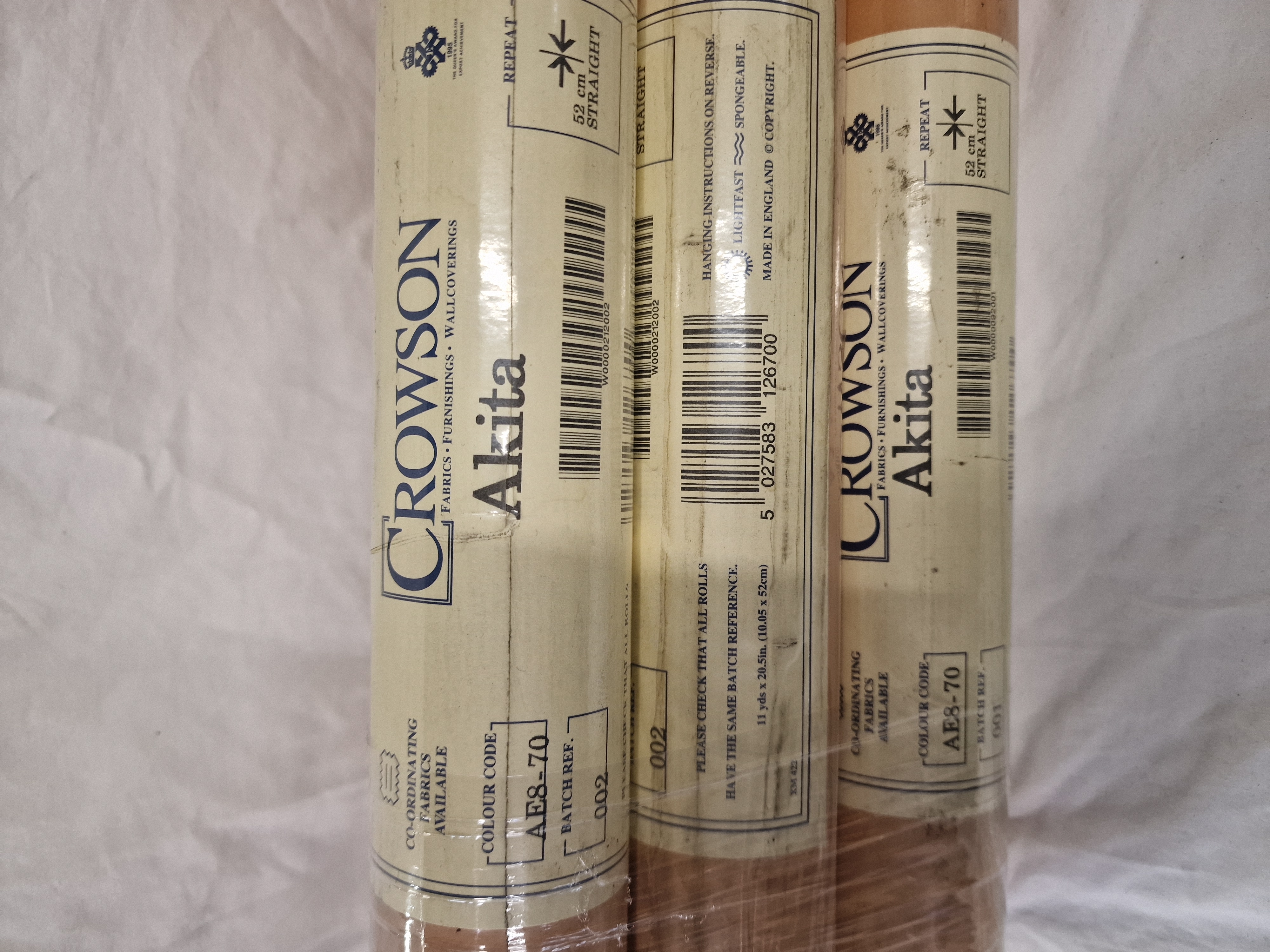 A lot consisting of six rolls of Crowson wallcoverings in the Akita pattern, identified by colour code AE8-70. The rolls are manufactured in England and feature a 52cm straight pattern repeat. Label specifications indicate the product is lightfast and spongeable. The lot includes rolls from batch references 001 and 002. Each roll is individually plastic-wrapped and the group is shrink-wrapped together.