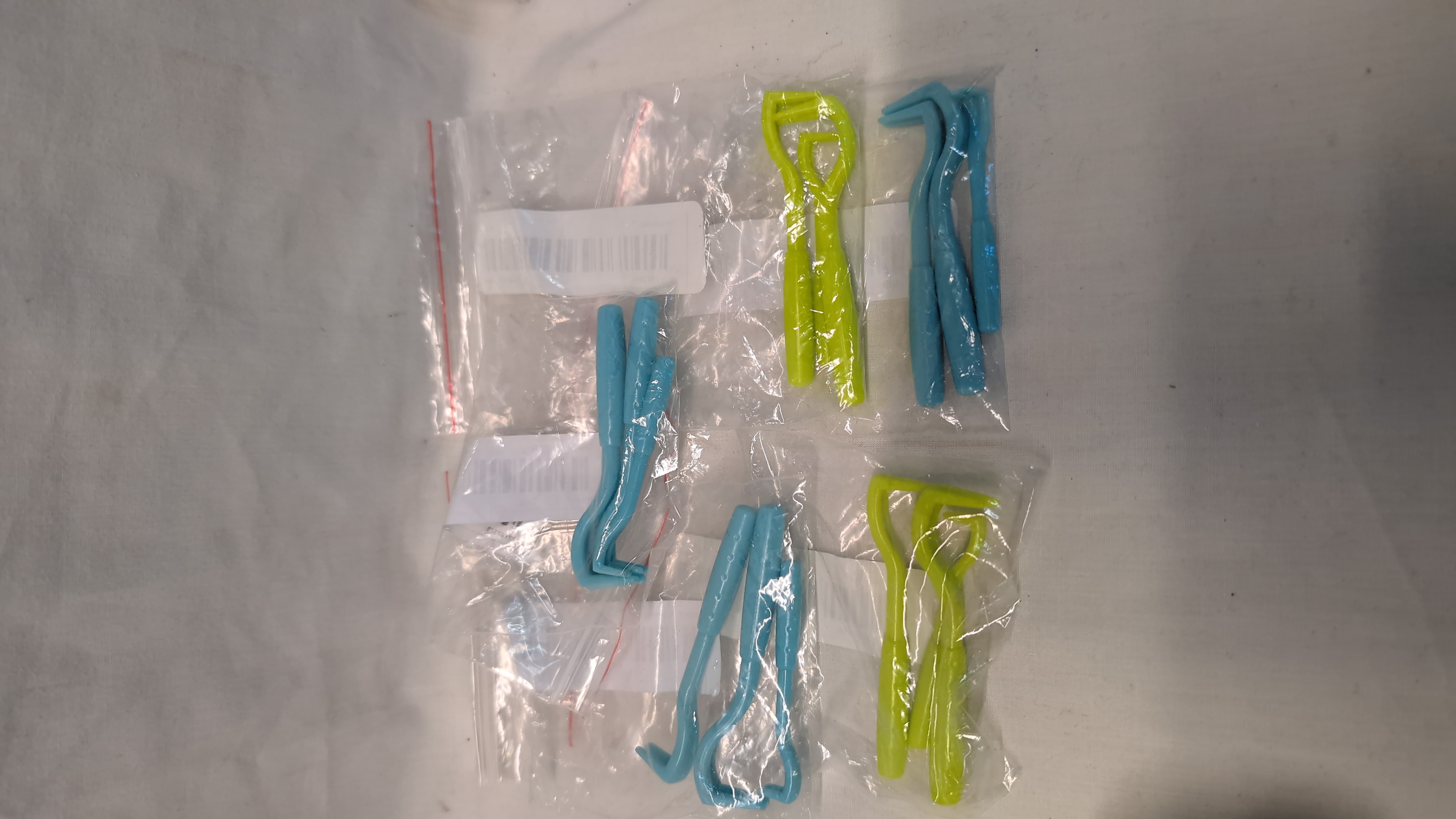 A collection of plastic tick removal tools in graduated sizes, designed for the extraction of ticks from skin or fur. The lot features tools in neon green and light blue plastic colours. Each tool is formed with a hooked, notched tip for gripping. The items are contained within several clear, re-sealable plastic bags, some of which display white adhesive labels with barcodes. One additional empty bag with a label is also included. No manufacturer names or brand markings are present.