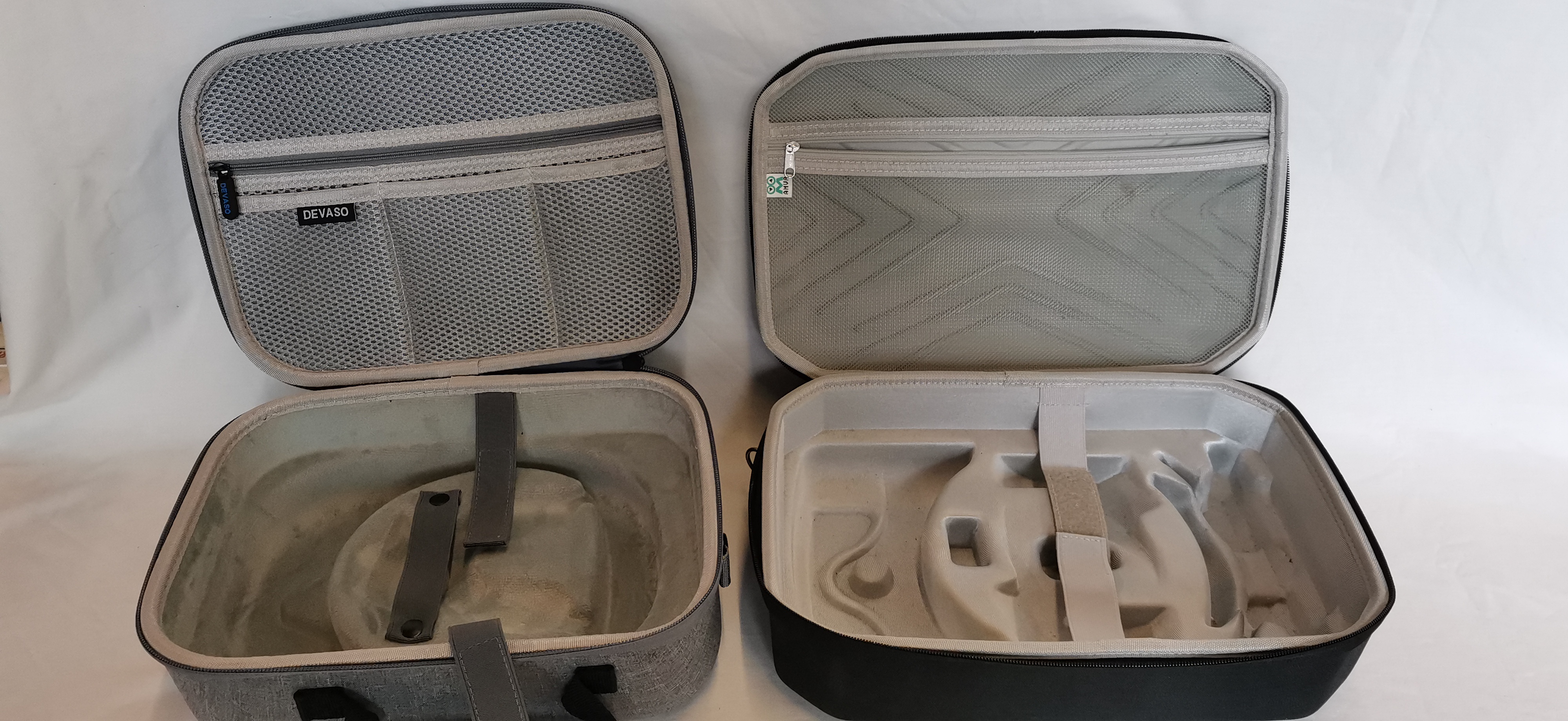 Two modern protective carrying cases designed for electronic equipment, such as drones or headsets. The first case is finished in a grey marl fabric and features a grey moulded interior with elasticated security straps. The lid contains multiple mesh storage compartments. This case bears the DEVASO mark on an interior fabric tag and the zipper pull. The second case is finished in black and contains a custom-moulded interior with a hook-and-loop security strap and a zippered mesh pocket within the lid. This case bears the AMUR mark on a small green interior tag. Both items are equipped with integrated carrying handles and zip-around closures.