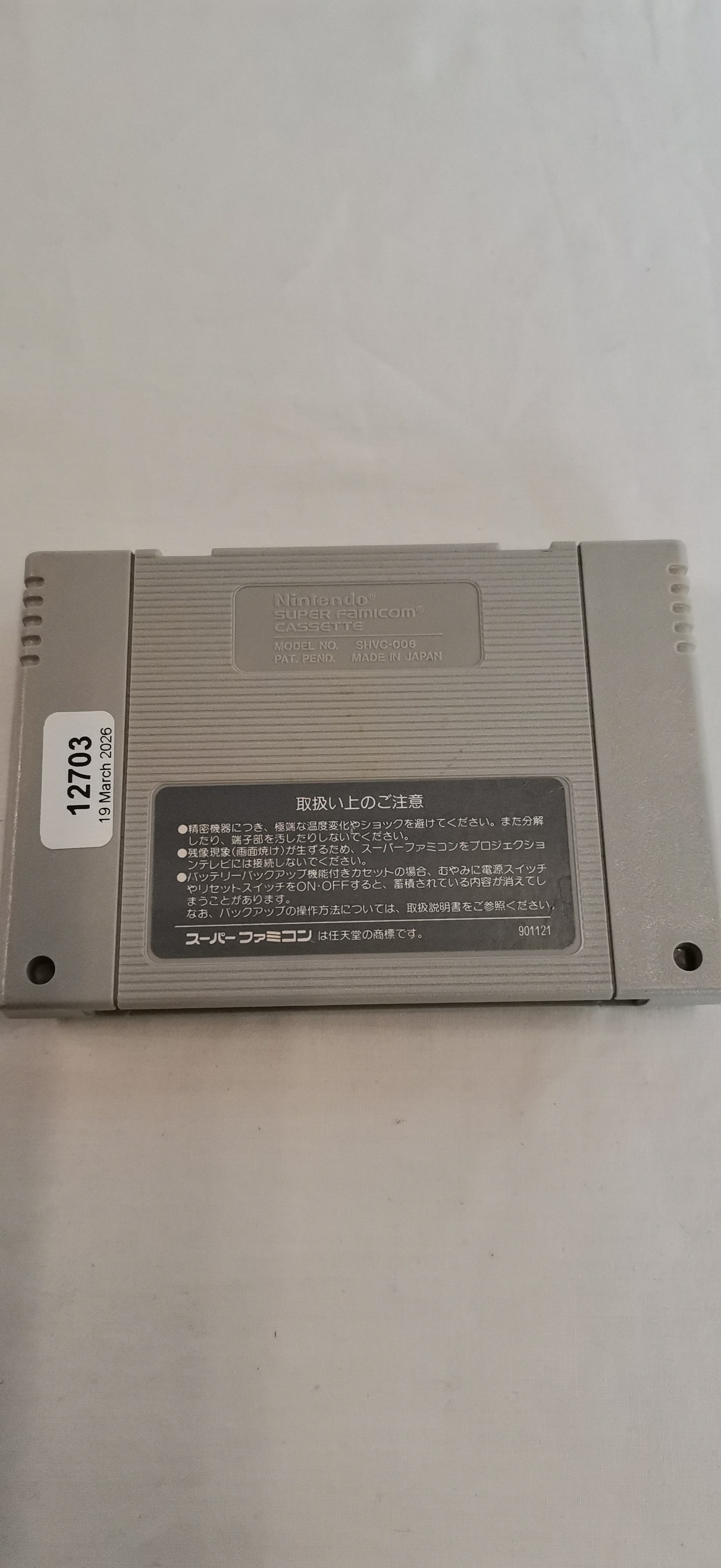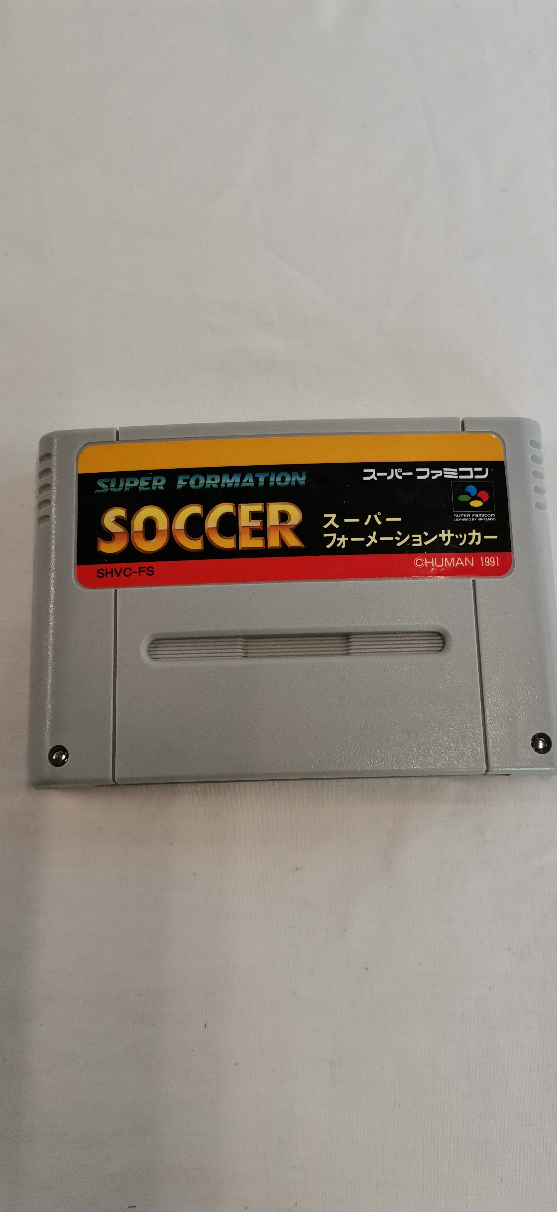 Super Formation Soccer for the Nintendo Super Famicom, published by Human in 1991. This Japanese NTSC-J region video game cartridge is constructed from grey plastic with applied paper labels. The front label features the game title in English and Japanese text, the model code SHVC-FS, and the copyright notice © HUMAN 1991. The reverse of the casing is moulded with the Nintendo and Super Famicom logos, model number SHVC-006, and Made in Japan. A secondary paper label on the reverse contains Japanese safety instructions and the reference number 901121. This is a loose cartridge; the original box and manual are not present. As an NTSC-J region product, this software may require a Japanese console or a regional bypass adapter to function on PAL or NTSC-U hardware. Functional testing has not been performed.