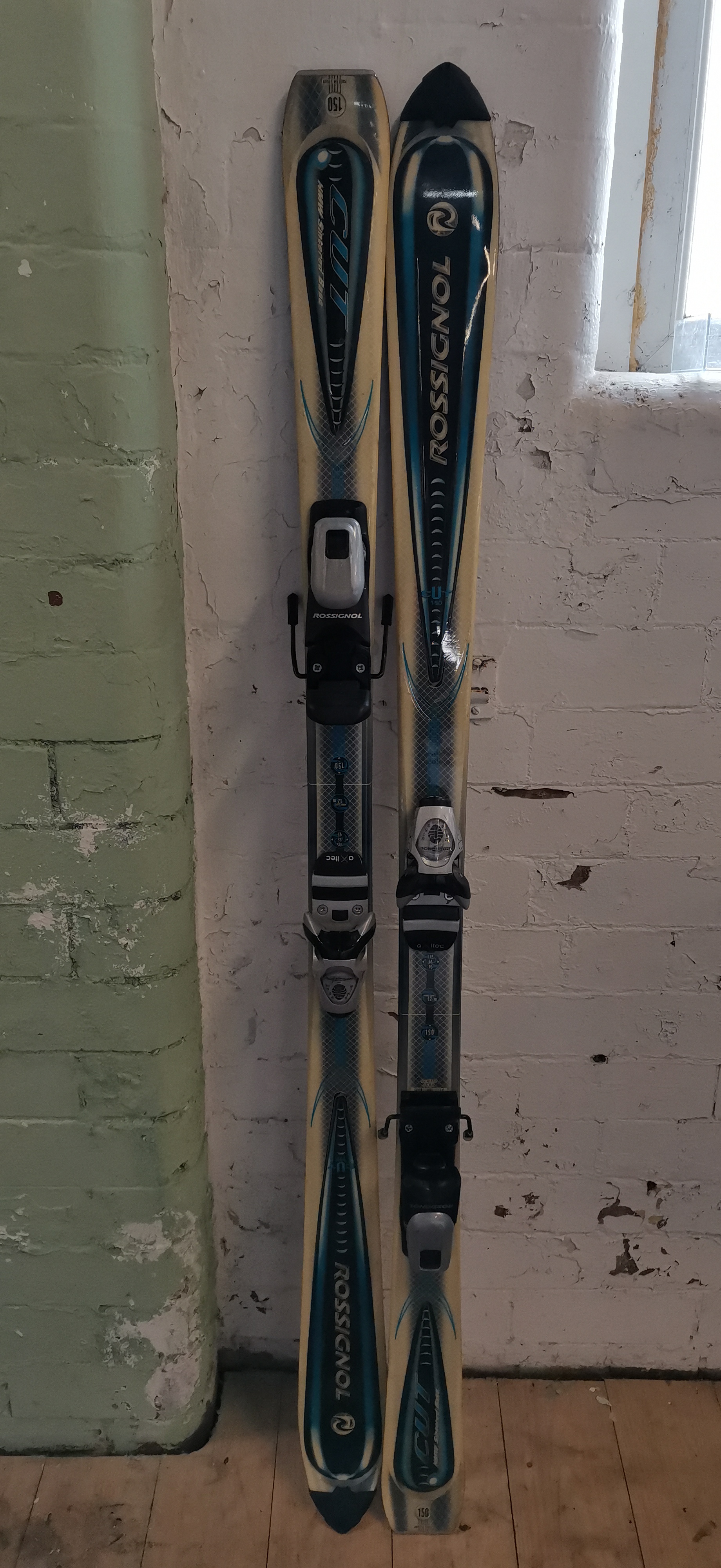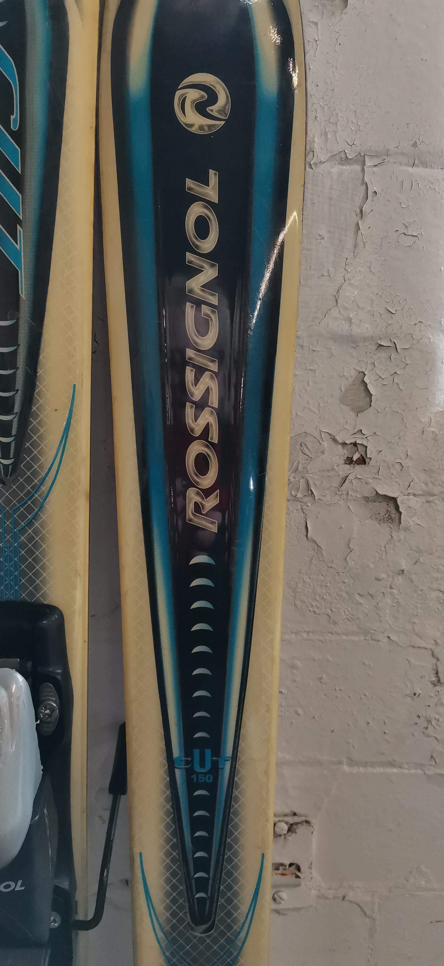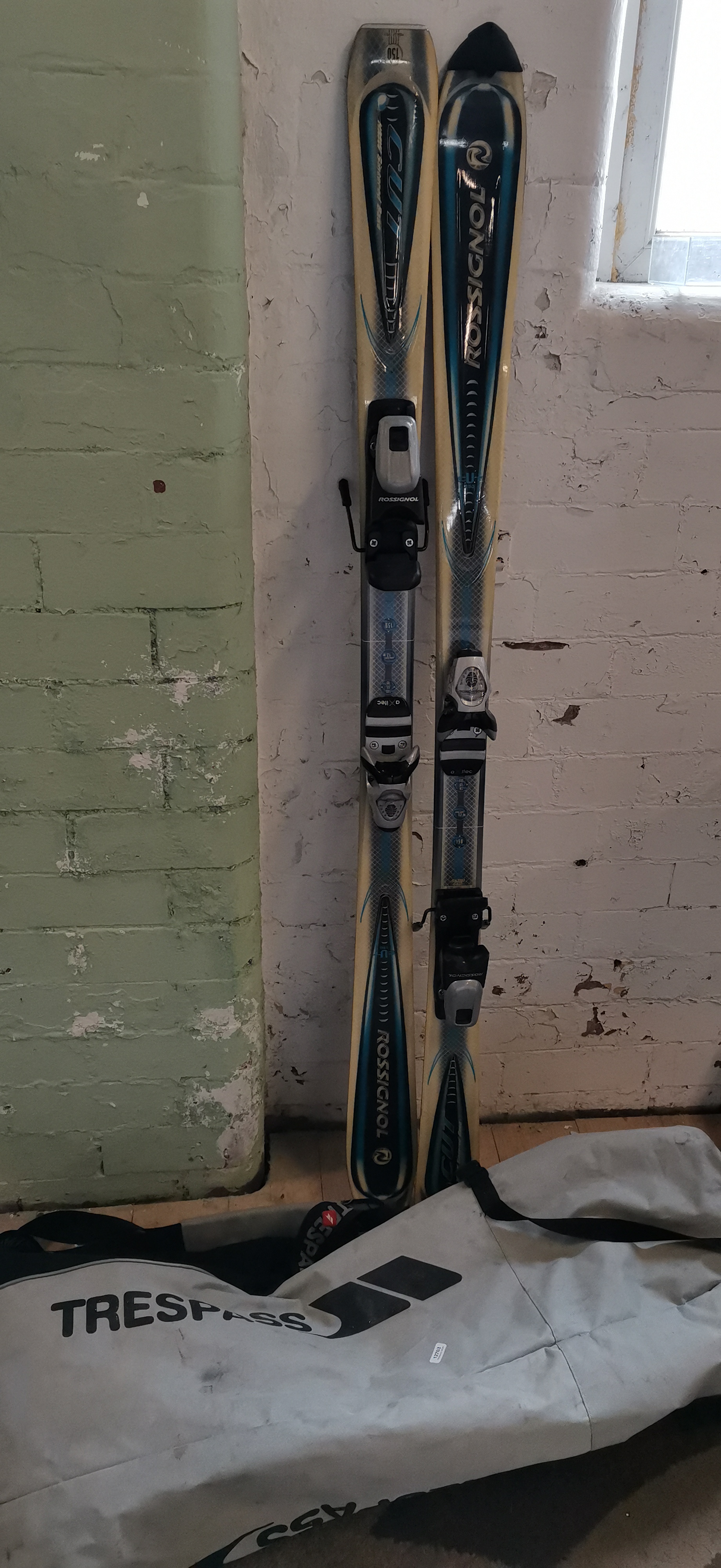 A pair of Rossignol Cut downhill skis featuring a blue, grey, and cream graphic design. The topsheets and integrated Axitec bindings bear the Rossignol brand mark. The model name Cut and the length 150 are printed on the topsheets. Technical specifications transcribed from the equipment include a sidecut of 105/65/95 and a turning radius of 12m. The skis are accompanied by a grey and black soft-sided carry bag bearing the Trespass brand mark.